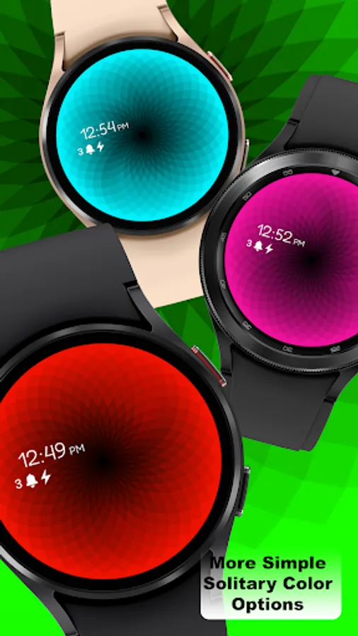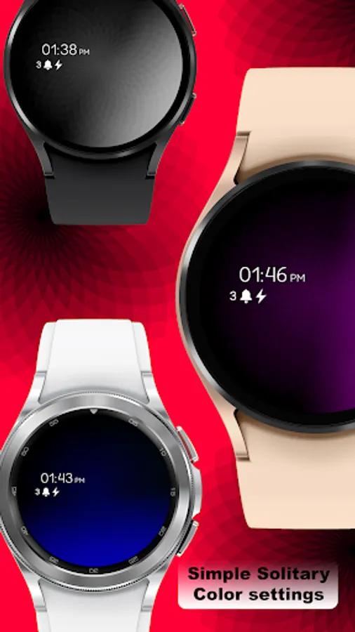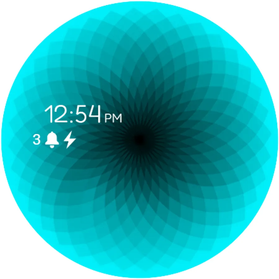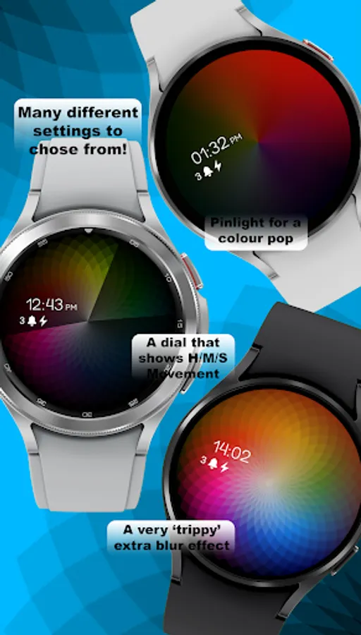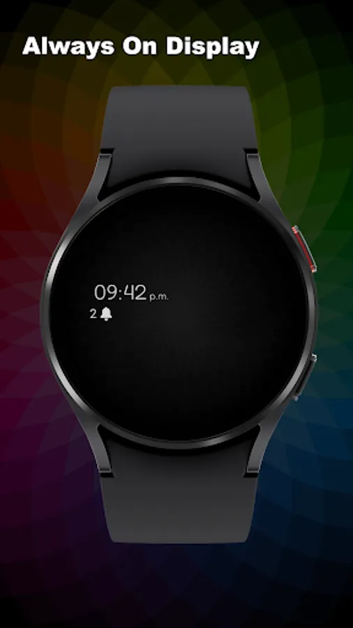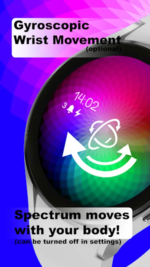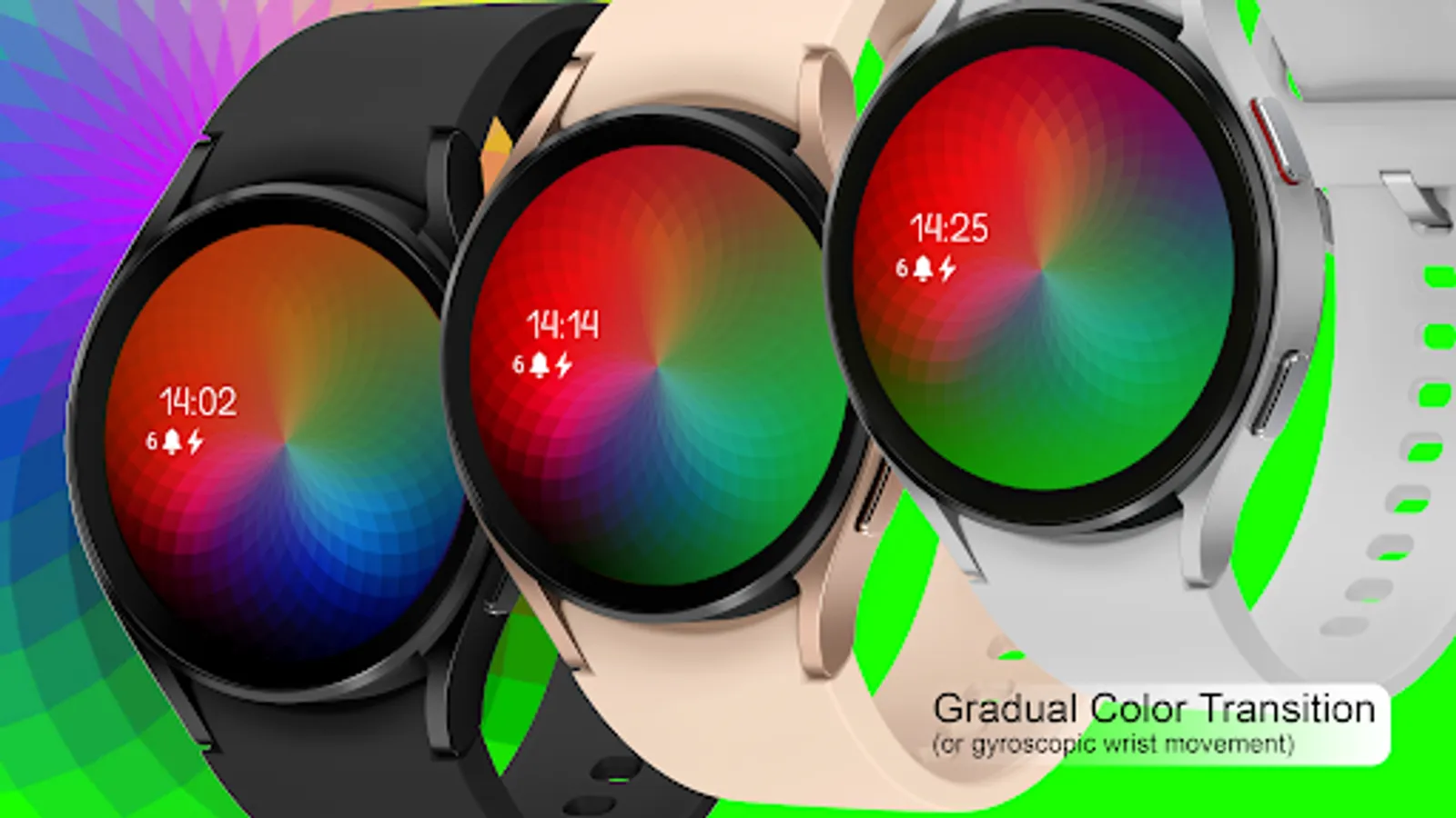 Eye-catchingly designed with a simple spectrum of color effect that offers both a gyroscopic wrist-movement, or a slow and steady transition. This watch face is both fashion and functional.