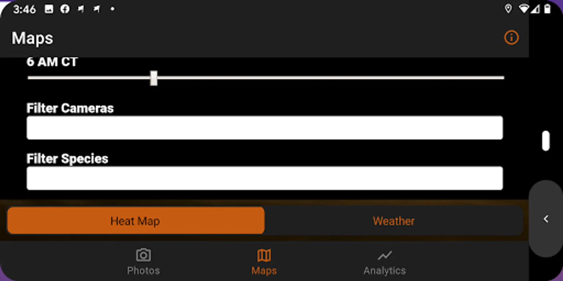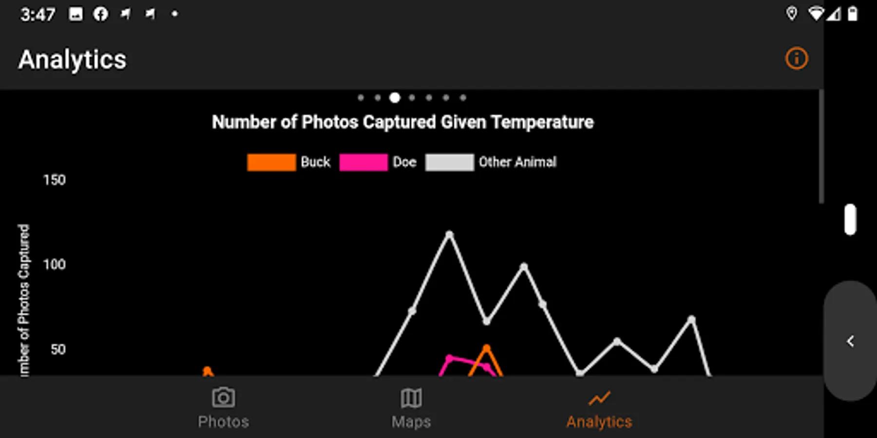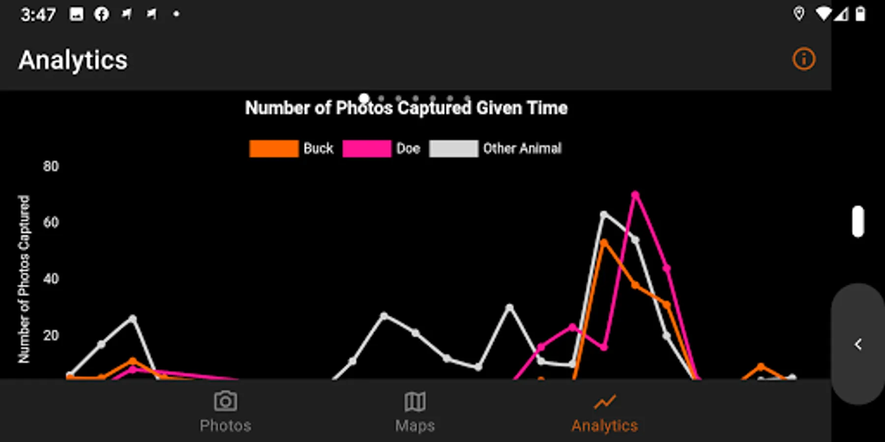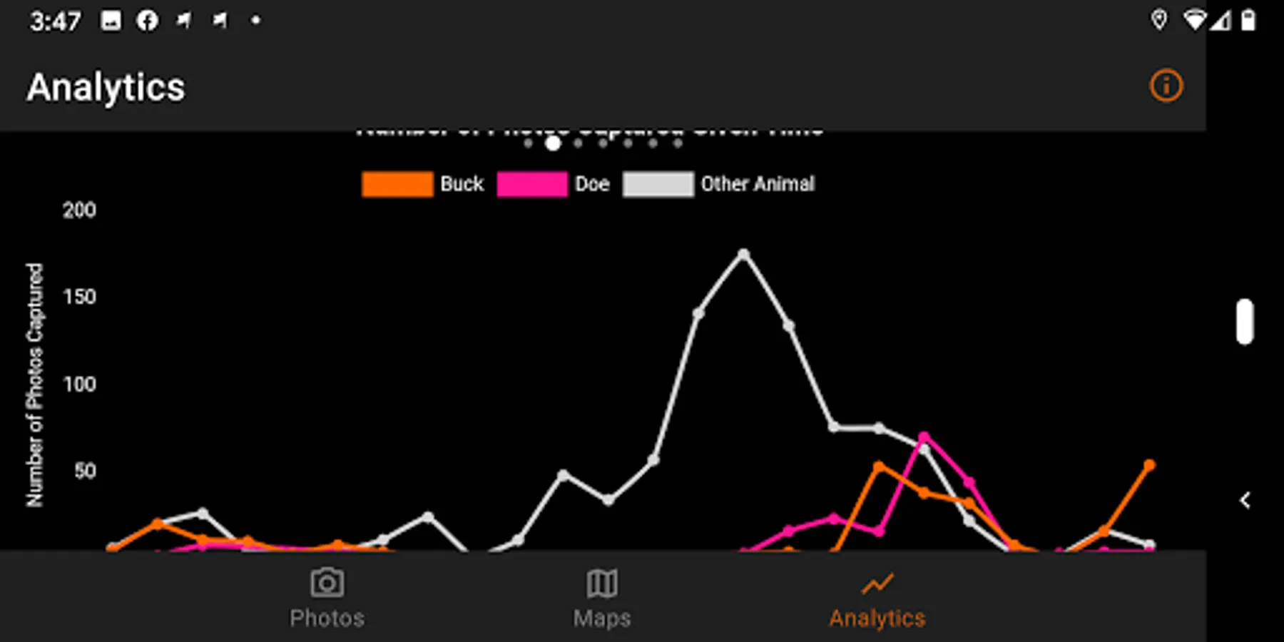 A paid subscription includes access to hunting insights and analytics in the form of Heat Maps, Home Range Maps, Weather Visualizations, and a variety of Charts depicting animal movement based on imported trail camera photos and associated metadata.