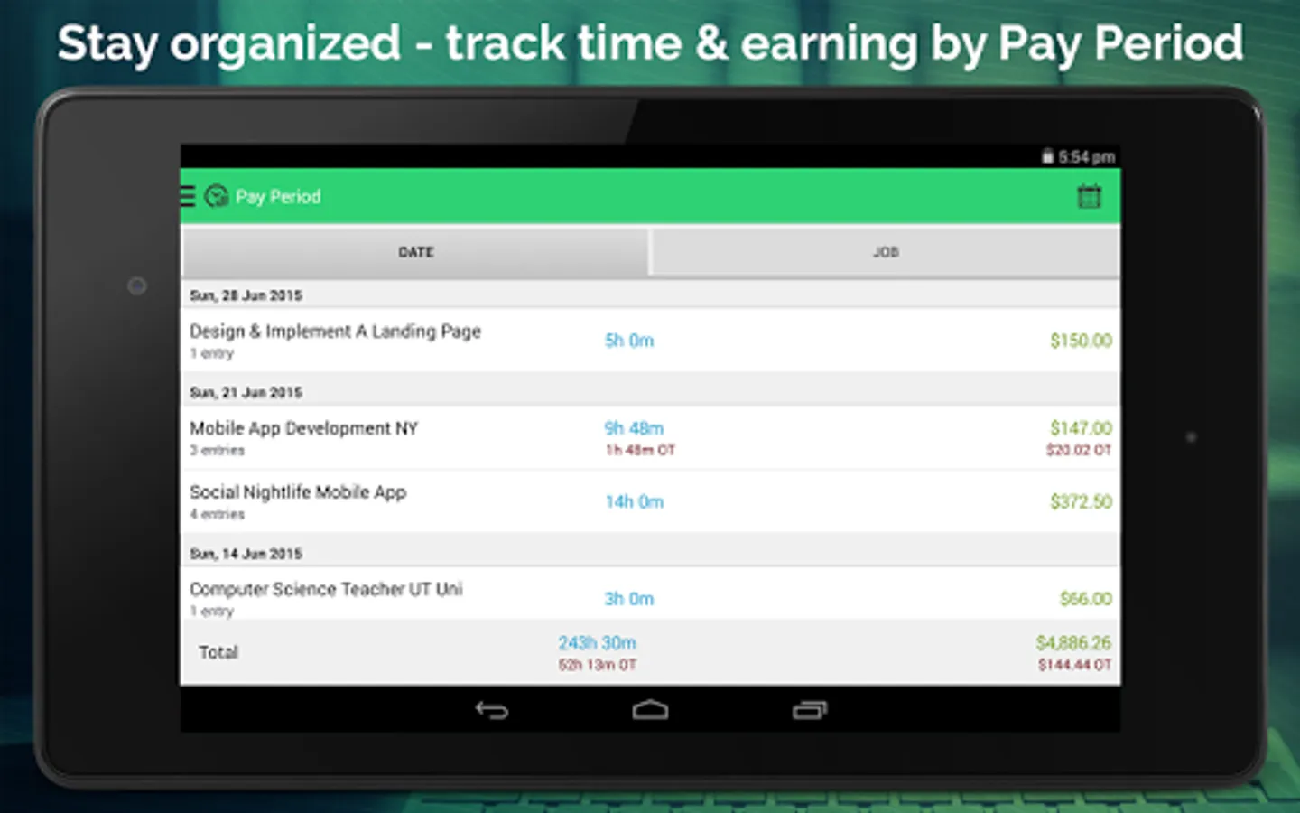• Organize pay period and track your time by weekly, bi-weekly, monthly, quarterly or yearly on the Pay Periods section