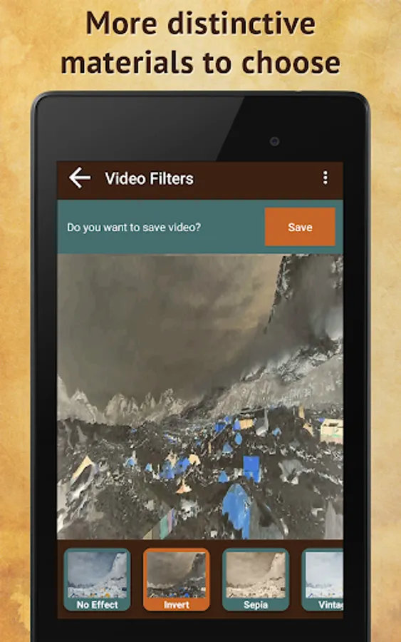 • More than 20 effects in total: Invert, Sepia, Vintage, Black & White, Cross Process, Posterize, Swap UV, Channel Mix, Snow, Oil Paint, Emboss, Solarize, Circle, Pixelate, Bump and others