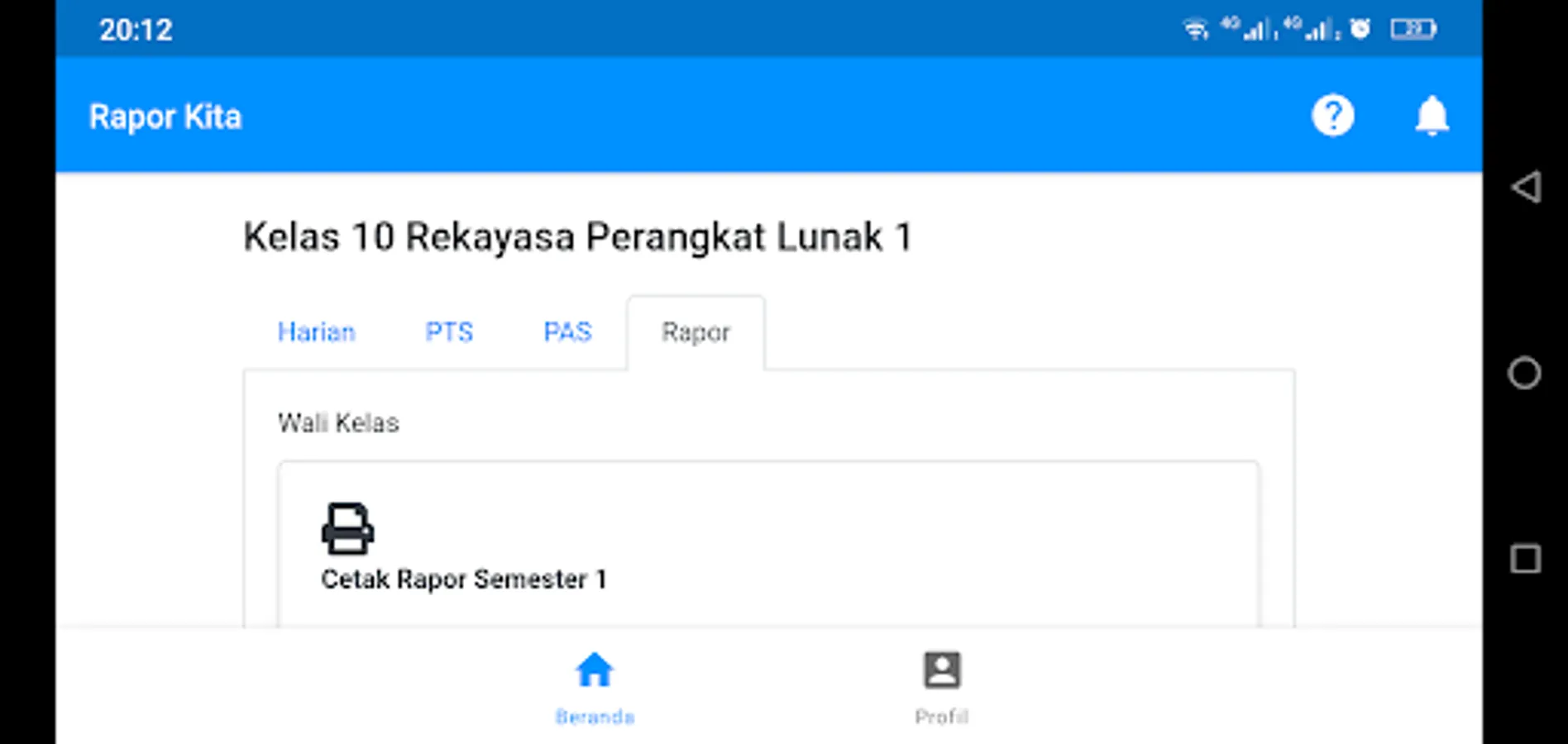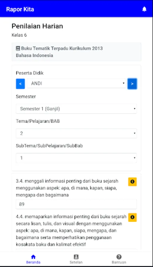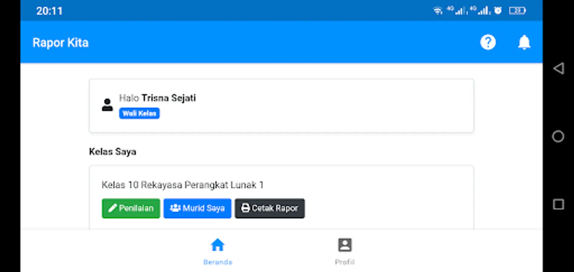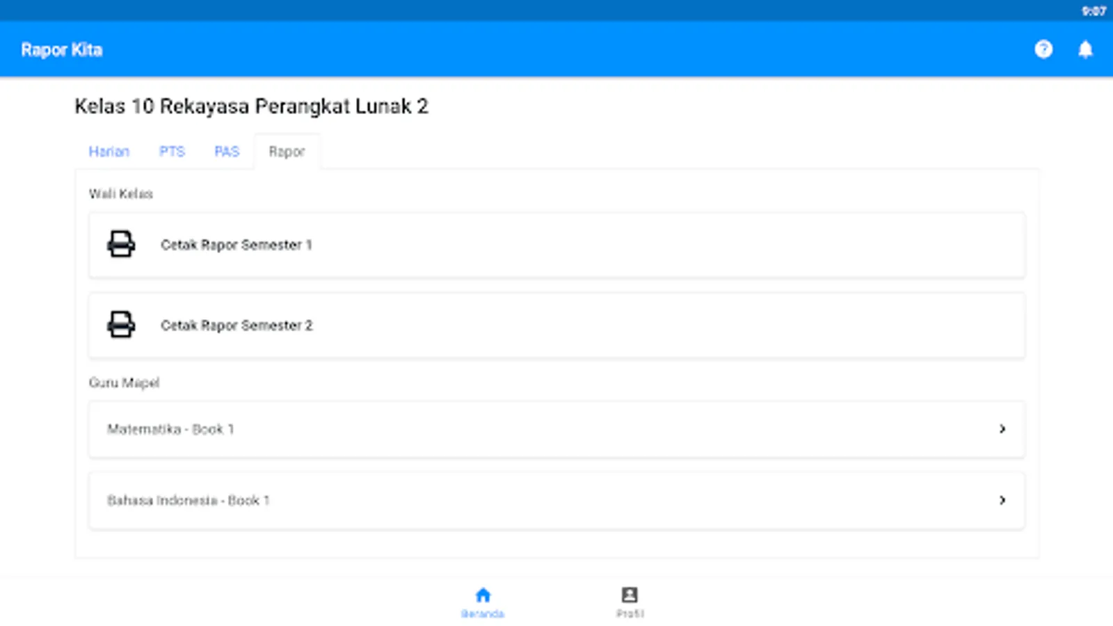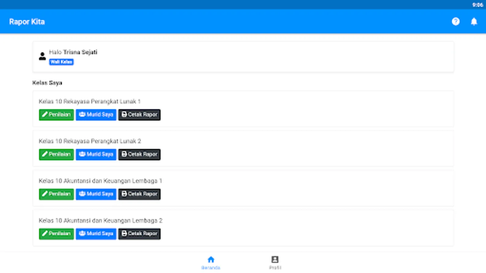 RaporKita is an application for assessing student report cards based on the 2013 Curriculum for SD/MI, SMP/MTs, SMA/MA/SMK, used as a teacher companion in teaching and filling in student scores so that it automatically produces K13-based report cards that can be printed directly or downloaded.