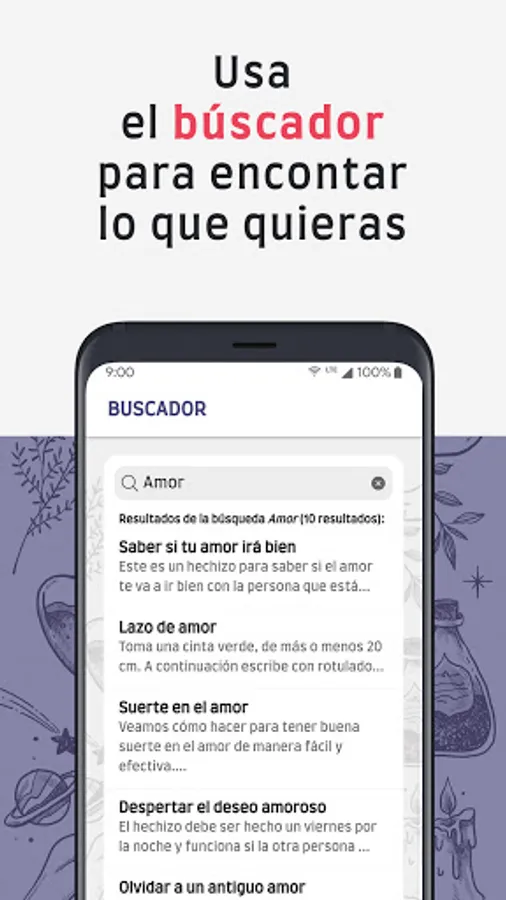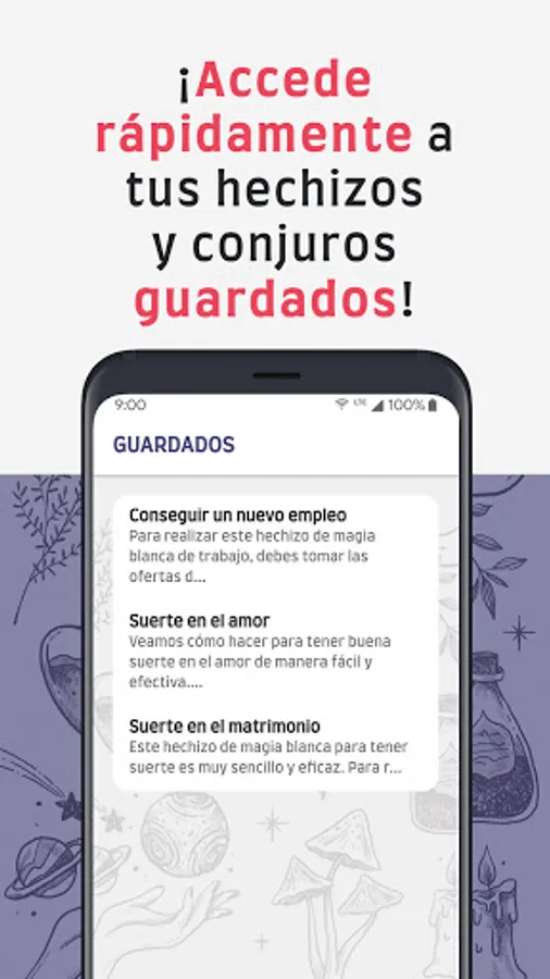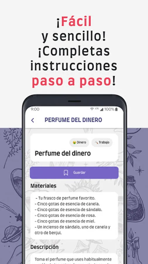 ✔️ Each of the spells, magic words and sentences has a detailed file where you will find the essential materials (In case the spell needs them) and a complete description with the instructions with the steps to carry them out . You can also mark it as saved and access more quickly from the home page!