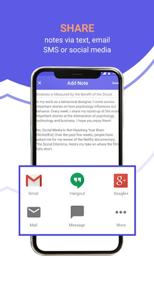 Share as a text in your SMS, email, social media, etc. Share your notes with friends, family or co-workers by simply using the share option. You can share your note as an SMS text, email or a social media attachment.