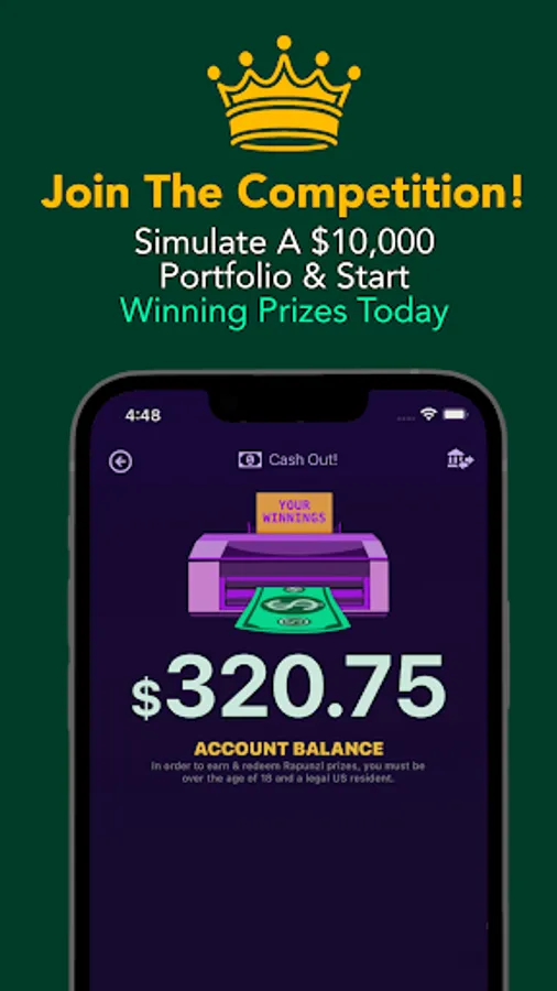 You represent & warrant that you are at least 18 years of age. In locations where the minimum age for permissible use of Rapunzl is greater than 18 years of age, you represent & warrant that you meet the age requirement for the minimum age for permissible use of the Rapunzl App and Rapunzl’s Investing Simulator. If you are over the age of 18 and not a legal & valid US resident, you are not eligible to receive any of the competition prizes offered on the free Rapunzl simulated trading app. Rapunzl simulated investing competitions are not associated with financial services firms, trading apps, or social investing platforms. Rapunzl is not a registered investment advisor or broker-dealer. Although Rapunzl is a simulated investing app, we do NOT provide investment advice or solicit investments of any kind, including for stocks or anything related to stock market investing. NO CONTENT shared by Rapunzl or disseminated through Rapunzl’s stock simulator should be considered a recommendation or solicitation for the purchase or sale of investment products. If you're under the age of 13 you cannot use the Rapunzl app. Simulated Rapunzl trading is permitted between the ages of 13-17; however, you may not make in-app purchases on Rapunzl & cannot redeem cash prizes or other rewards unless specifically stated by Rapunzl.