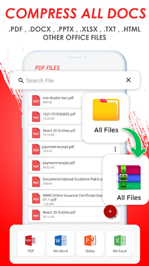 ★ All documents are easily accessible to user because all documents are categorized on basis of file formats such as pdf, docx, txt, xlxs, ppt, apk and many other files. You can easily select and compress your documents in Rar Zip format.