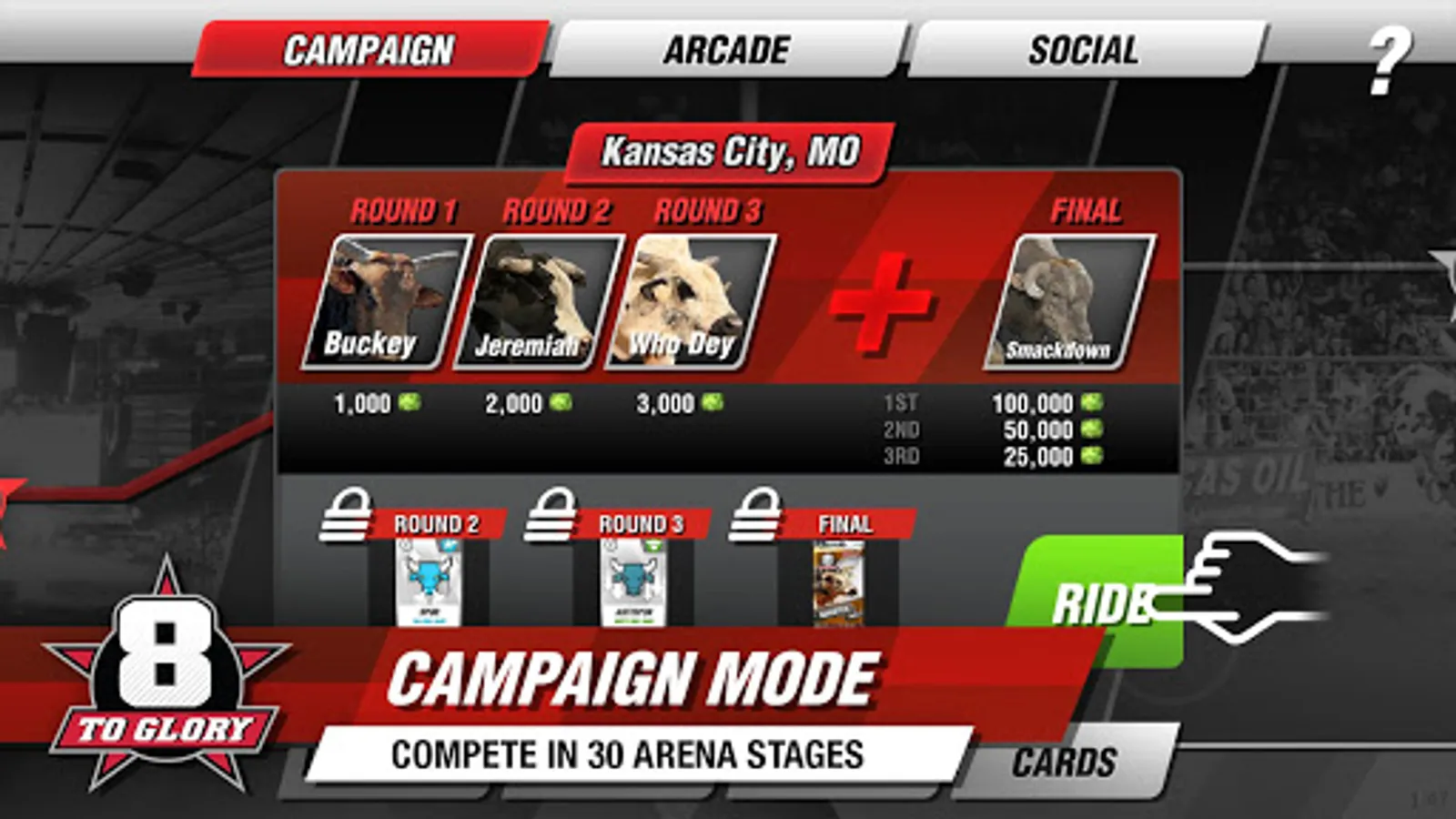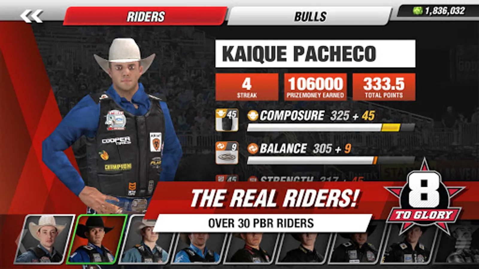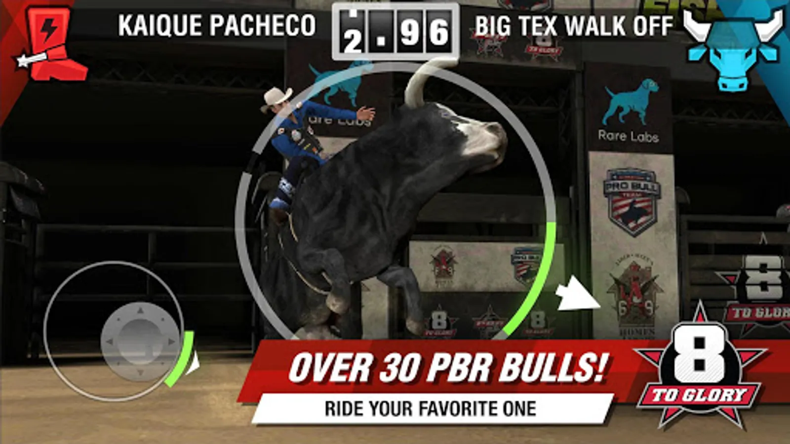 8 to Glory is the Official Bull Riding Game of the PBR, and the only real bull riding game for mobile! Do you have what it takes to make it 8 seconds on the top bulls in the worldl? 8 to Glory features more than 30 real riders including Kaique Pacheco, Fabiano Vieira, Joao Ricardo Vieira, Derek Kolbaba, Ryan Dirteater, Jess Lockwood, and more!