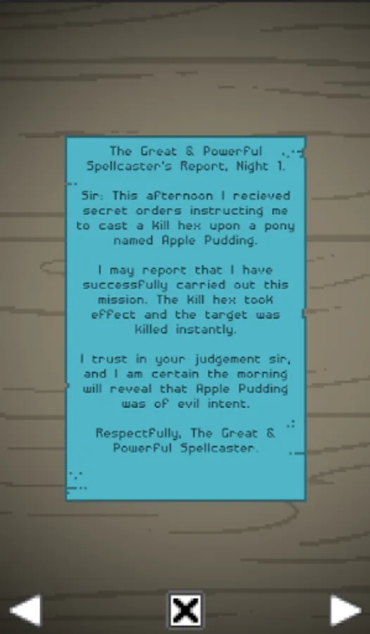 You are Captain Silvermane, sent to a quiet little pony town by the Princess of the Sun herself to investigate reports of dark magic and murder.On arrival you find only a handful of terrified ponies remain. Among the innocent townsponies is a murderous gang of Changelings who have assumed pony form and are now working together to drain the innocents of their love to feed their insatiable Queen.