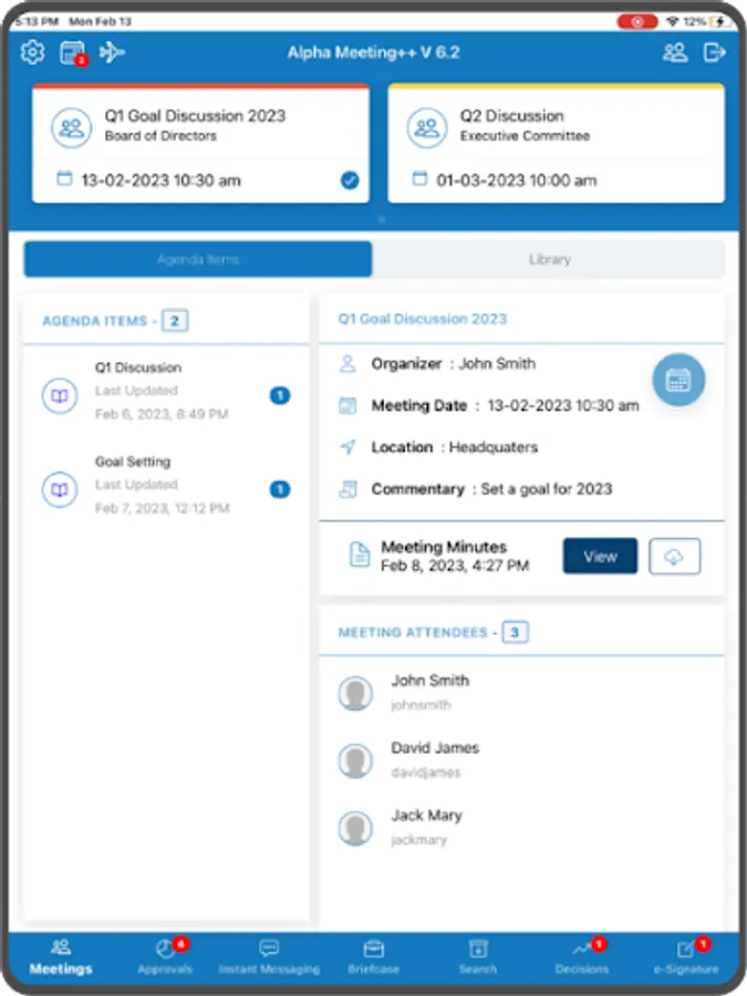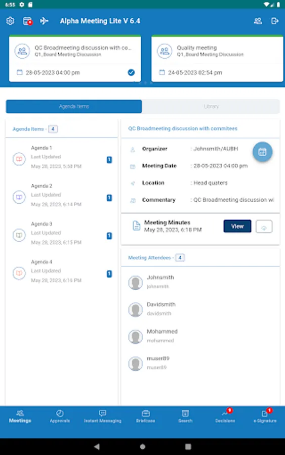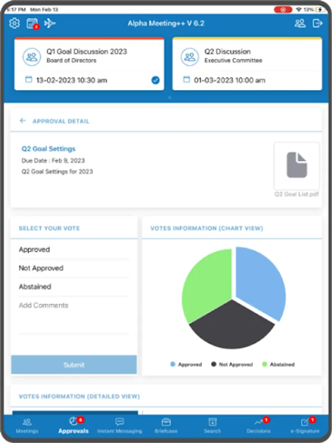 Alpha Meeting is a highly efficient online board meeting software that runs on mobile, and tablet devices. It lets you conduct electronic board meetings and gives your administrators a simple and powerful web-based administration tool to prepare and manage meetings. Alpha Meeting allows your Board of Directors, executives, and committee members to just attend a meeting with their iPads without the need to carry any paper-based documents. Using the Alpha Meeting app on their devices they can get access to their current meeting agendas, documents, resolutions, past meeting documents, and much more.