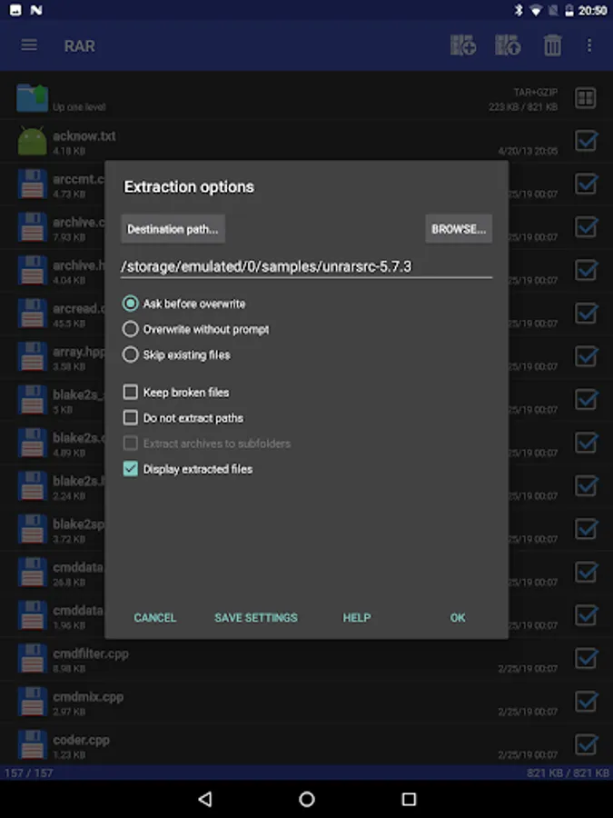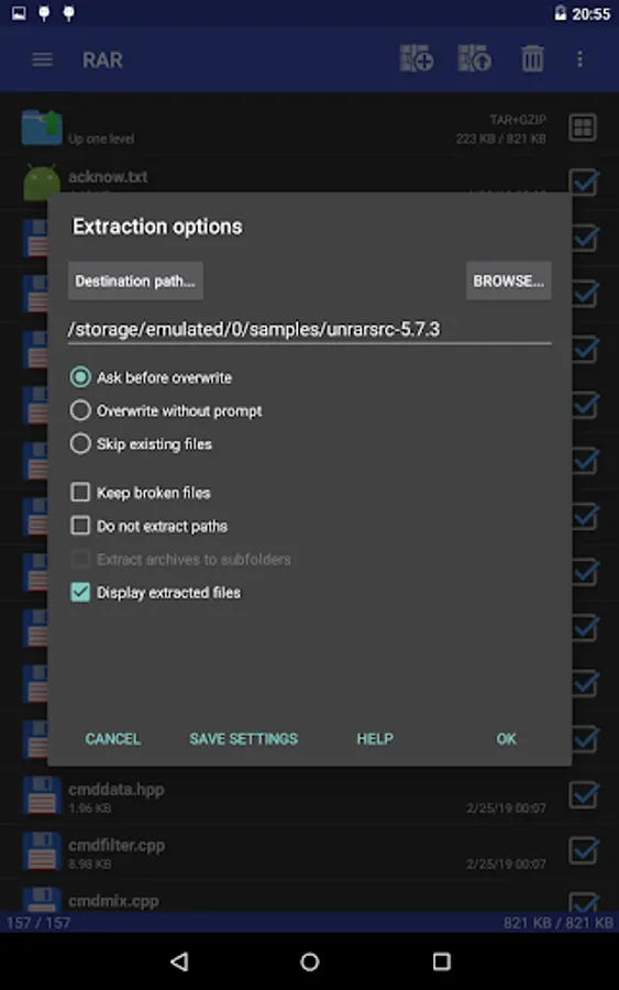 RAR can create RAR and ZIP and unpack RAR, ZIP, TAR, GZ, BZ2, XZ, 7z, ISO, ARJ archives. List of functions include repair command for damaged ZIP and RAR files, benchmark function compatible with RARLAB's WinRAR benchmark, recovery record, usual and recovery volumes, encryption, solid archives, utilizing multiple CPU cores to compress data.