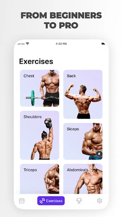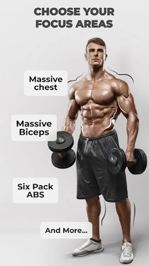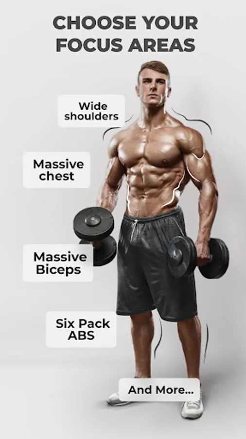 • Workouts for building biceps, getting wide back, shoulders, chest, strong legs, and more.