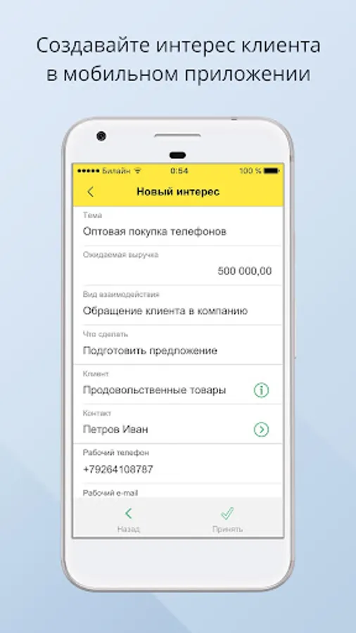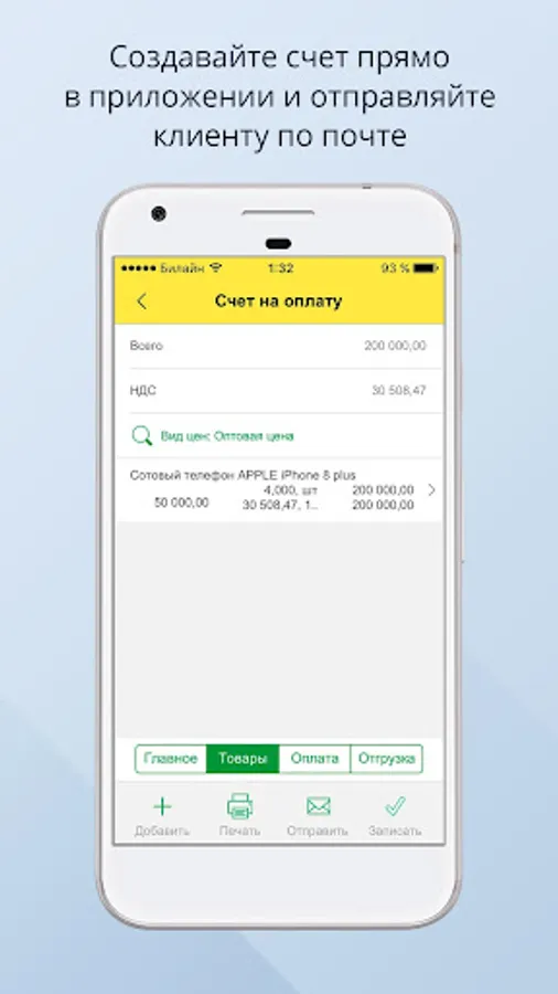 - Create documents "Offer" (available in the paid version) and "Account" right in the mobile application and submit to the client by e-mail;