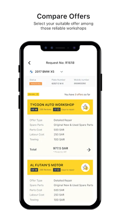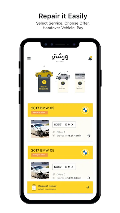 Repair the damaged vehicles by requesting a repair service, get the best offers from guaranteed workshops, and sending the vehicle to the workshop and returning it using Warshti App.