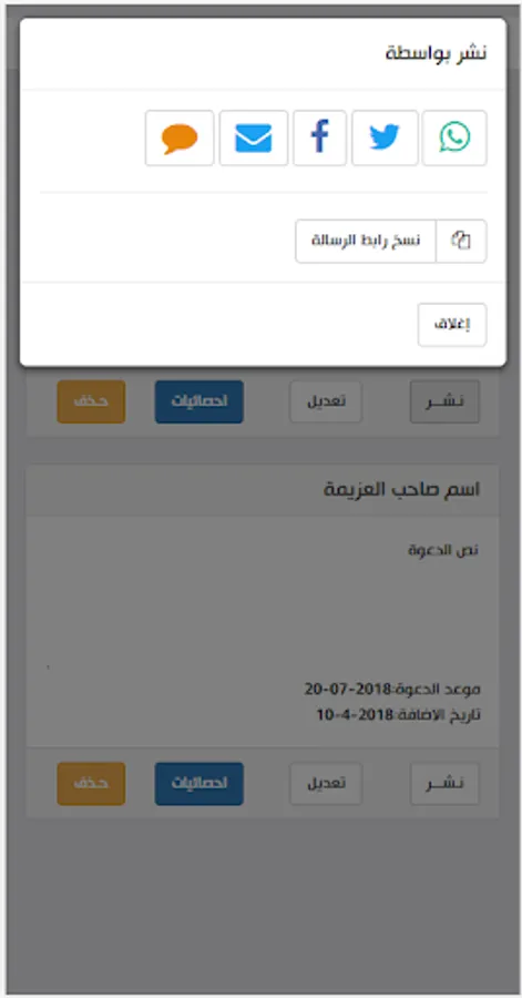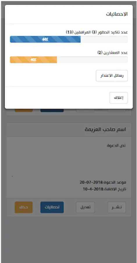 The application adds the bottom of the invitation message link, the link allows the audience is invited to confirm or apologize. Can also specify the number of escorts are invited in the event of confirmation. The owner of the call he could see the number of the confirmed and apologists through the statistics button in the application