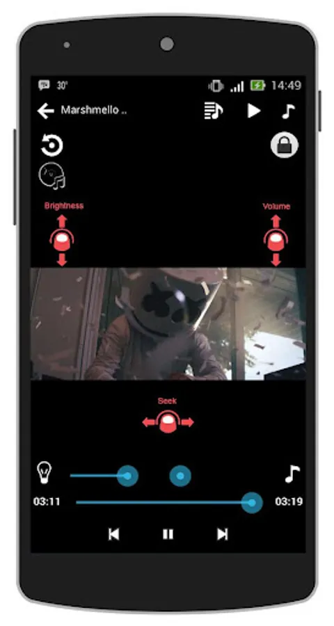 4. Screen Gestures : Seek Position, Volume Control, Brightness Control.
