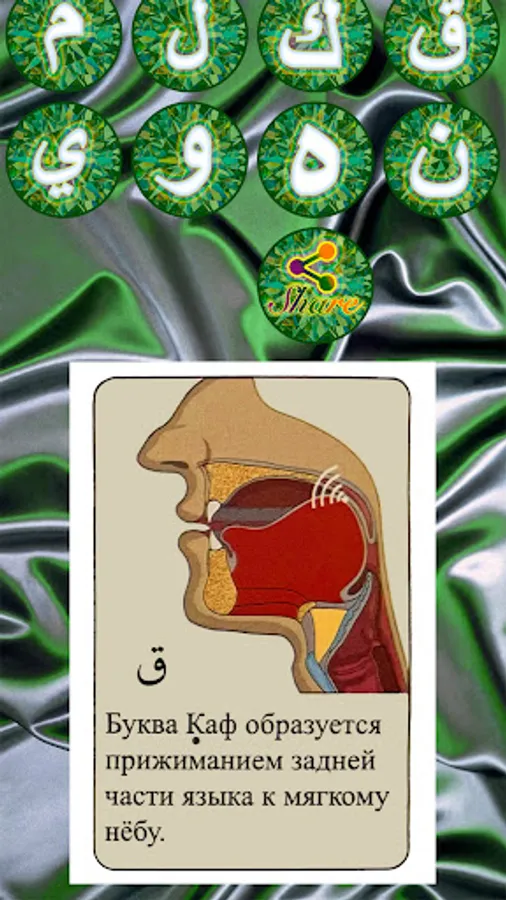 Assalamu alaikum. Application for beginners to learn Arabic. In order to listen to how the Arabic letter is pronounced, press and immediately release the button, and in order to learn how to pronounce the Arabic letter correctly, press the button and hold for about a second, then at the end of the alphabet there will be a picture with the mahrah of the letter you clicked on. In this application, there is no majraj for the letter "Alif".