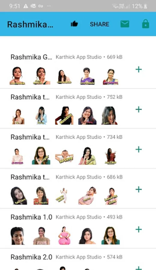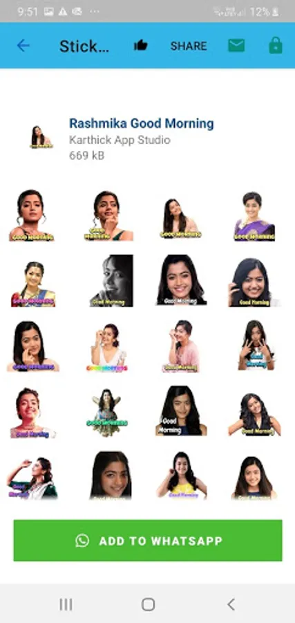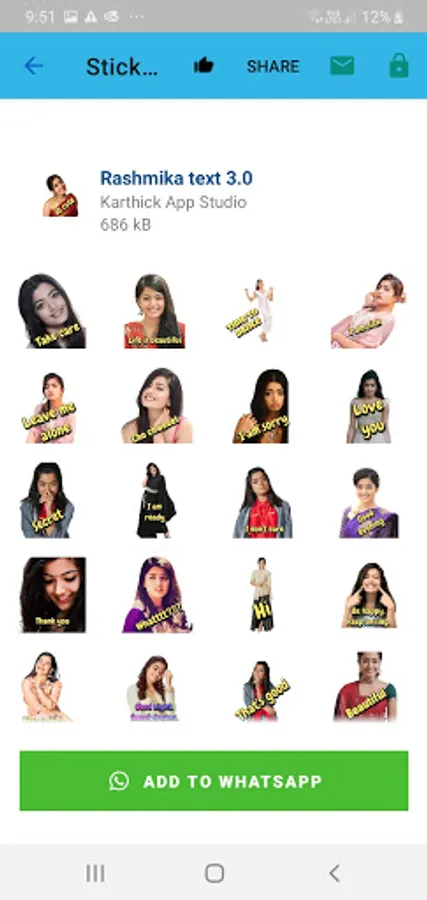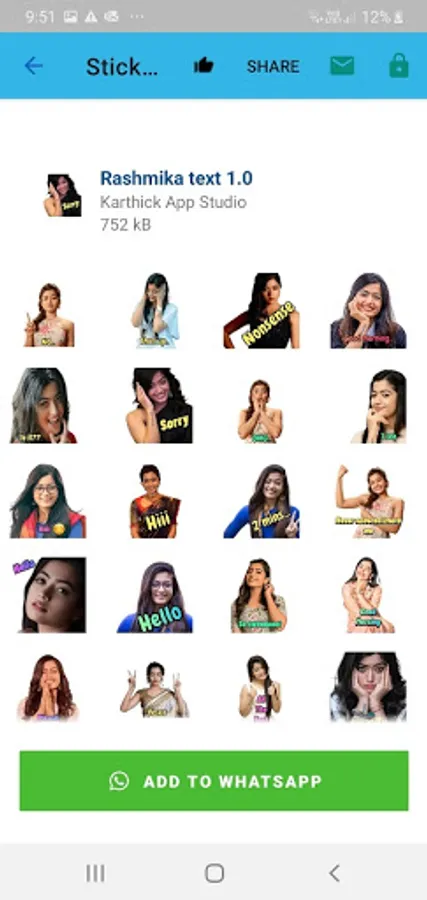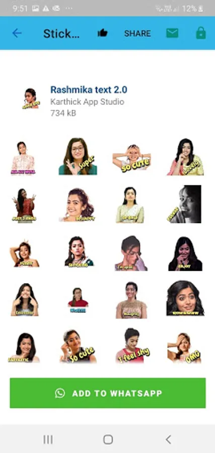 This Rashmika Mandanna Stickers WAStickersApp app has a variety of actress stickers such as cute, stylish, angry, sad, expressions with text. You can send the stickers to any of your friends privately or in group chats easily by adding the stickers to WhatsApp.
