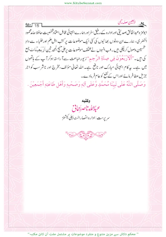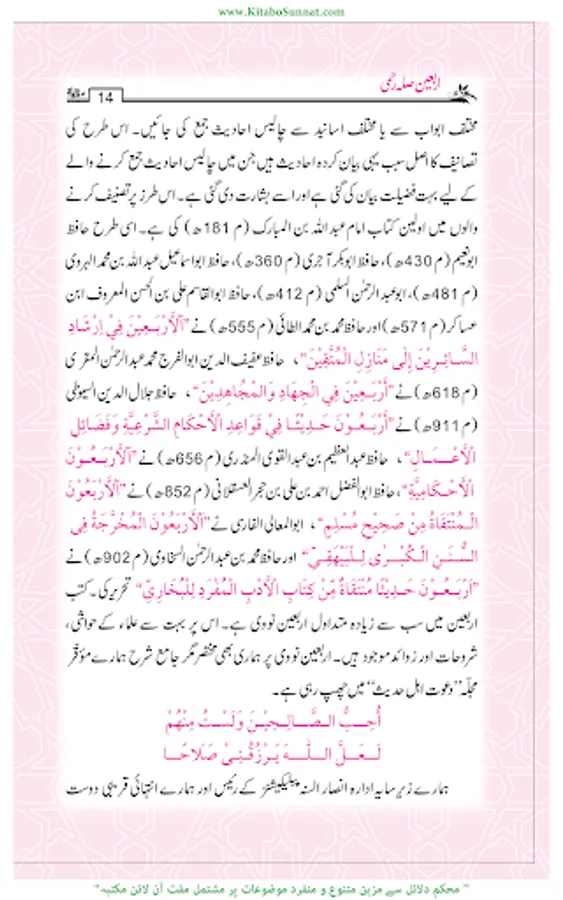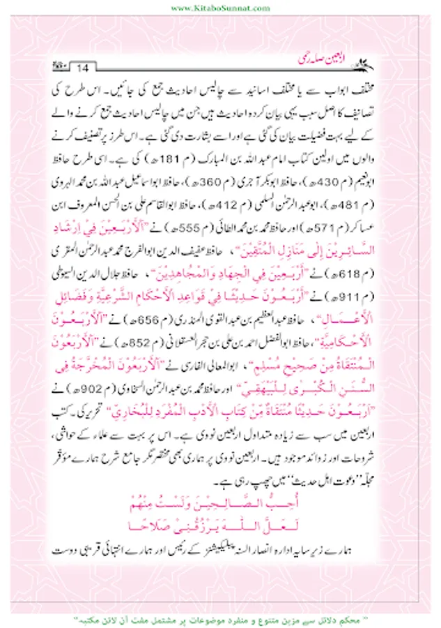 تدوینِ حدیث کا آغاز عہد نبوی ﷺ سے ہوا صحابہ وتابعین کے دور میں پروان چڑھا او ر ائمہ محدثین کےدور میں خوب پھلا پھولا ۔مختلف ائمہ محدثین نے احادیث کے کئی مجموعے مرتب کئے او رپھر بعدمیں اہل علم نے ان مجموعات کے اختصار اور شروح ،تحقیق وتخریج او رحواشی کا کام کیا۔مجموعاتِ حدیث میں اربعین نویسی، علوم حدیث کی علمی دلچسپیوں کا ایک مستقل باب ہے ۔اربعون؍اربعین سے مراد حدیث کی وہ کتاب ہےجس میں کسی ایک باب سےمتعلق احادیث یا مختلف ابواب سے یا مختلف اسانید سے چالیس احادیث جمع کی جائیں۔اس طرح کی تصانیف کا اصل سبب یہی احایث ہیں جن میں چالیں احادیث جمع کرنے والے کے لیے بہت فضیلت بیان کی گئی ہے ۔عبداللہ بن مبارک وہ پہلے محدث ہیں جنہوں نے اسی طرز پر پہلی اربعین مرتب کرنے کی سعادت حاصل کی ۔بعد ازاں اربعین کے سینکڑوں مجموعے مرتب ہوتے رہے ۔اربعین میں سب سے زیادہ متداول اربعین نووی ہےاس پر بہت سے علماء کے حواشی ، شروحات اور زاوئد موجود ہیں ۔ ’’سلسلہ اربعینا ت حدیث نبوی ﷺ‘‘ادارہ انصار السنۃ پبلی کیشنز،لاہورکےرئیس مولانا ابو حمزہ عبدالخالق صدیقی،اور حافظ حامد محمود الخضری حفظہما اللہ کی مشترکہ کاوش ہے۔ انہوں نے منہج محدثین کے مطابق مختلف 115؍اہم موضوعات پر اربعین مرتب کیں ہیں ہر موضوع سے متعلق 40 ؍احادیث مع تخریج و ترجمہ جمع کر کے ان کی ابواب بندی کی ہے ۔ادارہ انصار السنہ ’’ سلسلہ اربعینات الحدیث النوی‘‘ کے تقریباً 63 سلسلے شائع کرچکا ہے۔ مزید اشاعت کا کام جاری ہے۔عامۃ الناس کےاستفادہ کےلیے کتاب وسنت سائٹ نے اس سلسلہ اربعینات نبوی کو پبلش کرنا شروع کیا ہے ۔اللہ تعالیٰ اس سلسلۂ اربعینا ت نبوی کے مرتبین وناشرین کی کاوش کو قبول فرمائے اور اسے عامۃ الناس کے لیے نفع بخش بنائے۔(آمین)(م۔ا).
