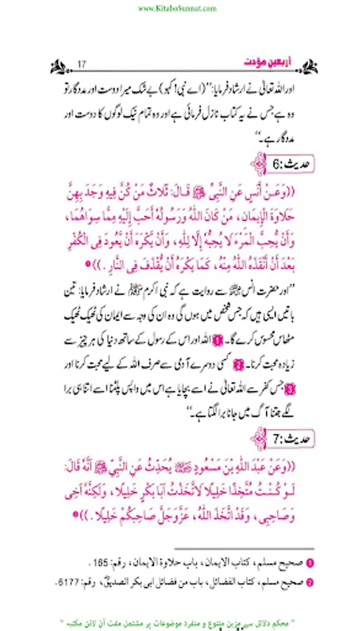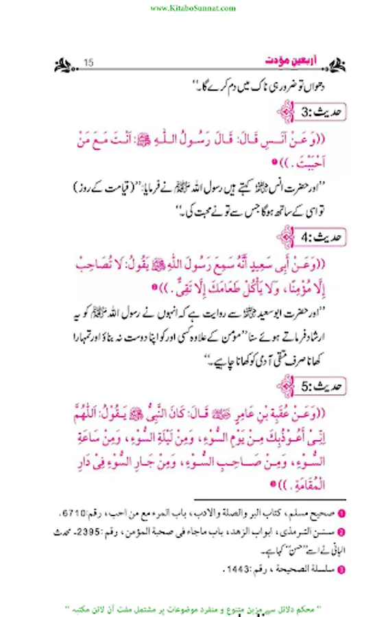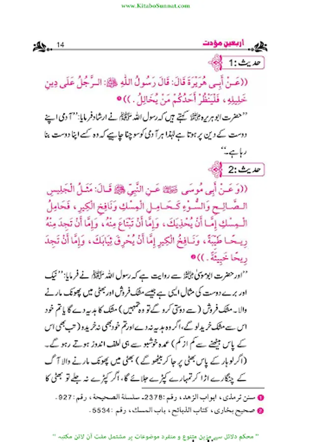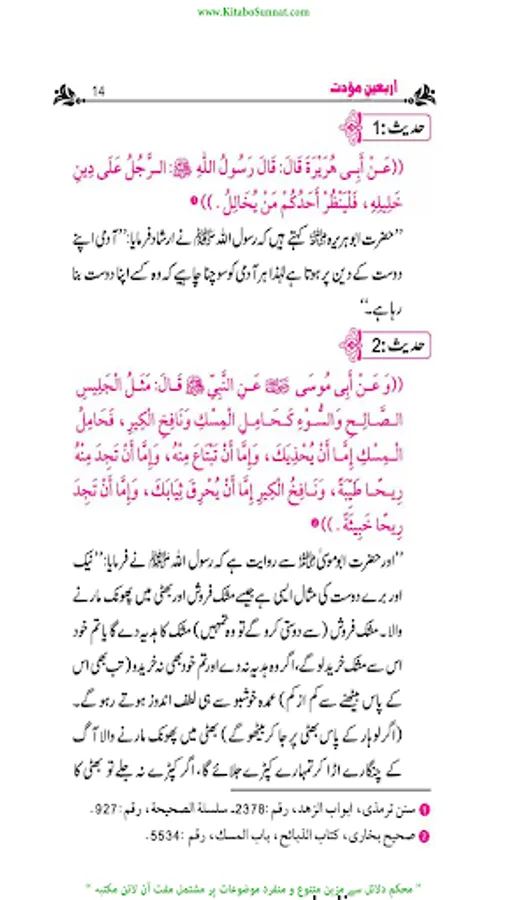کتاب اللہ اور سنت رسول ﷺدینِ اسلامی کے بنیادی مآخذ ہیں۔ احادیث رسول ﷺ کو محفوظ کرنے کے لیے کئی پہلوؤں اور اعتبارات سے اہل علم نے خدمات انجام دیں۔ تدوینِ حدیث کا آغاز عہد نبوی ﷺ سے ہوا صحابہ وتابعین کے دور میں پروان چڑھا او ر ائمہ محدثین کےدور میں خوب پھلا پھولا ۔مختلف ائمہ محدثین نے احادیث کے کئی مجموعے مرتب کئے او رپھر بعدمیں اہل علم نے ان مجموعات کے اختصار اور شروح ،تحقیق وتخریج او رحواشی کا کام کیا۔مجموعاتِ حدیث میں اربعین نویسی، علوم حدیث کی علمی دلچسپیوں کا ایک مستقل باب ہے ۔اربعون؍اربعین سے مراد حدیث کی وہ کتاب ہےجس میں کسی ایک باب سےمتعلق احادیث یا مختلف ابواب سے یا مختلف اسانید سے چالیس احادیث جمع کی جائیں۔اس طرح کی تصانیف کا اصل سبب بیان کر دہ یہی احایث ہیں جن میں چالیں احادیث جمع کرنے والے کے لیے بہت فضیلت بیان کی گئی ہے اور اسے بشارت دی گئی ہے ۔عبداللہ بن مبارک وہ پہلے محدث ہیں جنہوں نے اسی طرز پر پہلی اربعین مرتب کرنے کی سعادت حاصل کی ۔بعد ازاں علم حدیث ،حفاظت حدیث، حفظ حدیث اورعمل بالحدیث کی علمی او رعملی ترغیبات نے اربعین نویسی کو ایک مستقل شعبۂ حدیث بنادیا۔ اس ضمن میں کی جانے والی کوششوں کے نتیجے میں اربعین کے سینکڑوں مجموعے اصول دین، عبادات، آداب زندگی، زہد وتقویٰ او رخطبات و جہاد جیسے موضوعات پر مرتب ہوتے رہے ۔اربعین میں سب سے زیادہ متداول اربعین نووی ہےاس پر بہت سے علماء کے حواشی ، شروحات اور زاوئد موجود ہیں ۔ ’’سلسلہ اربعینا ت حدیث نبوی ﷺ‘‘ادارہ انصار السنۃ پبلی کیشنز،لاہور کےرئیس مولانا ابو حمزہ عبد الخالق صدیقی﷾،اور حافظ حامد محمود الخضری ﷾ کی مشترکہ کاوش ہے۔ انہوں نے منہج محدثین کے مطابق مختلف 115 ہم موضوعات پر اربعین مرتب کیں ہیں ہر موضوع کے متعلق 40 احادیث مع تخریج و ترجمہ جمع کی ہیں اور ان کی ابواب بندی بھی کی ہے ۔ادارہ انصار السنہ ’’ سلسلہ اربعینات الحدیث النوی‘‘ کے تقریباً 35 سلسلے شائع کرچکا ہے۔ مزید اشاعت کا کام جاری ہے ۔عامۃ الناس کےاستفادہ کےلیے کتاب وسنت سائٹ نے اس سلسلہ اربعینات نبوی کو پبلش کرنا شروع کیا ہے ۔اللہ تعالیٰ اس سلسلہ اربعینا ت نبوی کے مرتبین وناشرین کی کاوش کو قبول فرمائے اور اسے عامۃ الناس کے لیے نفع بخش بنائے ۔(آمین)(م۔ا).