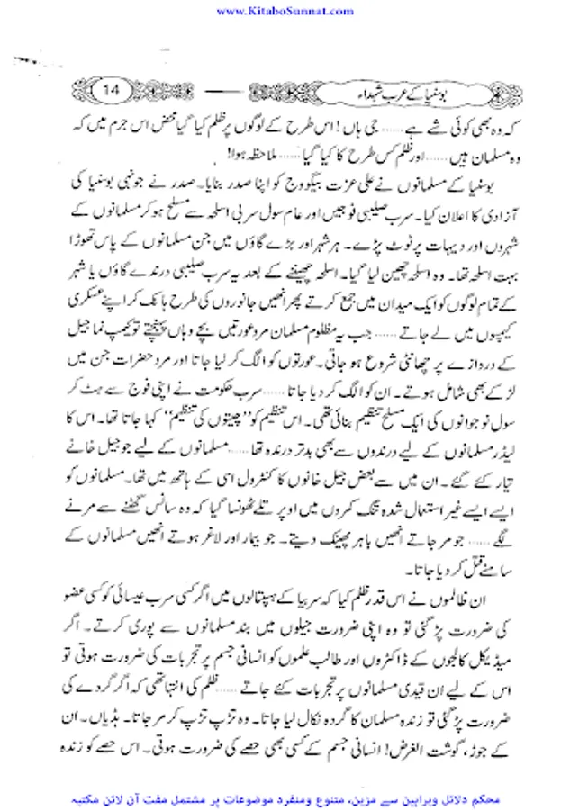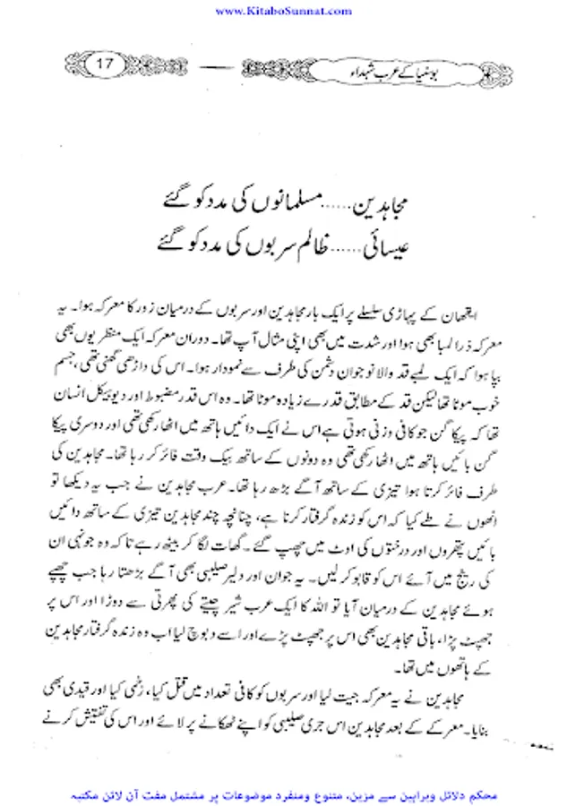 جہاد فی سبیل اللہ ، اللہ کو محبوب ترین اعمال میں سے ایک ہے اور اللہ تعالی نے بیش بہا انعامات جہاد فی سبیل میں شریک ایمان والوں کے لئے رکھے ہیں۔ اور تو اور مومن مجاہدین کا اللہ کی راہ میں نکلنے کا عمل اللہ کو اتنا پسندیدہ ہے کہ اس کے مقابلے میں نیک سے نیک، صالح سے صالح مومن جو گھر بیٹھا ہے ، کسی صورت بھی اس مجاہد کے برابر نہیں ہو سکتا ، جو کہ اپنے جان و مال سمیت اللہ کے دین کی سربلدی اور اس کی راہ میں حائل رکاوٹوں کو گرانے کے لئے ، کسی شہہ کی پرواہ کئے بغیر نکل کھڑا ہوا ہوتا ہے۔ذیل میں ہم جہاد فی سبیل بارے کچھ اسلامی تعلیمات اور اس راہ میں اپنی جانیں لٹانے والوں کے فضائل پیش کریں گے۔ جہاد كا لغوى معنی طاقت اور وسعت كے مطابق قول و فعل كو صرف اور خرچ كرنا،اور شرعى معنى اللہ تعالى كا كلمہ اور دين بلند كرنے كے ليے مسلمانوں كا كفار كے خلاف قتال اور لڑائى كے ليے جدوجہد كرناہے۔ زیر تبصرہ کتاب" بوسنیا کے عرب شہداء " جماعۃ الدعوہ پاکستان کے مرکزی رہنما محترم مولانا امیر حمزہ صاحب کی تصنیف ہے۔جس میں انہوں نےبوسنیا میں عرب شہداء کی ایمان افروز داستانیں بیان کی ہیں۔یہ کتاب اپنے اس موضوع پر ایک شاندار اور مفید کتاب ہے ،جس کا ہر طالب علم کو مطالعہ کرنا چاہئے۔اللہ تعالی مولف کی اس محنت کو قبول فرمائے۔آمین(راسخ).