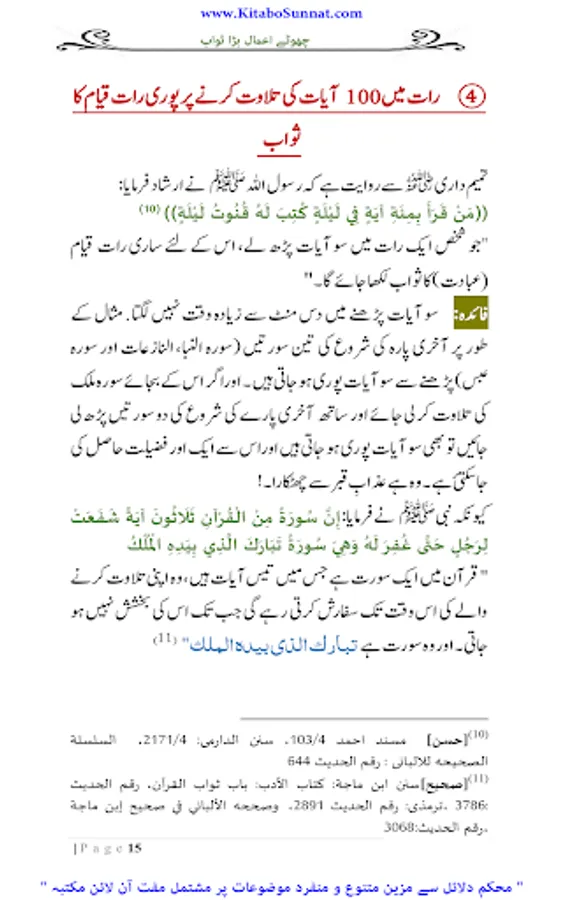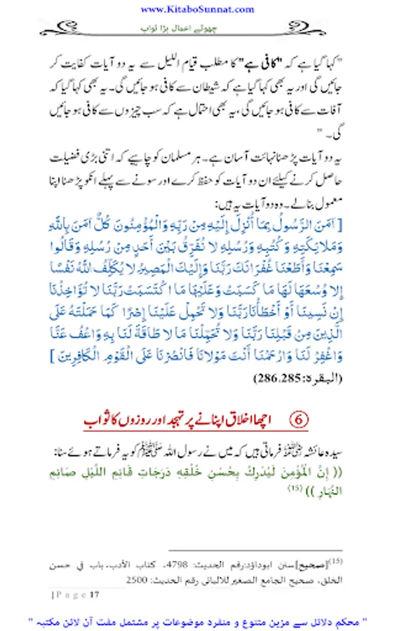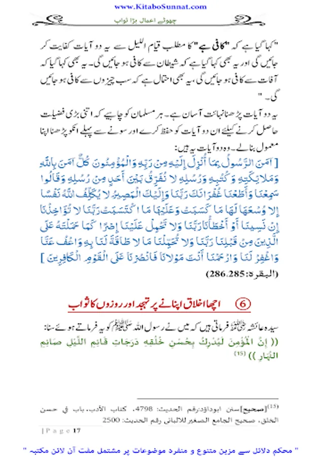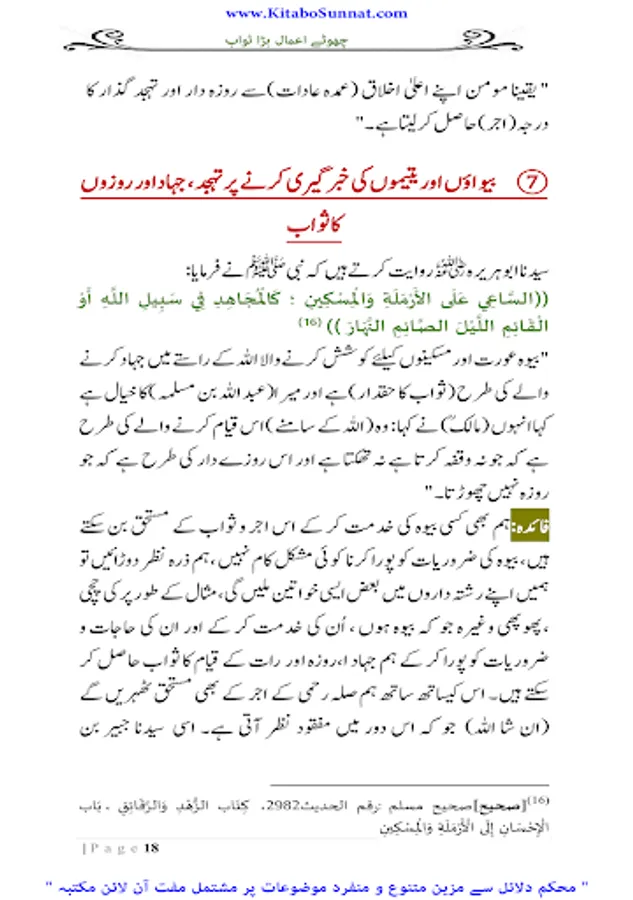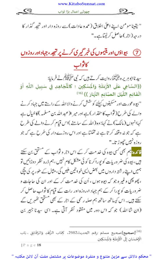 انسان کی فوز فلاح کےلیے ایمان کے ساتھ اعمال صالحہ کا ہونا بھی لازمی امر ہے۔ اگر ایمان کے ساتھ اعمال صالحہ نہیں ہونگے تو ایمان بھی فائدہ نہ دے گا کیونکہ اللہ تعالیٰ نے قرآن مجید جہاں بھی کامیاب ایمان والوں کاذکر کیا ہے ساتھ ہی بطور شرط اعمال صالحہ کا بھی ذکرکیا ہے ۔اور انسانی طبیعت کا یہ خاصہ ہےکہ وہ کم سے کم وقت میں زیادہ سے زیادہ نفع حاصل کرنا چاہتی ہے ۔اور شریعتِ اسلامیہ میں دینی احکام ومسائل پر عمل کی تاکید کے ساتھ ساتھ ان اعمال کی فضیلت وثواب بیان کرتے ہوئے انسانی نفوس کو ان پر عمل کرنے کے لیے انگیخت کیا گیا ہے ۔یہ اعمال انسانی زندگی کے کسی بھی گوشہ سے تعلق رکھتے ہوں خواہ مالی معاملات ہوں، روحانی یا زندگی کے تعبدی معاملات مثلاً نماز، روزہ، حج زکوٰۃ ودیگر عباداتی امور۔ اس لیے اللہ تعالیٰ نے اپنے بندوں کو یہ اعلیٰ مقام دینے کے لیے کتنے ہی چھوٹے چھوٹے اعمال کا اجر قیام ، صیام، حج وعمرہ اور جہاد فی سبیل اللہ جیذسی بڑی بڑی عبادات کے اجر کے برابر قراردیا ہے ۔تھوڑے وقت میں چھوٹے اعمال جوبہت بڑے ثواب کا با عث بنتے ہیں بڑی فضیلتوں کے حامل ہوتے ہیں انسان ان کو ڈھونڈتا پھرتا ہے ۔کیونکہ کسی عمل کی فضیلت،اجر و ثواب اورآخرت میں بلند مقام دیکھ کر انسانی طبیعت جلد اس کی طرف راغب ہوجاتی ہے اوران پر عمل کرنا آسان معلوم ہوتا ہے دین اسلام میں کئی ایسے چھوٹے چھوٹے اعمال بتائے گئے ہیں جن کا اجروثواب اعمال کی نسبت بہت زیادہ ہوتا ہے۔ مختلف اہل علم نے ایسے اعمال پر مشتمل کتب بھی مرتب کی ہیں ۔ زیر نظر کتابچہ ’’ چھوٹے اعمال بڑا ثواب ‘‘ فضیلۃ الشیخ محترم یحییٰ عارفی﷾ کا مرتب شدہ ہے ۔ فاضل مرتب نے اس مختصر کتابچہ میں ان اعمال صالحہ کوجودکھنے میں معمولی نوعیت کےنظرآتے ہیں ، لیکن اجراوثواب کےلحاظ سے عظیم عبادات کے برابر ہیں یکجا کر کے ان اعمال کو بجا لانے کی طرف توجہ مبذول کروائی ہے جو اجر میں قیام ، صیام، حج وعمرہ اور جہاد فی سبیل اللہ کےبرابر ہیں ۔ مولانا یحییٰ عارفی صاحب کی یہ کاوش یقیناً لائق تحسین وقابل تعریف ہے ۔اللہ تعالیٰ ان کی تمام مساعی حسنہ کو قبول فرمائے اور ان کےمیزان ِحسنات میں اضافے کا باعث بنائے ۔آمین(م۔ا).
