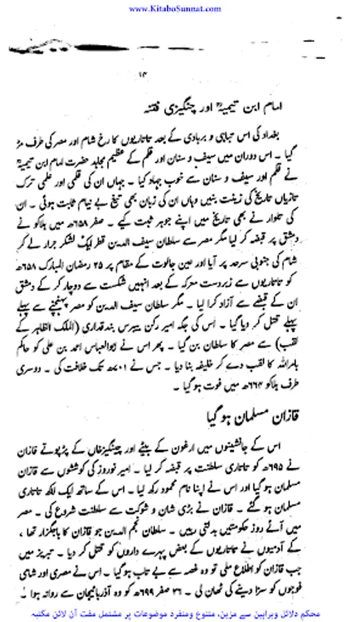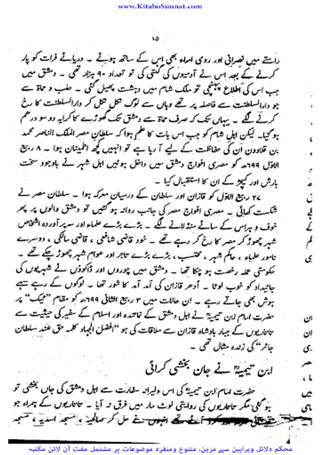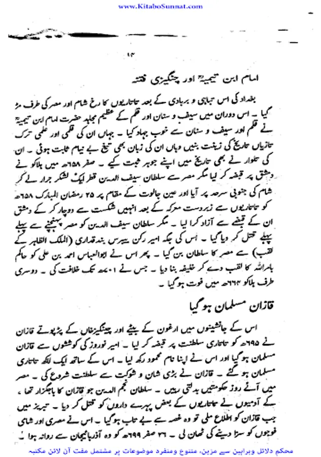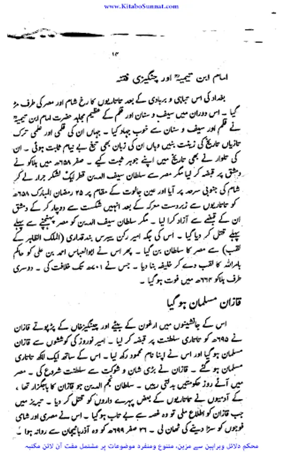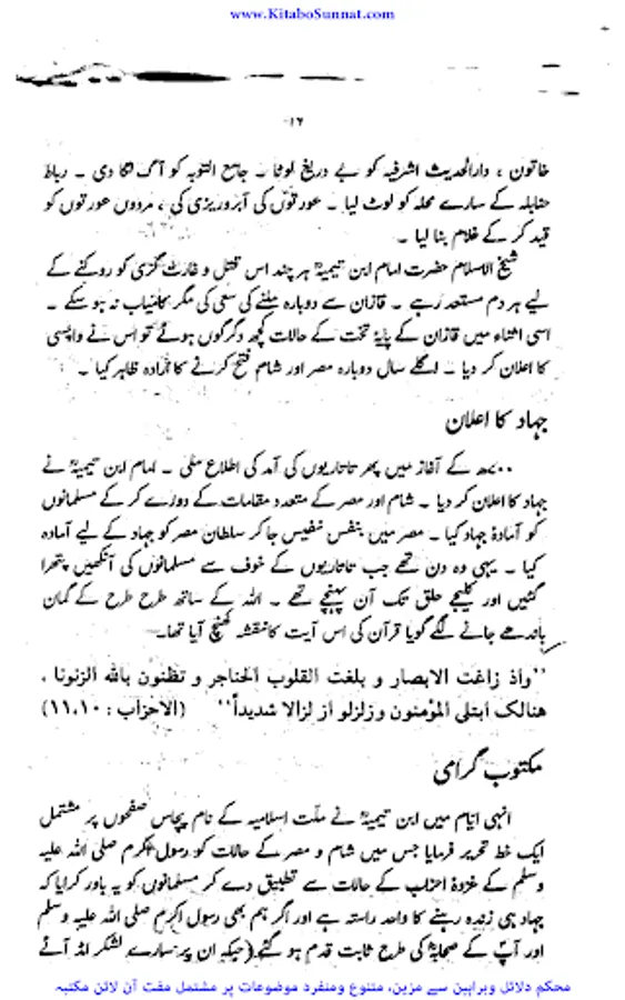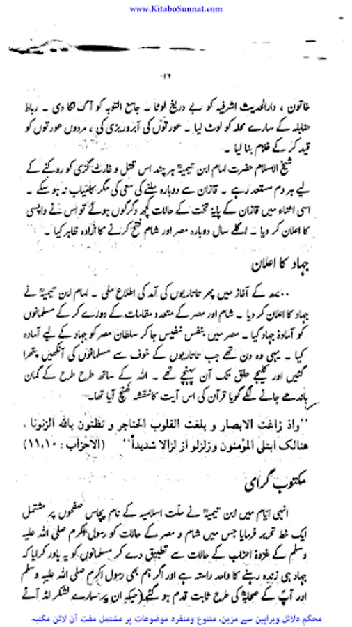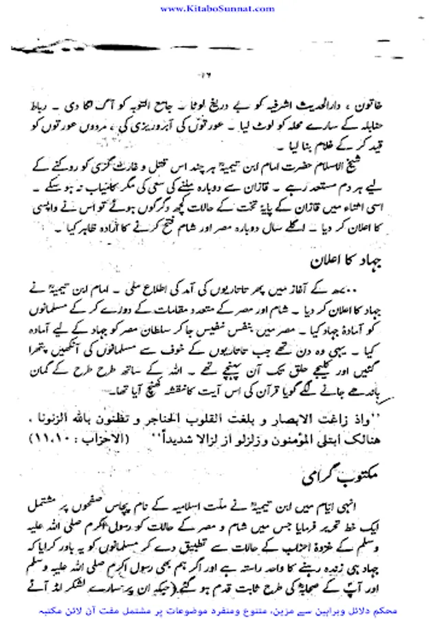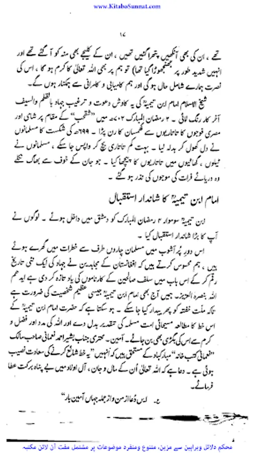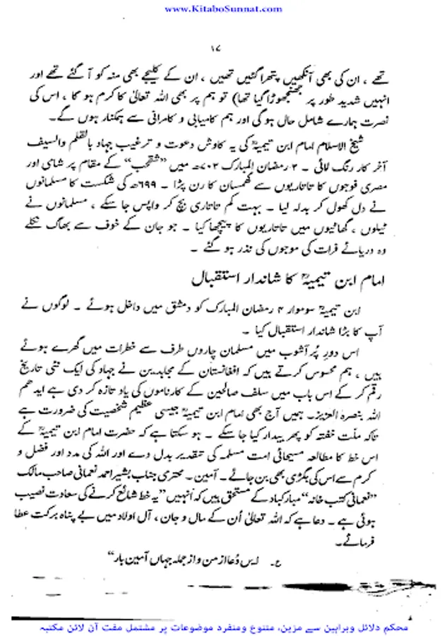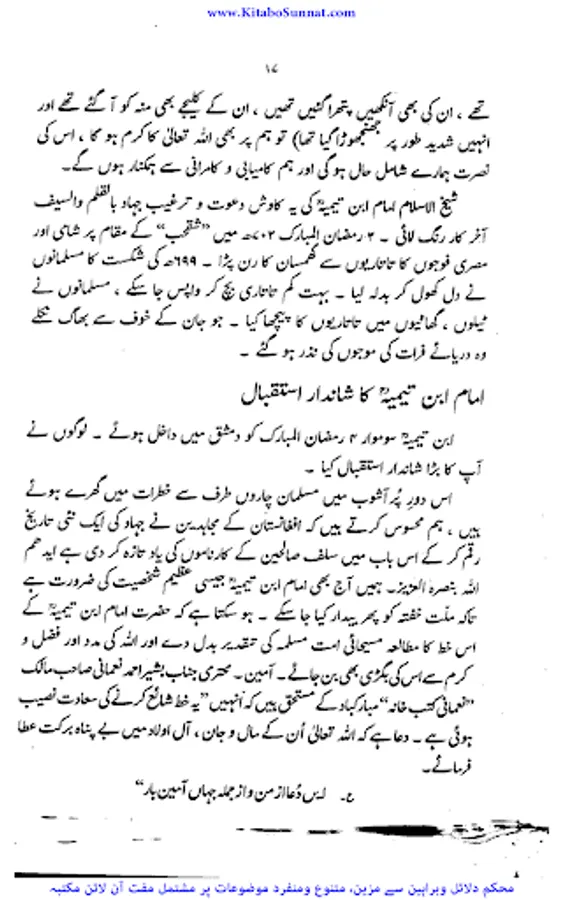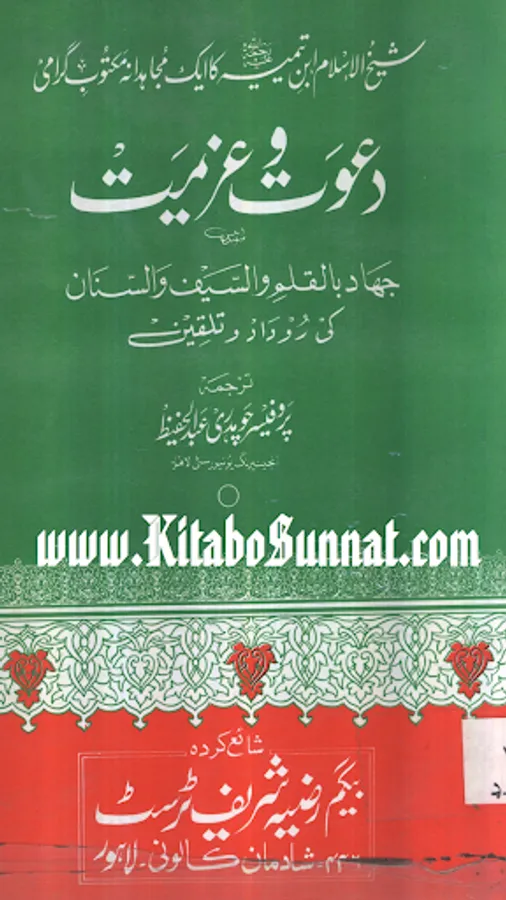 شیخ الاسلام والمسلمین امام ابن تیمیہ(661۔728ھ) کی شخصیت محتاجِ تعارف نہیں۔ آپ ساتویں صدی ہجری کی عظیم شخصیت تھے،آپ بہ یک وقت مفکر بھی تھے اور مجاہد بھی ، آپ نے جس طر ح اپنے قلم سے باطل کی سرکوبی کی۔ اسی طرح اپنی تلوار کو بھی ان کے خلاف خو ب استعمال کیا ۔ او رباطل افکار وخیالات کے خلاف ہردم سرگرم عمل او رمستعد رہے جن کے علمی کارہائے نمایاں کے اثرات آج بھی پوری آب وتاب سے موجود ہیں۔آپ نے اپنی پوری زندگی دین اسلام کی نشرواشاعت ،کتاب وسنت کی ترویج وترقی اور شرک وبدعت کی تردید وتوضیح میں بسرکی ۔امام صاحب علوم اسلامیہ کا بحر ذخار تھے اور تمام علوم وفنون پر مکمل دسترس اور مجتہدانہ بصیرت رکھتے تھے۔آپ نے ہر علم کا مطالعہ کیا اور اسے قرآن وحدیث کے معیار پر جانچ کر اس کی قدر وقیمت کا صحیح تعین کیا۔آپ نے مختلف موضوعات پر 500 سے زائد کتابیں لکھیں۔ آپ کا فتاوی ٰ 37 ضخیم جلد وں میں مشتمل ہے۔ امام صاحب صرف زبان اور قلم کے غازی ہی نہ تھے بلکہ وہ صاحب سیف وسنان بھی تھے ۔جنہوں نے محراب ومنبر کے ساتھ اچھے سپاہی اور مجاہد کی طرح میدان کارزار میں بھی شجاعت دکھائی۔جہاد کی تڑپ اور لگن ان کی رگ رگ اور نس نس میں رچی بسی تھی۔تاتاریوں کی بربریت کے خلاف جہاد بالقلم والسیف والسنان کا علم سب سے پہلے انہوں نےہی بلند کیا تھا۔عین اس وقت جب مصر وشام پر سراسیمگی کے بادل چھائے ہوئے تھے۔ان حالات میں امام ابن تیمیہ نے ایک خط لکھ کر وقت کے حکمرانوں او رعوام کو جہاد کی ترغیب دی جس کے نتیجے میں عالم اسلام کو تارتاریوں کی بربریت سے چھٹکارا نصیب ہوا۔ زیر تبصرہ کتا ب’’ دعوت وعزیمت ‘‘ شیح الاسلام ابن تیمیہ کے جہاد کے حوالے سے تحریر کردہ ایک مجاہدانہ مکتوب گرامی ’’جہاد بالقلم والسیف والسنان‘‘کا اردو ترجمہ ہے ۔اس خط میں اہمیت وجہاد اور فضلیت جہاد کے ساتھ ساتھ امت مسلمہ کے لیے قیامت تک کے لیے جہادکامیابیوں او رکامرانیوں کی جس طرح ضمانت مہیا کرتاہے اس خط میں اس پر سیر حاصل بحث کی گئی ہے ۔جہاد افغانستان کے دوران پروفیسر چوہدری عبد الحفیظ نے اس خط کا ترجمہ کیا او رخط کے شروع میں پروفیسر موصوف نے خط کا پس منظر بیان کرنے کے لیے ایک جامع مقدمہ بھی تحریر کیا ہے جواس دور کی تصویر پیش کرتاہے ۔(م۔ا).