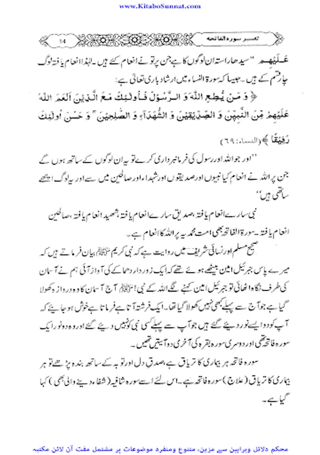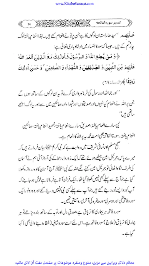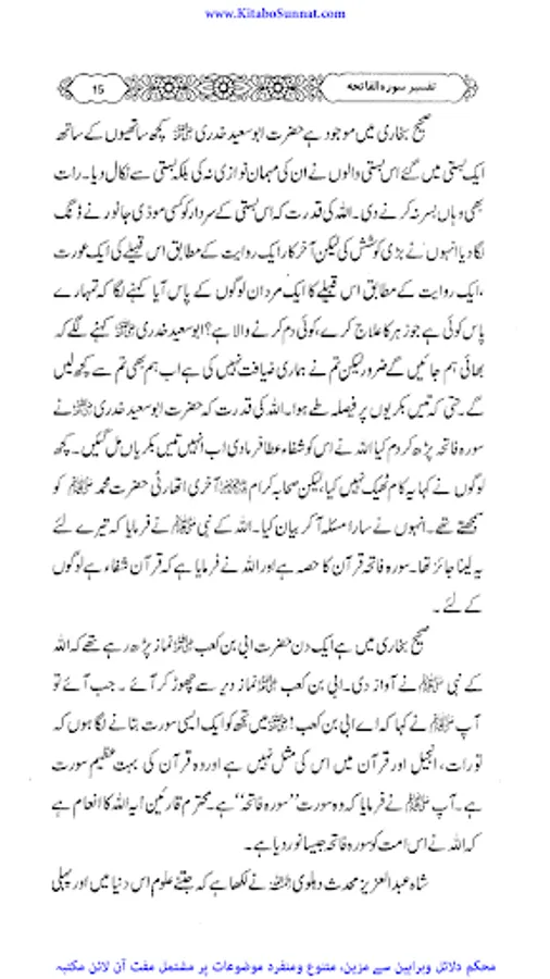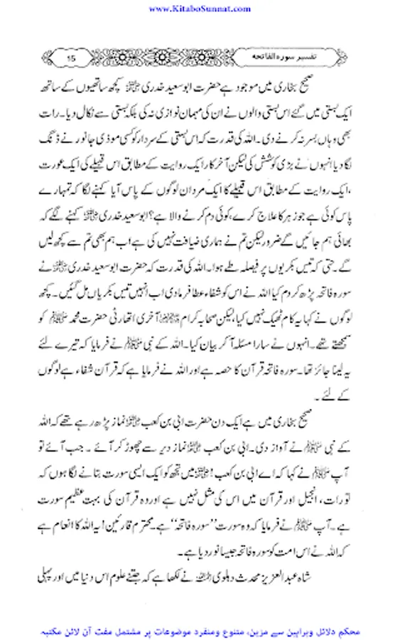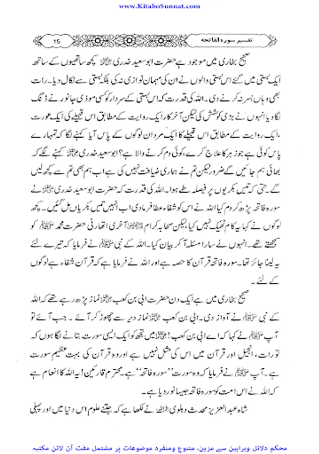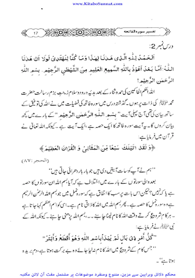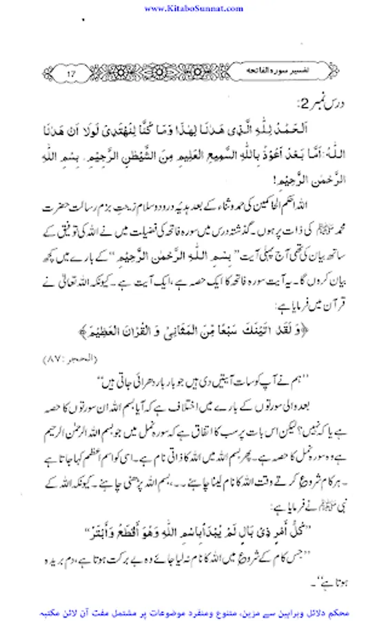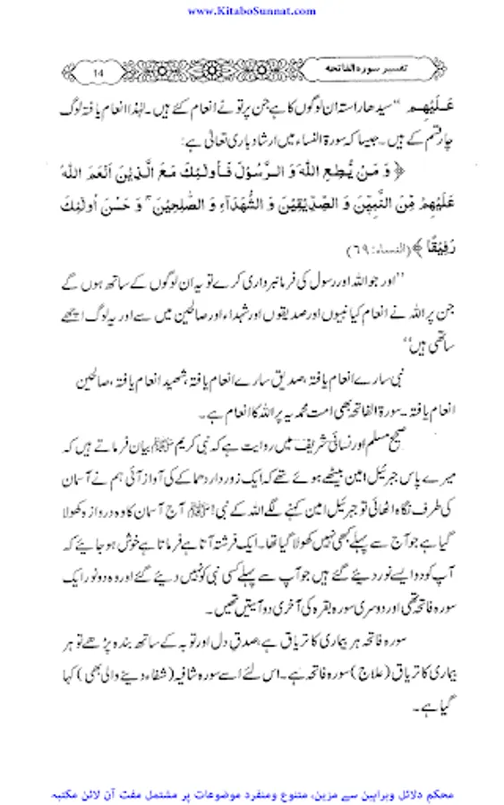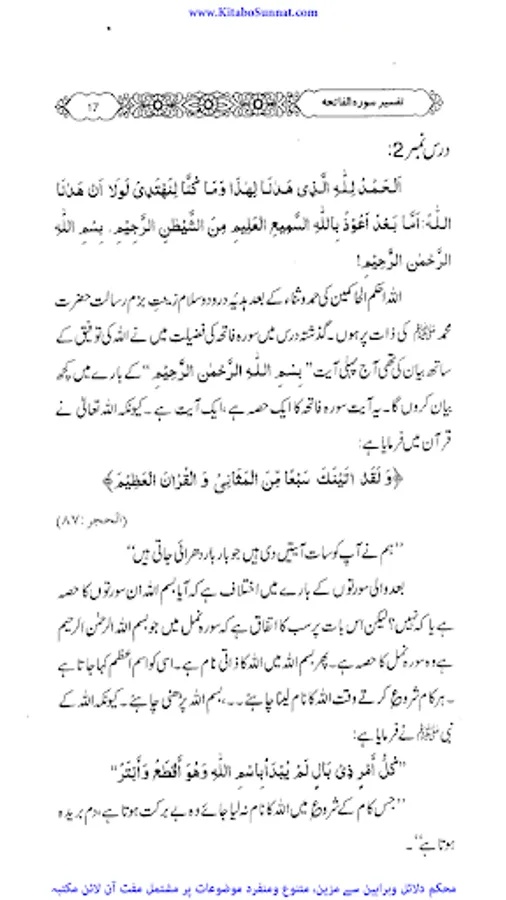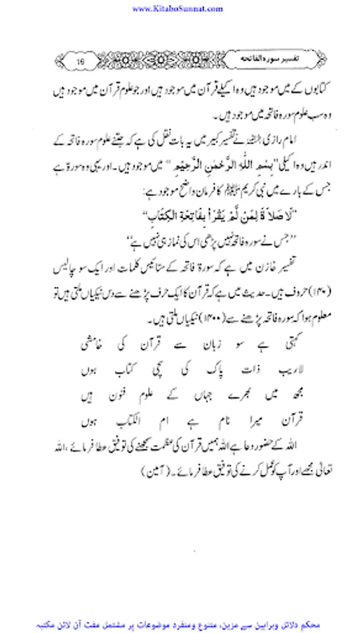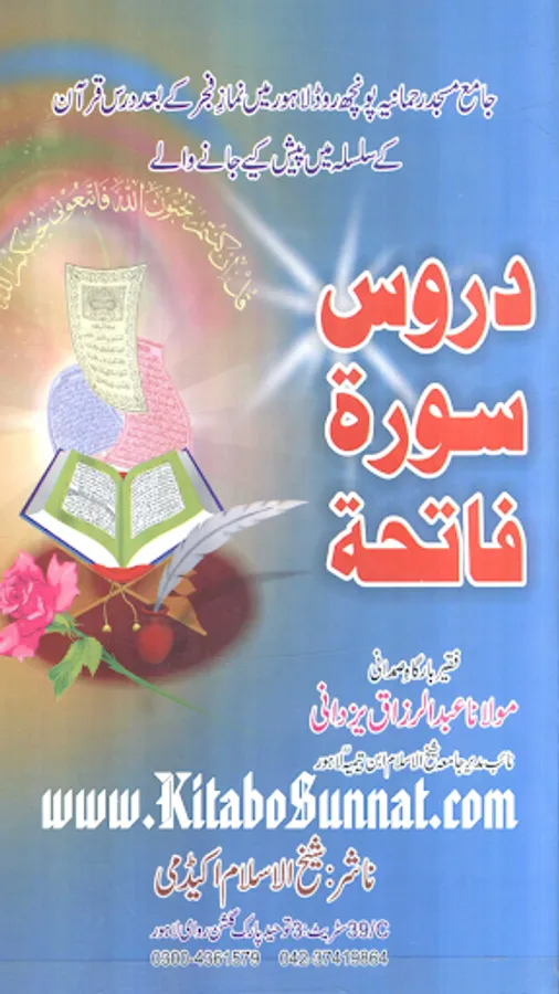 سورۂ فاتحہ قرآن مجید کی پہلی اور مضامین کے اعتبار سے جامع ترین سورۃ ہے جو پورے قرآن مجید کا مقدمہ ،تمہید اور خلاصہ ہے ۔ احادیث صحیحہ، آثار صحابہ و اقوال ائمہ کی روشنی میں یہ بات ثابت کی ہے کہ نماز میں فاتحہ پڑھنا ہر نمازی پر فرض اور واجب ہے خواہ وہ نمازی منفرد ہو یا جماعت کی حالت میں۔کیونکہ سورۃ الفاتحہ نماز کے ارکان میں سے ایک رکن ہے اور اس کے بغیر نماز نامکمل رہتی ہے۔نبی کریم ﷺ نے فرمایا: اس شخص کی کوئی نماز نہیں جس نے اس میں فاتحۃ الکتاب نہیں پڑھی۔دوسری جگہ فرمایا: “جس نے أم القرآن(یعنی سورۃ الفاتحہ)پڑھے بغیرنماز ادا کی تو وہ نماز ناقص ہے، ناقص ہے، ناقص ہے، نا مکمل ہے اس سورت کی عربی اور اردو میں کئی ایک تفسیریں الگ سے شائع ہوچکی ہیں ۔اور کئی علماء نے سورۃ فاتحہ کی تفسیر وتشریح کو اپنے دروس میں بھی بیان کیا ہے۔ زیر تبصرہ ’’دروس سورۃ فاتحہ ‘‘ بھی اسی سلسلہ کی کڑی ہے ۔یہ مولانا عبدالرزاق یزدانی کے جامع مسجد رحمانیہ پونچھ روڈ ، لاہور میں نماز فجر کے بعد دیے گئے دروس کا مجموعہ ہے ۔مولانا نے سادہ انداز میں سورۃ فاتحہ کی تفسیر کو تفسیر القرآن بالقرآن کی شکل میں پیش کیا ہے ۔علاوہ ازیں اس میں احادیث اور تاریخی واقعات بھی جابجاسمودئیے گیے ہیں ۔اور موقع کی مناسبت سے اردو اور پنجابی کےاشعار کے ذریعے بھی اس تفسیر کودلچسپ بنادیاگیا ہے۔یہ تفسیر علماء کرام ، طلباء اور عامۃ الناس کے مفید ونفع بخش ہے۔اللہ تعالیٰ مرحوم کی اس کاوش کو قبول فرمائے اور انہیں جنت الفردوس میں اعلیٰ مقام عطا فرمائے ۔(آمین)(م۔ا).