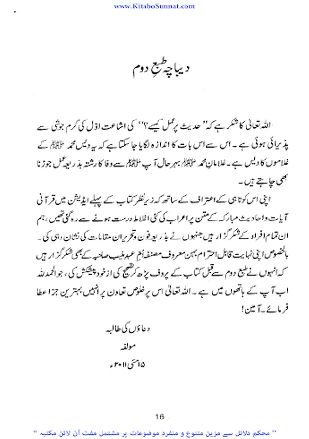 ٖ اہل اسلام میں یہ بات روز اول ہی سے متفق علیہ رہی ہے کہ شرعی علم کے حصول کے قابل اعتماد ذرائع صرف دو ہیں:ایک اللہ کی کتاب اور دوسرا اللہ کے آخری رسول ﷺ کی حدیث وسنت ۔امت میں جب بھی کوئی گمراہی رونما ہوتی ہے اس کا ایک بڑا سبب یہ ہوتا ہے کہ ان دونوں ماخذوں میں سے کسی ایک ماخذ کی اہمیت کو نظر انداز کر دیا جاتا ہے ۔ہماری بدقسمتی ہے کہ موجودہ زمانے میں بعض لوگوں نے ’حسبنا کتاب اللہ ‘کے قول حق کو اس گمراہ کن تصور کے ساتھ پیش کیا کہ کتاب اللہ کے بعد سنت رسول ﷺ کی ضرورت ہی نہیں رہی۔اس طرح بعض افراد رسول مقبول ﷺ کے بارے میں یہ تصور پیش کرتے رہے ہیں کہ ان کا کام محض ہرکارے کا تھا۔معاذ اللہ فتنہ انکار حدیث کی تاریخ کے سرسری مطالعہ سے معلوم ہوتا ہے کہ حدیث نبوی کی حجیت و اہمیت کے منکرین دو طرح کے ہیں ۔ایک وہ جو کھلم کھلا حدیث کا انکار کرتے ہیں اور اسے کسی بھی حیثیت سے ماننے کے لیے تیار نہیں ہیں۔دوسری قسم ان لوگوں کی ہے جو صراحتاً حدیث کے منکرین ،بلکہ زبانی طور پر اس کو قابل اعتماد تسلیم کرتے ہیں لیکن انہوں نے تاویل و تشریح کے ایسے اصول وضع کر رکھے ہیں جن سے حدیث کی حیثیت مجروح ہوتی ہے اور لوگوں پر یہ تاثر قائم ہوتا ہے کہ سنت نبوی کو تشریعی اعتبار سے کوئی اہم مقام حاصل نہیں ہے ۔ زیر تبصرہ کتاب" حدیث پر عمل کیسے؟"محترمہ یاسمین حمیدصاحبہ کی تصنیف ہے، جس میں انہوں نے نبی کریم ﷺ کی چند معروف احادیث کی تشریح بیان فرمائی ہے۔ (راسخ).