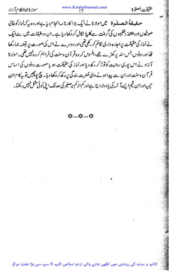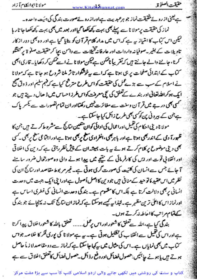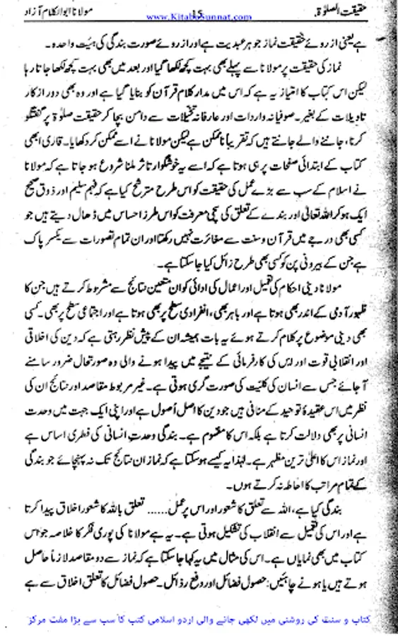 مسلمانوں کا امتیازی وصف دن اور رات میں پانچ دفعہ اپنے پرور دگار کے سامنے با وضوء ہو کر کھڑے ہونا اور اپنے گناہوں کی معافی مانگنا اور اپنے رب سے اس کی رحمت طلب کرنا ہے۔ نماز انتہائی اہم ترین فریضہ اور اسلام کا دوسرا رکن ِ عظیم ہے جوکہ بہت زیادہ اہمیت کا حامل ہے۔ کلمۂ توحید کے اقرار کے بعد سب سے پہلے جو فریضہ انسان پر عائد ہوتا ہے وہ نماز ہی ہے۔ اسی سے ایک مومن اور کافر میں تمیز ہوتی ہے۔ بے نماز کافر اور دائرۂ اسلام سے خارج ہے۔ قیامت کے دن اعمال میں سب سے پہلے نماز ہی سے متعلق سوال ہوگا۔ نماز بے حیائی اور برائی کے کاموں سے روکتی ہے۔ بچوں کی صحیح تربیت اسی وقت ممکن ہے جب ان کوبچپن ہی سےنماز کا پابند بنایا جائے۔ نماز کی ادائیگی اور اس کی اہمیت اور فضلیت اس قدر اہم ہے کہ سفر وحضر، میدان ِجنگ اور بیماری میں بھی نماز ادا کرنا ضروری ہے۔ اس لیے ہرمسلمان مرد اور عورت پر پابندی کے ساتھ وقت پر نماز ادا کرنا لازمی ہے۔ زیر تبصرہ کتاب ’’ حقیقت الصلاۃ ‘‘ امام الہند مولانا ابو الکلام آزاد کی تصنیف ہے۔ مولانا آزاد اسلام ایک کاحرکی اور انقلابی تصور رکھتے تھے جس میں قرآن اور نماز کو بنیادی حقیقت حاصل ہے۔ دین سے وابستگی کی ہر سطح ان کے نزدیک انہی دوبنیادوں پراستوار ہے۔ قرآن معبودیت کا اظہار ہے اور نماز عبودیت، گویا یہ دو قوسین ہیں جن سے مل کر دین کا دائرہ مکمل ہوتاہے۔ یا یوں کہہ لیجیے کہ قرآن جس کمال بندگی کا متقاضی ہے وہ نماز میں حاصل ہوتا ہے۔ بندگی کی کوئی بھی صورت ہو یہ ممکن نہیں کہ اس کی تکمیل نماز سے باہر کہیں اور ہوتی ہو ۔عقیدہ وعمل کی تمام وسعتوں، بلندیوں اور گہرائیوں کا اگر بندگی کی کسی ایک وضع میں کمال اور جامعیت کےساتھ اظہار ہوتا ہے تو وہ نماز ہے۔ یہ کتاب اسی دعوے کو جامۂ ثبوت پہناتی ہے۔ اپنی ذہنی بناوٹ اورافتاد طبع کے عین مطابق مولانا نے اس کتاب میں اپنے موضوع کی صورت نہیں بلکہ حقیقت کوہدف بنایا ہے یعنی مسائل نماز کی بجائے نماز جس جوہر بندگی اور حقیقت عبدیت کا مظہر ہے اس کی طرف توجہ دلائی ہے۔.