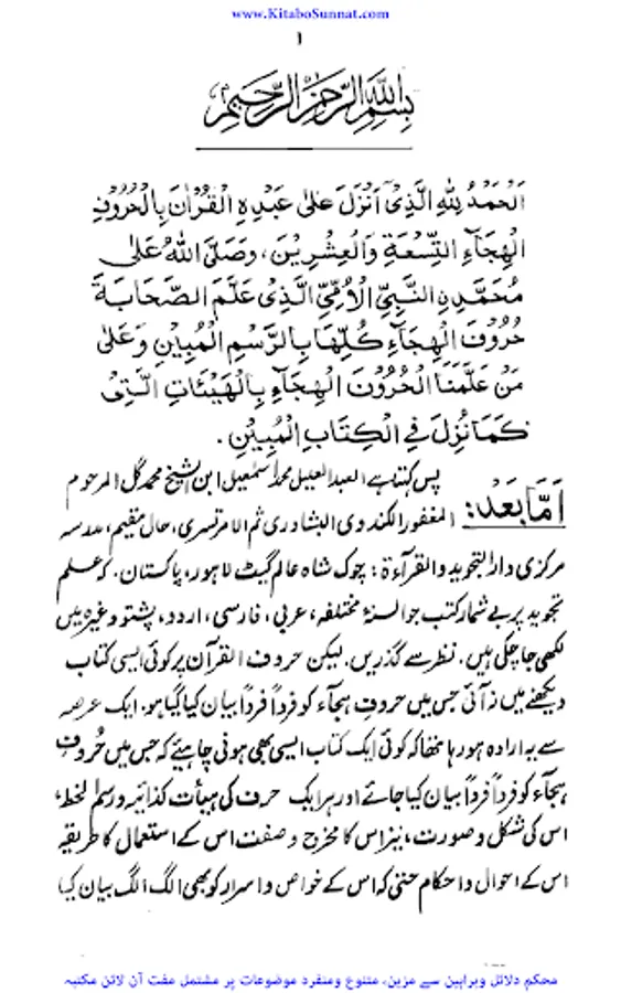 اللہ تعالیٰ نے قرآن مجید کو بندوں کی رشد و ہدایت کے لیے نازل فرمایاہے۔،یہ اللہ تعالیٰ کی طرف سے نازل کیا جانے والا ایسا کلام ہے جس کے ایک ایک حرف کی تلاوت پر دس دس نیکیاں ملتی ہیں۔اور قرآن مجید کی درست تلاوت اسی وقت ہی ممکن ہو سکتی ہے، جب اسے علم تجویدکے قواعد وضوابط اوراصول وآداب کے ساتھ پڑھا جائے۔ اللہ تعالیٰ نے قرآن کریم کو ترتیل کے ساتھ پڑھنے کا حکم دیا ہے ۔لہٰذا قرآن کریم کو اسی طرح پڑھا جائے جس طرح اسے پڑھنے کا حق ہے۔اور ہرمسلمان کے لیے ضروری ہے کہ وہ علمِ تجوید کے بنیادی قواعد سے آگاہی حاصل کرے۔فن تجوید پر اب تک عربی کے ساتھ ساتھ اردو میں بھی بہت سارے رسائل و کتب لکھی جا چکی ہیں۔ جن سے استفادہ کرنا اردو دان طبقہ کے لئے اب نہایت سہل اور آسان ہو گیا ہے ۔علم تجوید میں ضاد کا تلفظ ایک مشکل ترین تلفظ سمجھا جاتا ہے ، جس پر اہل علم نے اپنی اپنی آراء کا اظہار فرمایا ہے۔ زیر تبصرہ کتاب "حروف القرآن " محترم قاری محمداسماعیل پشاوری صاحب کی تصنیف ہے،جس میں انہوں نے تجوید کے احکام ومسائل کو بیان کیا ہے۔ شائقین علم تجوید کے لئے یہ ایک مفید اور شاندار کتاب ہے،جس کا تجوید وقراءات کے ہر طالب علم کو مطالعہ کرنا چاہئے۔اللہ تعالی مولف کی اس کاوش کو قبول فرمائے اور ان کے میزان حسنات میں اضافہ فرمائے۔آمین(راسخ).