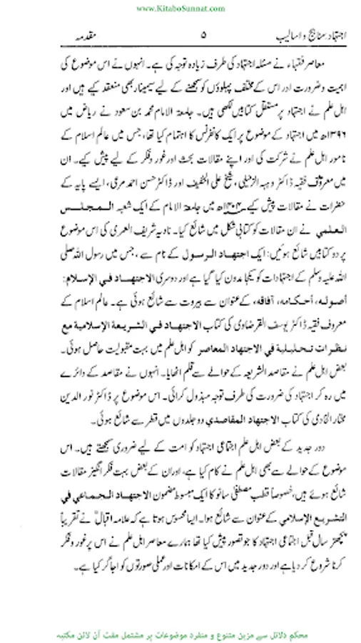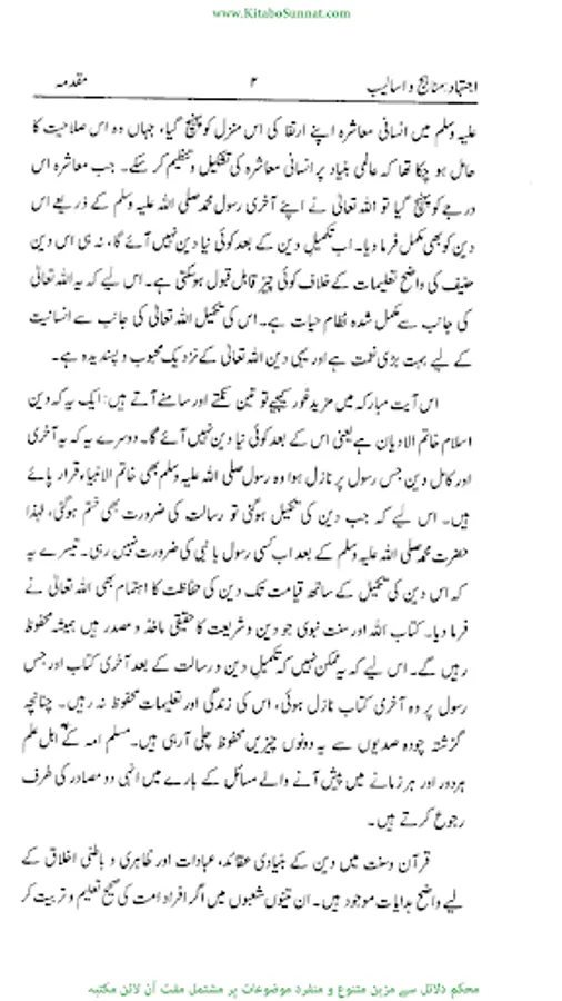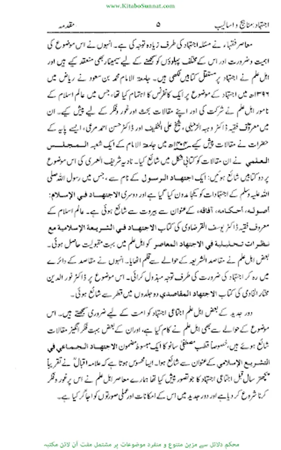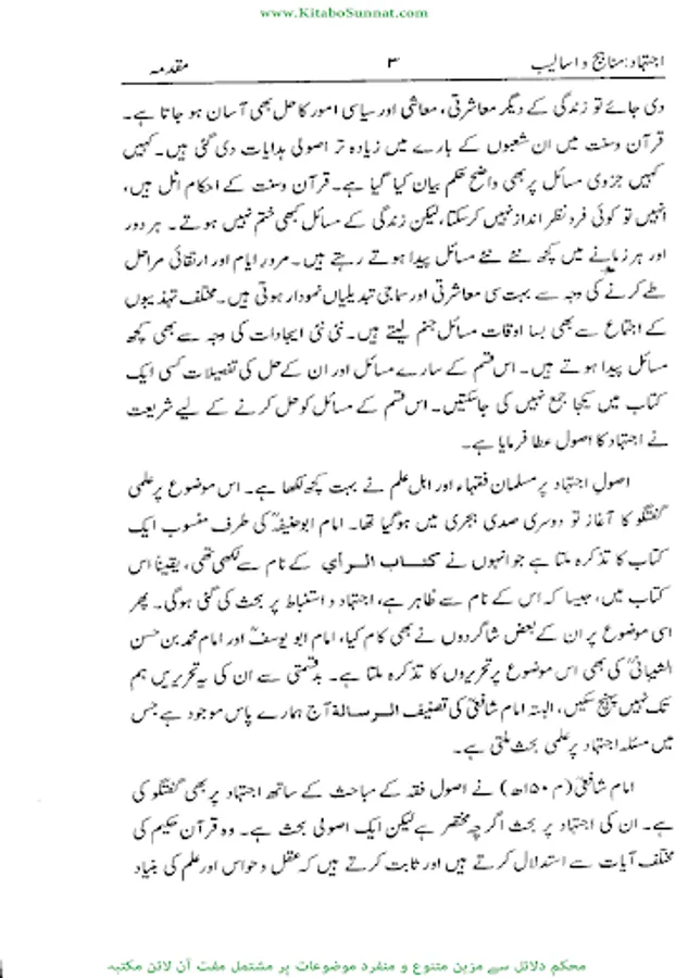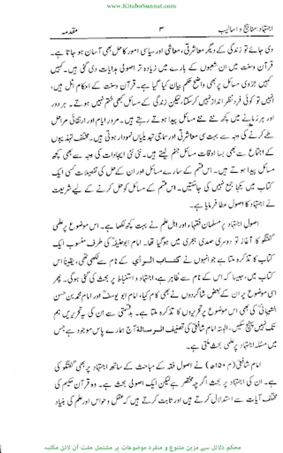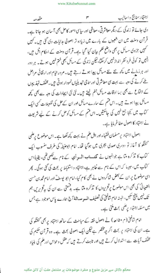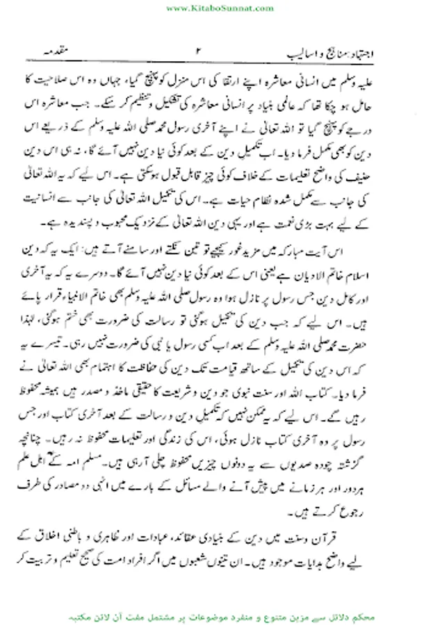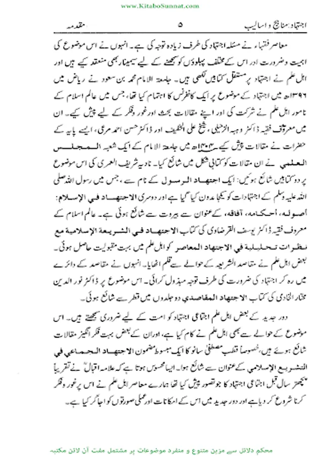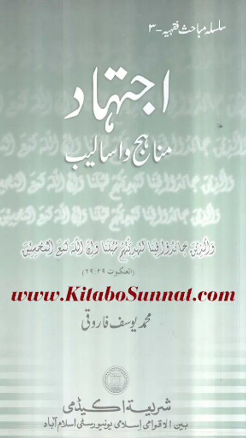 اسلام بنی نوع انسان کے لیے ہدایت کا آخری پیغام ہے جو ہر اعتبار سے محفوظ ہے۔ اس کے احکام وفرامین کا مستقل سر چشمہ قرآن مجید اور سنت مطہرہ ہے۔ فقہ الاحکام کا ذخیرہ عہد نبوی اور خلافت راشدہ میں حجاز کی حدود سے نکل کر افریقا اور ایشیاء کے متعدد اقالیم میں نو مسلم افراد اور اقوام کی ہمہ نوع رہنمائی کا فریضہ انجام دیتا دکھائی دیتا ہے۔بسا اوقات تمدن کے ارتقاء‘ مقامی عرف کے تقاضے اور حالات کے اقتضا سے ایسے مسائل بھی سامنے آتے ہیں کہ جن میں کوئی متعین نص موجود نہیں ہوتی۔ ایسی صورت میں فقیہ کتاب وسنت سے مستنیر حکمت‘ تدبر اور غور وفکر سے کام لیتے ہوئے ایسی قیاسی رائے ظاہر کرتا ہے جو نصوص کے مزاج سے ہم آہنگ ہوتی ہے۔اور اس موضوع پر بہت سی کتب منظر عام پر آچکی ہیں۔زیرِ تبصرہ کتاب اس سلسلے کی ایک کڑی ہے۔اس کتاب کو بہت سلیقے اور عمدگی سے ترتیب دیا گیا ہے جس میں اجتہاد کے تصور‘ آغاز اور ارتقاء کے حوالے سے بہت مفید اور مستند معلومات ہیں۔ اس میں اجتماعی اجتہاد پر خاطر خواہ کلام کیا ہے اور قیاس‘ استحسان‘ مصالح مرسلہ‘ استقراء‘ اسصحاب حال اور عرف جیسے فقہی عنوانات کی فنی اور علمی اہمیت کو بیان کیا ہے اور استقراء‘ ذرائع وغیرہ جیسے عنوانات کو بھی اختصار کے ساتھ کتاب کی زینت بنایا ہے۔ یہ کتاب’’ اجتہاد مناہج واسالیب ‘‘ محمد یوسف فاروقی کی مرتب کردہ ہے۔آپ تصنیف وتالیف کا عمدہ شوق رکھتے ہیں‘ اس کتاب کے علاوہ آپ کی درجنوں کتب اور بھی ہیں۔ دعا ہے کہ اللہ تعالیٰ مؤلف وجملہ معاونین ومساعدین کو اجر جزیل سے نوازے اور اس کتاب کو ان کی میزان میں حسنات کا ذخیرہ بنا دے اور اس کا نفع عام فرما دے۔(آمین)( ح۔م۔ا ).