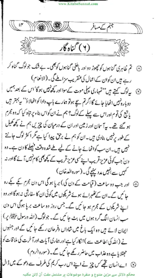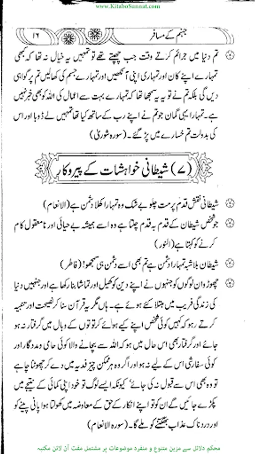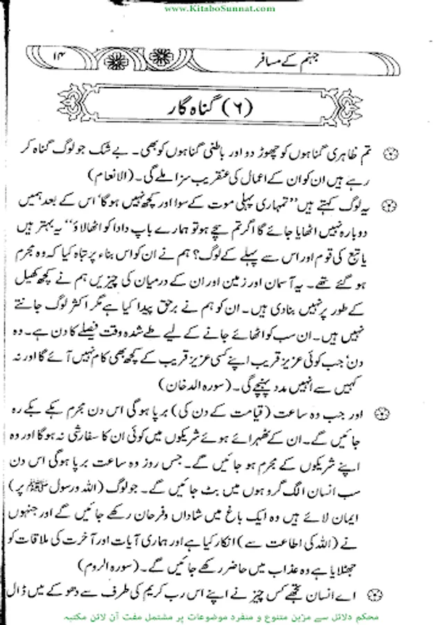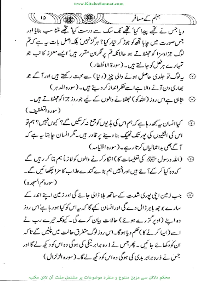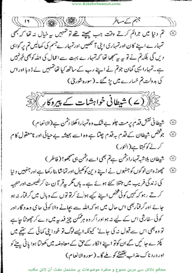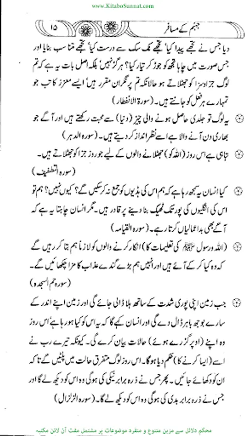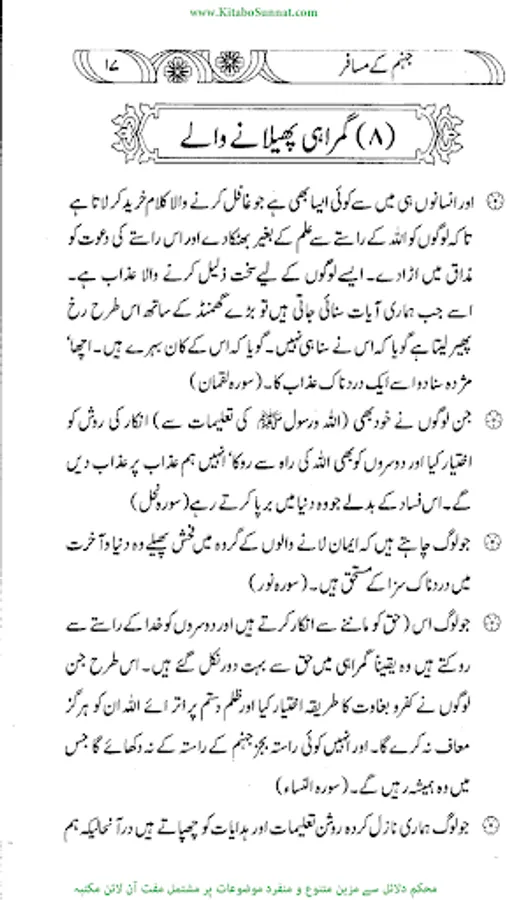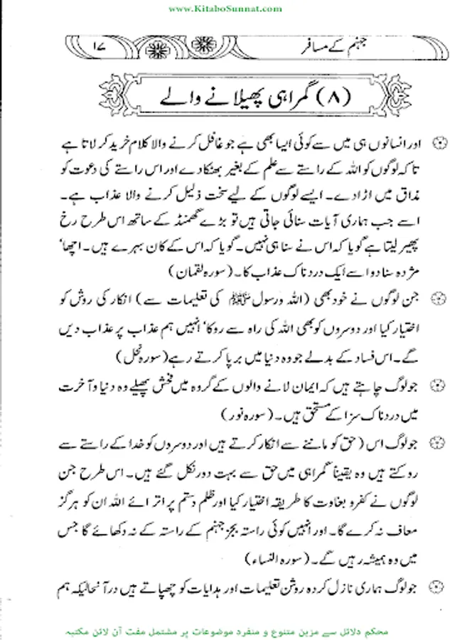 جہنم بہت ہی بری قیام گاہ،بہت ہی برا مقام اور بہت ہی برا ٹھکانہ ہےجسے اللہ تعالی نے کافروں،منافقوں،مشرکوں اور فاسقوں وفاجروں کے لئے تیار کر رکھا ہے۔اللہ تعالی نے قرآن مجید میں جنت اور جہنم دونوں کا بار بار تذکرہ فرمایا ہے۔اور جہنم کا تذکرہ نسبتا زیادہ کیا ہے۔اس کی وجہ شاید یہ ہو کہ انسانوں کی اکثریت ترغیب سے زیادہ ترہیب کو قبول کرتی ہے۔جہنم وہ ہولناک اور المناک عقوبت خانہ ہے جس کی ہولناکی کا اندازہ لگانا دنیوی زندگی میں محال ہے۔انسان كو اپنی اس عارضی اور دنیاوی زندگی میں جہنم سے آزادی کا سامان کرنا چاہیے اور جہنم کی طرف لے جانے والے راستوں سے اجنتاب کرنا چاہیے ۔ زیر نظر کتاب ’’جہنم کے مسافر ‘‘ محترم جناب پروفیسر نور محمد چودہری کی مختصر سی تالیف ہے ۔ اس کتاب میں انہوں نے سفرجہنم کے ہولناک نتائج سے بچانے کے لیے بلکہ مسافرروں کو صراط مستقیم پر لاکر ان کی عاقبت سنوارنے کے لیے کتاب اللہ اوراحادیث مبارکہ میں جو انتباہ کیے گیے ہیں ان کا اس کتاب میں اختصار سے احاطہ کیا ہے ۔ اللہ تعالیٰ اس کتاب کواہل اسلام کےلیے نفع بخش بنائے اور ہر مومن موحدکو جہنم سے آزادی اور جنت میں داخلہ نصیب فرمائے (آمین) (م۔ا).