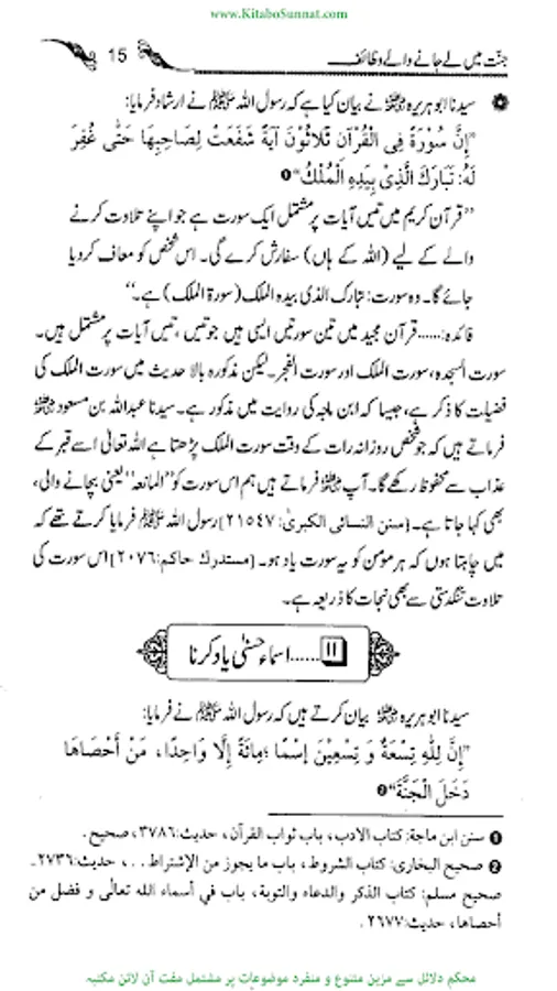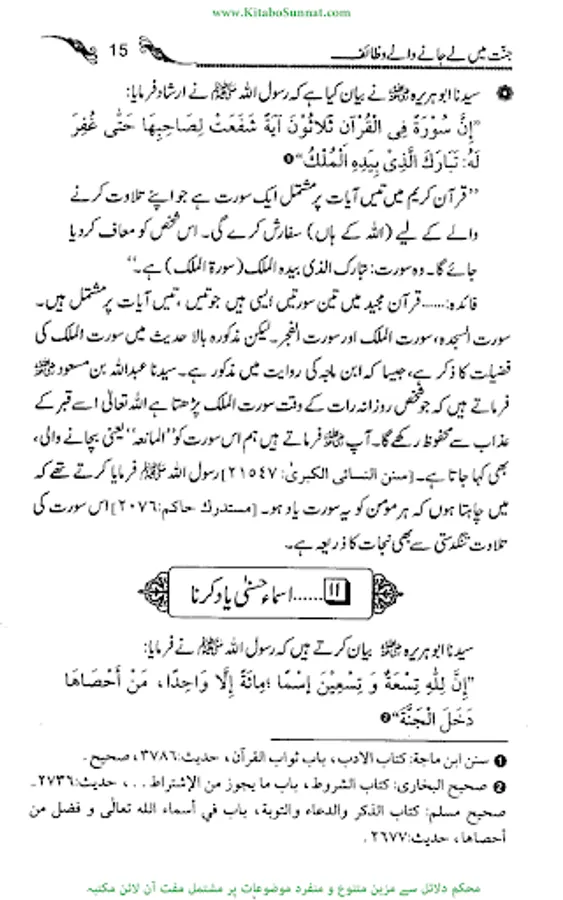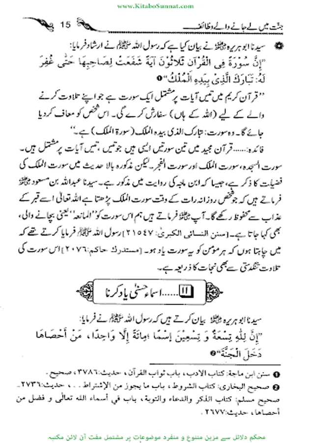 جنت اللہ کےمحبوب بندوں کا آخری مقام ہے اور اطاعت گزروں کےلیے اللہ تعالیٰ کا عظیم انعام ہے ۔ یہ ایسا حسین اور خوبصورت باغ ہے جس کی مثال کوئی نہیں ۔یہ مقام مرنے کے بعد قیامت کے دن ان لوگوں کو ملے گا جنہوں نے دنیا میں ایمان لا کر نیک اور اچھے کام کیے ہیں۔ قرآن مجید نے جنت کی یہ تعریف کی ہے کہ اس میں نہریں بہتی ہوں گی، عالیشان عمارتیں ہوں گی،خدمت کے لیے حور و غلمان ملیں گے، انسان کی تمام جائز خواہشیں پوری ہوں گی، اور لوگ امن اور چین سے ابدی زندگی بسر کریں گے۔نبی کریم ﷺنے فرمایا ہے کہ:’’جنت میں ایسی ایسی نعمتیں ہیں جنھیں کسی آنکھ نے دیکھا نہیں نہ کسی کان نے ان کی تعریف سنی ہے نہ ہی ان کا تصور کسی آدمی کے دل میں پیدا ہوا ہے۔‘‘(صحیح مسلم: 2825) اور ارشاد باری تعالیٰ ہے’’ ابدی جنتوں میں جتنی لوگ خود بھی داخل ہوں گے اور ان کے آباؤاجداد، ان کی بیویوں اور اولادوں میں سے جو نیک ہوں گے وہ بھی ان کے ساتھ جنت میں جائیں گے، جنت کے ہر دروازے سے فرشتے اہل جنت کے پاس آئیں گے اور کہیں گے تم پر سلامتی ہو یہ جنت تمھارے صبر کا نتیجہ ہے آخرت کا گھر تمھیں مبارک ہو‘‘۔(سورۂ الرعدآیت نمبر: 23،24) حصول جنت کےلیے انسان کو کوئی بھی قیمت ادا کرنی پڑے تو اسے ادا کرکے اس کامالک ضرور بنے۔جنت کاحصول بہت آسان ہے یہ ہر اس شخص کومل سکتی ہے جو صدق نیت سے اس کےحصول کے لیے کوشش کرے ۔ اللہ تعالیٰ نے اسے اپنے بندوں کے لیے ہی بنایا ہے اور یقیناً اس نے اپنے بندوں کوہی عطا کرنی ہے ۔لیکن ضرورت صرف اس امر کی ہے کہ ہمیں کماحقہ اس کا بندہ بننا پڑےگا۔اور جنت میں لے جانے والے اعمال کرنا پڑیں گے ۔ زیر تبصرہ کتابچہ ’’جنت میں لے والے وظائف ‘‘ محترم جناب امان اللہ عاصم صاحب کا مرتب شدہ ہے جسے انہوں نے بڑے عام فہم انداز سے مرتب کیا ہے اور جنت میں لے جانےوالے وظائف میں ایسے اذکار مسنونہ کی نشاندہی کی ہے کہ جن کو اپنا حرز جان بنا کر حسین و جمیل دودھ وشہد کی بہتی نہروں والی جنت کے مالک بن سکتے ہیں ۔۔(م۔ا).