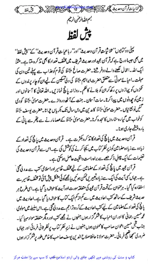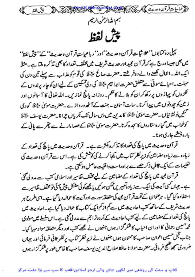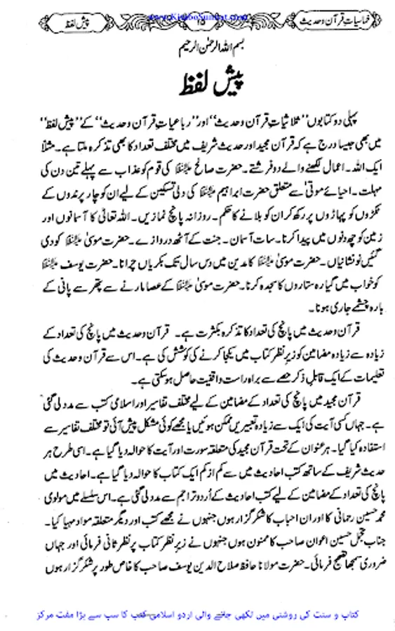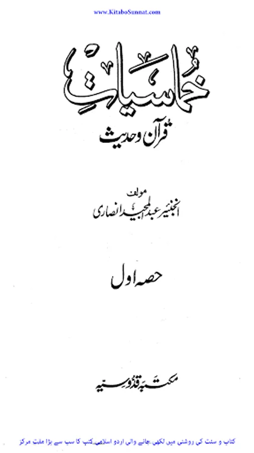 اللہ رب العزت نے اپنے بندوں کی رشد و ہدایت کے لیے اپنے برگزیدہ رسولوں اور پیغمبروں کو مبعوث فرمایا جو گمراہی اور جہالت میں ڈوبی ہوئی بنی نوع کو صراط مستقیم سے ہمکنار کرتے۔ سید الانبیاء ختمی المرتبت حضرت محمد ﷺ اللہ کے آخری نبی اور رسول ہیں۔ اللہ رب العزت نے آپ ﷺ کو قرآن جیسا عظیم معجزہ اور جوامع الکلم سے نوازہ۔ قرآن مجید امت مسلمہ کے پاس اللہ سبحانہ و تعالیٰ کا ایک عظیم تحفہ ہے۔ اس سچی اور لاریب کتاب میں گزشتہ اقوام کے واقعات اور مستقبل کی پشین گوئیاں بھی بیان کی گئی ہیں۔ یہ کتاب مقدس حق اور باطل کے درمیاں فیصلہ کرنے والی ہے۔ قرآن کریم سراپا نصیحت، حکمت و دانائی کی باتوں سے اور لبریز سیدھے راستے کی طرف راہنمائی کرنے والی کتاب ہے۔ نزول قرآن سے لے کر لمحہ موجودہ تک مختلف زاویوں سے اس کی توضیحات و تفسیرات سامنے آرہی ہیں لیکن اس کے مصارف ہیں کہ ختم نہیں ہوتے۔ اور اس اللہ تعالیٰ نے آپﷺ کو جوامع الکلم سے بھی نوازہ ہے۔ زیر نظر کتاب"خماسیات قرآن و حدیث" انجینئر عبد المجید انصاری کی ایک منفرد اور پرکشش تالیف ہے۔ اس کتاب میں موصوف نے ان چیزوں کا بیان کیا ہے جو قرآن وحدیث میں پانچ پانچ مرتبہ یا پانچ کی تعداد کے حوالے سے مذکور ہیں۔ اللہ تعالیٰ سے دعا ہے کہ وہ فاضل مولف کو اجر عظیم سے نوازے اور ان کے میزان حسنات میں اضافہ فرمائے۔ آمین(عمیر).
