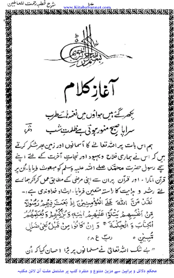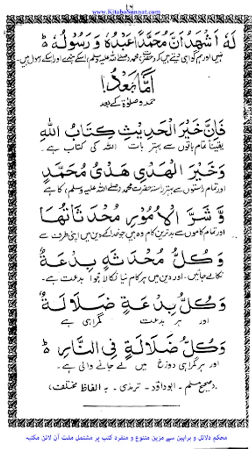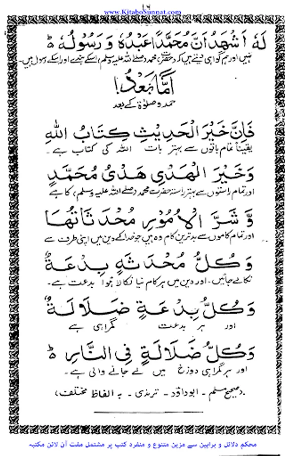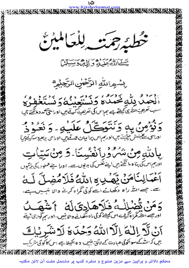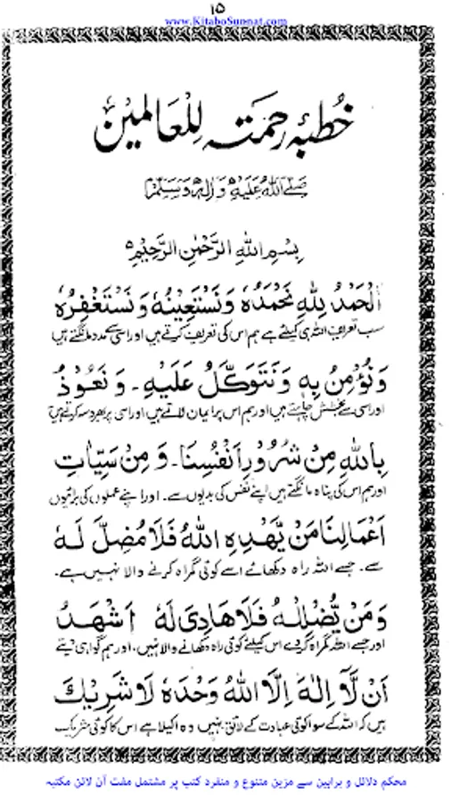سید الانبیاء خاتم النبین ﷺ جب بھی لوگوں کووعظ ونصیحت فرماتے ، عیدین ،جمعۃ المبارک اور نکاح کےموقعہ پر خطبہ ارشاد فرماتے تواس میں اللہ تعالیٰ کی تعریف کرتے ،بڑے جامع اور ہمہ گیر الفاظ میں اسلام کاخلاصہ اور نچوڑ پیش فرماتے تھے ۔لیکن امت مسلمہ آج بے شمارسنتوں کو چھوڑ کر من گھڑت رسوم ورواجات اور بدعات میں پڑی ہوئی ہے۔اور اس امر کی بڑی شدید ضرورت ہے کہ ان مردہ ہوجانے والی سنتوں کو زندہ کیا جائے،اور لوگوں کی درست طریقے سے راہنمائی کی جائے۔انہی سنتوں میں سے ایک اہم ترین سنت خطبۃ الحاجۃ ہے،جسے زندہ کرنے کی ضرورت ہے۔آج صورتحال یہ ہے کہ خطبہ مسنونہ کو چھوڑ کر خانہ ساز اور طبع ساز خطبے پیش کئے جاتے ہیں ۔اور اکثر لوگ خطبہ مسونہ کی مشروعیت اور معنویت سے نا آشنا ہیں،اور اس میں موجود تین آیات مبارکہ کی حکمتوں اور معانی سے ناواقف ہیں۔ زیرتبصرہ کتاب ’’شرح خطبہ رحمۃ للعالمین ‘‘ مولانا محمد صادق سیالکوٹی کی تصنیف ہے۔ اس میں انہوں نے رسول اللہ ﷺ کے اس پاکیزہ ، نورانی جامع اور ہمہ گیر خطبے کی تشریح پیش کی ہےجو رحمت عالم اپنے ہر وعظ اور تذکیر کےشروع میں پڑھا کرتے تھے ۔مصنف موصوف نےوحی جلی اور وحی خفی کےاستشہاد سے اس کےمطالب و معانی کواچھی طرح واضح کیا ہے تاکہ مسلمان اس مبارک خطبہ کوسمجھ سکیں۔(م۔ا).