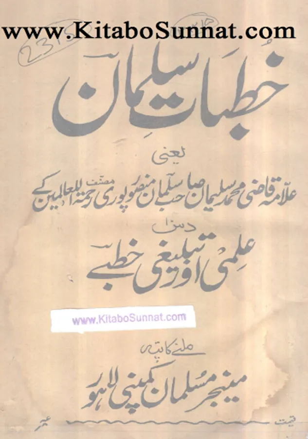خطابت اللہ تعالیٖ کی عطا کردہ، خاص استعداد کا نام ہے جس کے ذریعے ایک مبلغ اپنے ما فی الضمیر کے اظہار، اپنے جذبات و احساسات دوسروں تک منتقل کرنے اور عوام الناس کو اپنے افکار و نظریات کا قائل بنانے کے لیے استعمال کرتا ہے۔ جو خطیب کتاب و سنت کے دلائل و براہینسے مزین وعظ کرتا ہے اس کی بات میں وزن ہوتا ہے جس کا سامعین کے روح و قلب پر اثر پڑتا ہے۔ اور خطبہ جمعہ کوئی عام درس یا تقریر نہیں بلکہ ایک اتہائی اہم نصیحت ہے جسے شریعتِ اسلامیہ میں فرض قرار دیا گیا ہے۔جس کے پیشِ نظر بہت سی کتابیں خطبات کے نام سے لکھی جا چکیں ہیں۔ زیرِ تبصرہ کتاب ’’خطبات سلیمان‘‘ عبد المجید خادم عفی عنہ نے مولاناسید قاضی سلیمان رحمۃ اللہ کے علمی و تبلیغی خطبے جمع کئے ہیں ۔ جو کہ ریاست پٹیالہ کے سیشن جج ہونے کے ساتھ ساتھ ایک عظیم سیرت نگار،محدث، مؤرخ ، جلیل القدرعالم اورمنفردادیب تھے۔ان کے قلم گوہر بارسے کتنی شہرہ آفاق کتابیں منصہ مشہودپرآئیں۔ رحمۃ للعالمین بھی سیدصاحب کی ایک بے مثال کتاب ہے ،جس میں موصوف نے سیرت نبوی ہی کو موضوع بنایاہے اوربڑے ہی ادبی وعلمی انداز سے رسول اکرم ﷺ کی حیات طیبہ کے مختلف پہلوؤں کو اجاگرکیاہے۔ زیرِ تبصرہ کتاب میں دس(10) علمی اور تبلیغی خطبے ہیں ،جن میں متعدد اور متنوع جہات پربحث کی گئی ہے ۔اگر اس کتاب کا آپ مطالعہ کریں گے تو معلوم ہو گا کہ ان خطبوں میں کتنا علمی مواد موجود ہےاور یہ کتاب مبلغین، واعظین اور عوام کے لئے بہترین تحفہ ہے۔ اللہ تعالیٰ صاحب تصنیف کی خدمت کو قبول فرمائے اور قاضی صاحب مرحوم کو جنت الفردوس میں اعلیٰ مقام سے نوازے۔ آمین۔ (رفیق).
