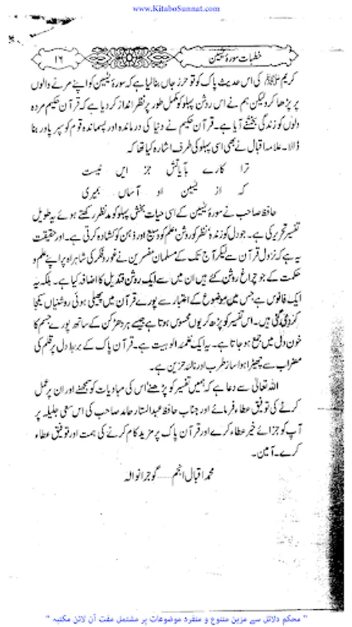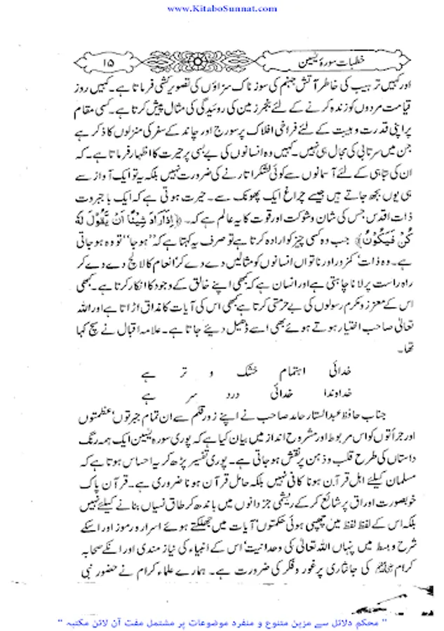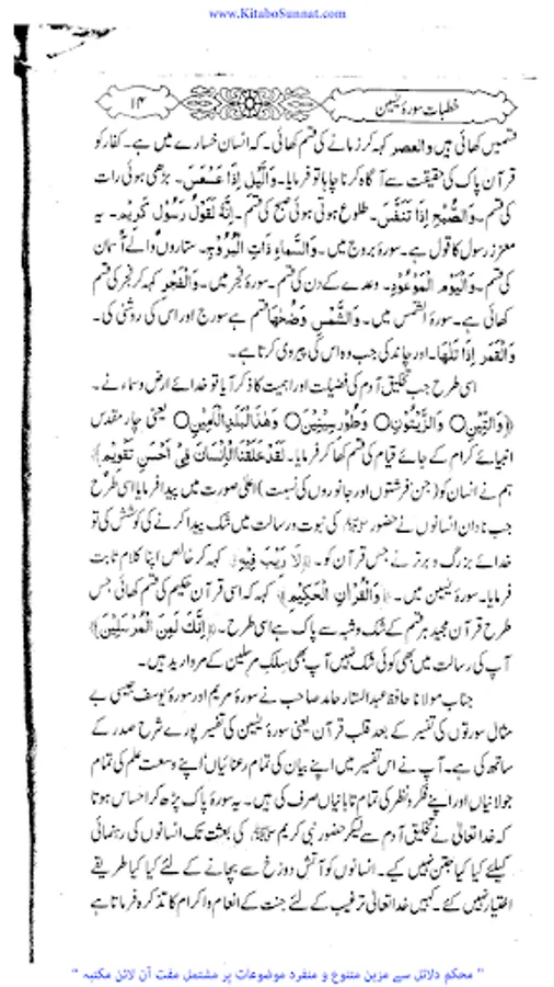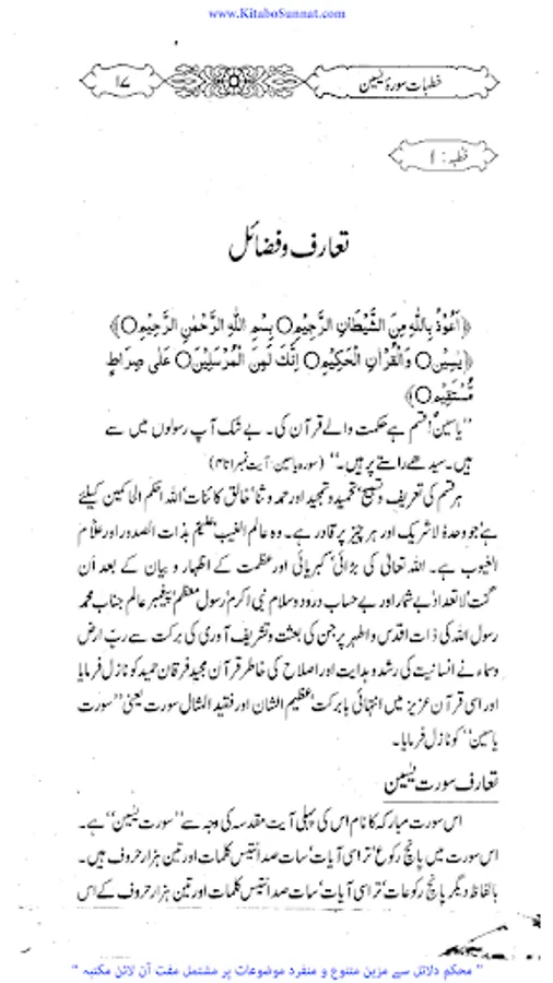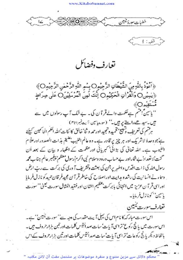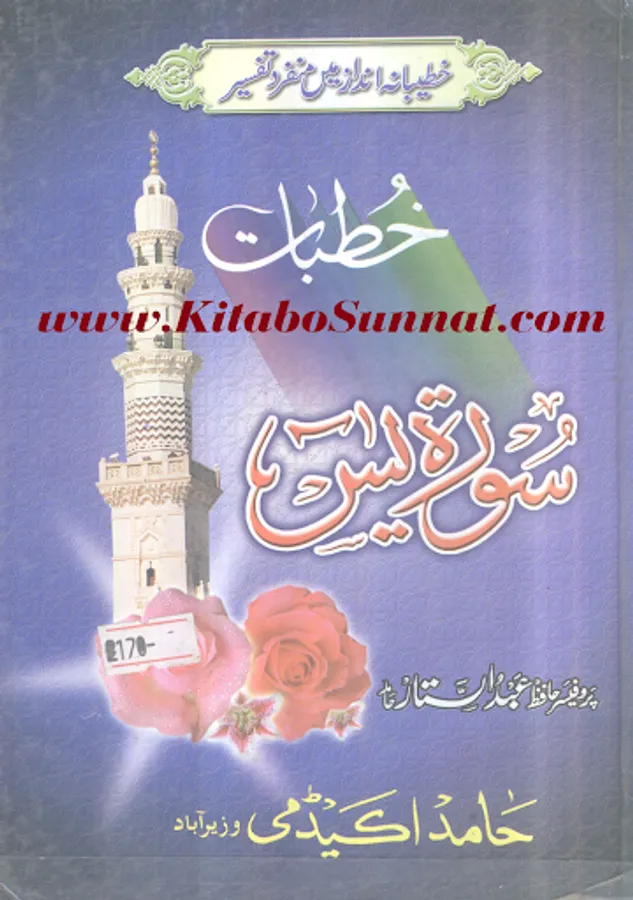 سورۃیٰسین مکی سورت ہے اس سورۃکا آغاز “ی” (یا) اور “س” (سین) دو حرفوں سے ہوا ہے اس مناسبت سے اس کا نام سورہ یٰس ہے۔اس کے مضامین سے اندازہ ہوتا ہے کہ مکہ کے درمیانی دور کے اخیر میں نازل ہوئی ہو گی۔سورۃ یٰسین کا مرکزی مضمون آخرت کے انجام سے خبردار کرنا ہے اس طور سے کہ غفلت میں پڑے ہوئے لوگ جاگ اٹھیں اور انہیں اپنے مستقبل اور اپنی نجات کی فکر دامن گیر ہو۔ رسول کی بعثت اسی لیے ہوتی ہے کہ وہ خبردار کرنے کا یہ فریضہ انجام دے۔اس سورت کی فضلیت کے متعلق کتب احادیث میں متعدد احادیث موجود ہیں لیکن اسناد کے اعتبار سے یہ صحت کے درجہ کو نہیں پہنچتیں۔ اور یہ بات بھی ثابت نہیں ہے کہ صحابہ اس سورہ کو کسی شخص کی جانکنی کے موقع پر پڑھا کرتے تھے۔ زیر تبصرہ کتاب ’’ خطبات سورۃ یٰسین ‘‘پروفیسر حافظ عبد الستار حامد ﷾ کے سورۃ ’’ یٰسین‘‘ کے متعلق تفسیری خطبات جمعۃ المبارک کامجموعہ ہے ۔موصوف نے ان خطبات کاآغاز مارچ 1993ء میں جامع مسجد توحید اہل حدیث وزیر آباد میں کیا اور 12 خطبات میں اس سورۃ مبارکہ کی تشریحات ، توضیحات وتفسیر کو خطبا ت جمعہ میں مکمل بیان کیا ہے ۔ فاضل مصنف نے اس کتاب میں ہر واقعہ، ہر حدیث اور ہربات مستند اور باحوالہ تحریرکرنے کی کوشش کی ہے ۔خطیبانہ انداز میں یہ سورۃیٰسین کی منفرد تفسیر ہے ۔ (م۔ا).