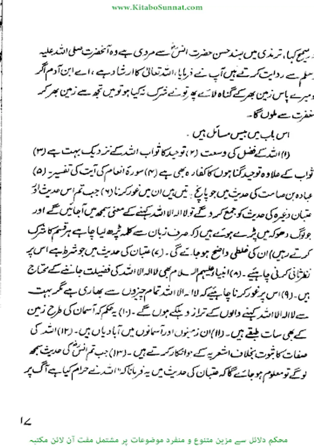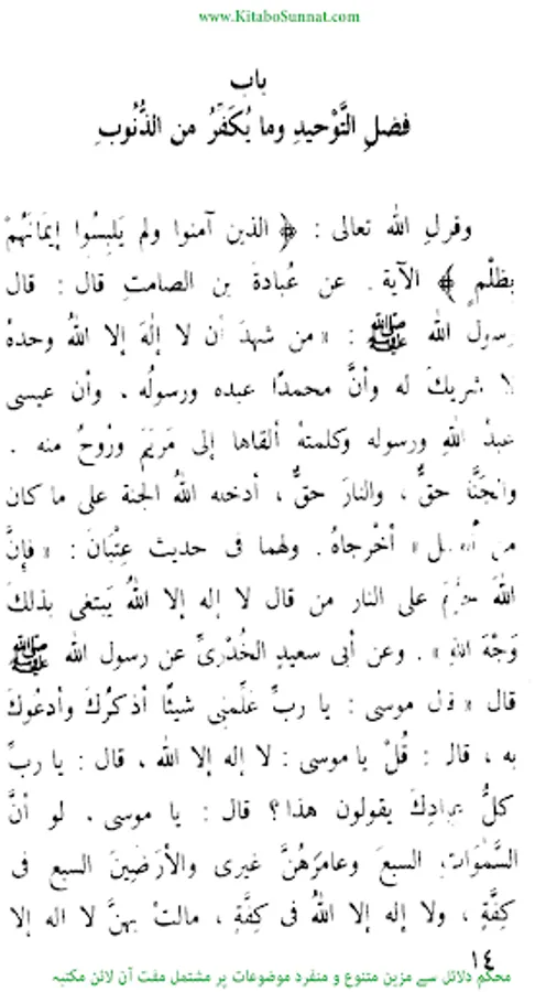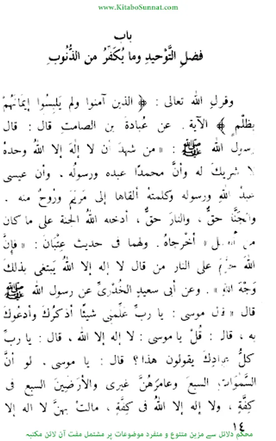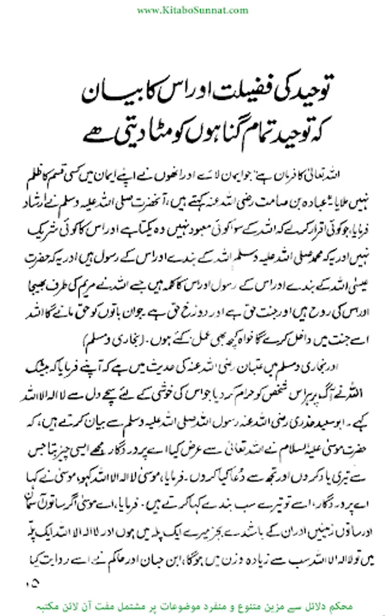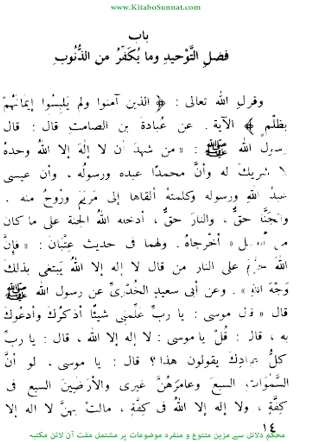 تمام انبیاء کرام ایک ہی پیغام اورایک ہی دعوت لےکر آئےکہ لوگو! صرف اللہ کی عبادت کرو او راس کےسوا تمام معبودوں سےبچو۔تمام انبیاء کرام سالہاسال تک مسلسل اس فریضہ کو سرانجام دیتے رہے انھوں نے اس پیغام کو پہنچانےکےلیے اس قدر تکالیف برداشت کیں کہ جسکا کوئی انسان تصور بھی نہیں کرسکتاہے ۔ حضرت نوح نے ساڑے نوسوسال کلمۂ توحید کی طرف لوگوں کودعوت دی ۔ اور اللہ کے آخری رسول سید الانبیاء خاتم النبین حضرت محمد مصطفیٰ ﷺ نےبھی عقید ۂ توحید کی دعوت کے لیے کس قدر محنت کی اور اس فریضہ کو سر انجام دیا کہ جس کے بدلے آپ ﷺ کو طرح طرح کی تکالیف ومصائب سے دوچار ہوناپڑا۔ عقیدہ توحید کی تعلیم وتفہیم کے لیے جہاں نبی کریم ﷺ او رآپ کے صحابہ کرا م نے بے شمار قربانیاں دیں اور تکالیف کو برداشت کیا وہاں علمائے اسلام نےبھی دن رات اپنی تحریروں اور تقریروں میں اس کی اہمیت کو خوب واضح کیا ۔ہنوز یہ سلسلہ جاری وساری ہے۔ زیر تبصرہ کتاب ’’ کتاب التوحید مترجم ‘‘ امام محمد بن سلیمان التمیمی کی عقیدہ توحید پر تصنیف شدہ کتاب التوحید کااردو ترجمہ ہےاردو ترجمہ کی سعاد ابو عبداللہ محمد سورتی نے حاصل کی ۔کتاب وسنت سائٹ پرشیخ الاسلام محمد بن عبدالوہاب کی عقیدہ توحید پر مشہور کتاب کتاب التوحیداور اس موضوع پر دیگر کئی کتب موجود ہیں لیکن کتاب ہذا موجود نہ تھی لہذا فادۂ عام او راسے محفوظ کرنے کی خاطر اسے بھی سائٹ پر پبلش کیا گیا ہے۔(م۔ا).
