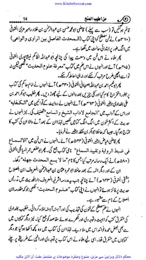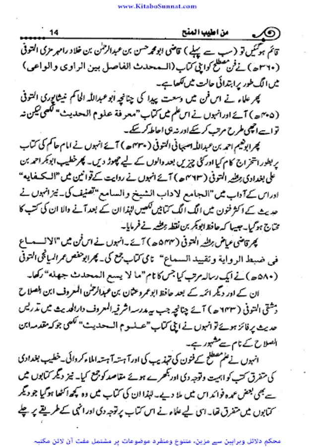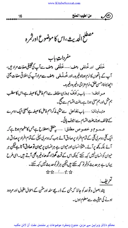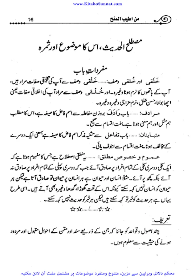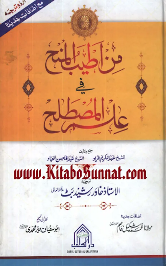 علم حدیث سے مراد ایسے قاعدوں اور ضابطوں کا علم ہے جن کے ذریعے سے کسی بھی حدیث کے راوی یا متن کے حالات کی اتنی معرفت حاصل ہوجائے کہ آیا راوی یا اس کی حدیث قبول کی جاسکتی ہے یا نہیں۔اور علم اصولِ حدیث ایک ضروری علم ہے ۔جس کے بغیر حدیث کی معرفت ممکن نہیں احادیث نبویہ کا مبارک علم پڑہنے پڑھانے میں بہت سی اصطلاحات استعمال ہوتی ہیں جن سے طالب علم کواگاہ ہونا از حدضرورری ہے تاکہ وہ اس علم میں کما حقہ درک حاصل کر سکے ، ورنہ اس کے فہم وتفہیم میں بہت سے الجھنیں پید اہوتی ہیں۔جس طرح گرائمر کے بغیر عربی زبان سمجھنا دشوار ہے بعینہٖ علم حدیث میں مہارت تامہ ، اصول حدیث میں کماحقہ دسترس رکھے بغیر ناممکن ہے ۔ اس موضوع پر ائمہ فن وعلماء حدیث نے مختصر ومطول بہت سے کتابیں تصنیف فرمائی ہیں۔ان میں سے سب سےمختصر ، جامع اور آسان شیخ عبد الکریم مراد ،شیخ عبد المحسن العباد کی مرتب شدہ زیر تبصرہ کتاب ’’ من اطیب فی علم المصطلح‘‘ ہے یہ کتاب اپنی افادیت واہمیت کے باعث مدینہ یونیورسٹی اور پاک وہند کے اہم مدارس میں شامل نصاب ہے ۔یہ چونکہ عربی زبان میں ہے جس عام آدمی مستفید نہیں ہوسکتا تھا۔اسی ضرورت کے پیش نظر محترم مولانا خاور رشید بٹ ﷾(مدرس جامعہ لاہور الاسلامیہ ،لاہور ودارالعلوم المحمدیہ ،لاہور ) نے اسے اردو قالب میں ڈھالا ہے ۔مترجم موصوف نے عربی عبارت کو مد نظر رکھتے ہوئے بے حد آسان اور عام فہم وبامحاورہ ترجمہ کا التزام کیا ہے اور ہر بحث سے پہلے مفردات باب کے نام سے مشکل الفاظ کے معانی وصیغے حل کیے ہیں،طلباء کےلیے مشقی سوالات مختلف انداز میں ترتیب دیئے گئے ہیں تاکہ طلبہ اسے آسانی سے سمجھ سکیں۔(م۔ا).