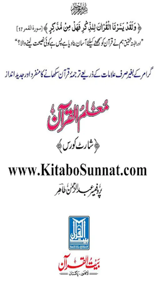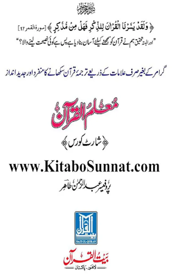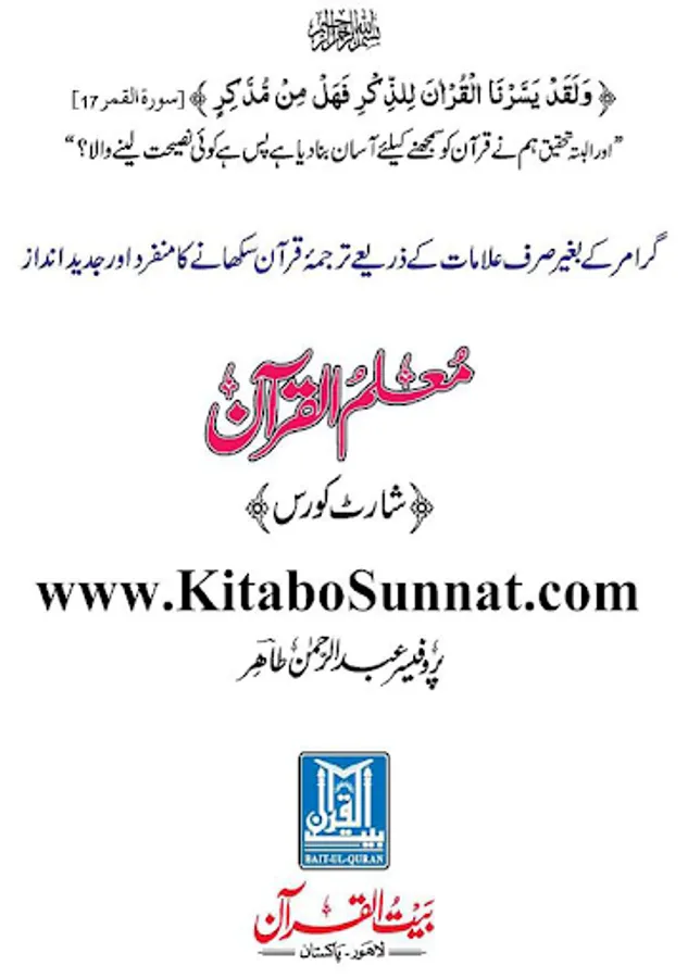 قرآن فہمی کو آسان تر بنانے کےلیے پروفیسر عبدالرحمٰن طاہر نے ’مفتاح القرآن‘ اور ’مصباح القرآن‘ کے نام سے جدید اور منفرد نظام متعارف کرایا۔ اس کے بعد انھوں نے زیر نظر کتاب کی صورت میں اسی طریقہ کار پر مبنی ایک ایسا شارٹ کورس مرتب کیا ہے جو عام لوگوں کو قرآن فہمی کی طرف راغب کرنےاور سکولوں اور کالجز کے طلبہ و طالبات کو ان کے ترجمہ قرآن کےنصاب کو آسان طریقے سے سمجھانے میں ان کی مدد دے گا۔ اس میں ’مفتاح القرآن‘ میں پیش کردہ بعض ضروری علامات کو بیان کیا گیا ہے،طوالت سے بچنے کے لیے قرآنی آیات کو ختم کر کے علامات والی قرآنی مثالوں کو ذکر کیا گیا ہے۔ ہر سبق کے آخر میں اس جدید طریق سے نماز کا ترجمہ سمجھانے کے لیے نماز کے اسباق کو بھی شامل کیا گیا ہے۔ آخر میں علامات کو رنگ دے کر چند منتخب آیات بطور نصاب درج کی گئی ہیں اور ان آیات کو پڑھنے کا جدید طریقہ سمجھانے کے لیے نمونے کے دو سبق درج کر کے اساتذہ کی رہنمائی کی گئی ہے (ع۔م).
