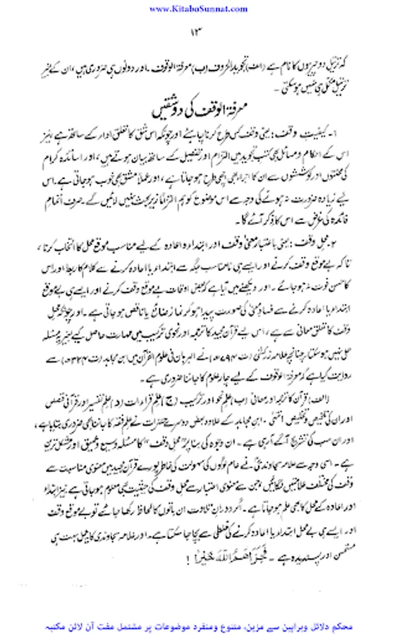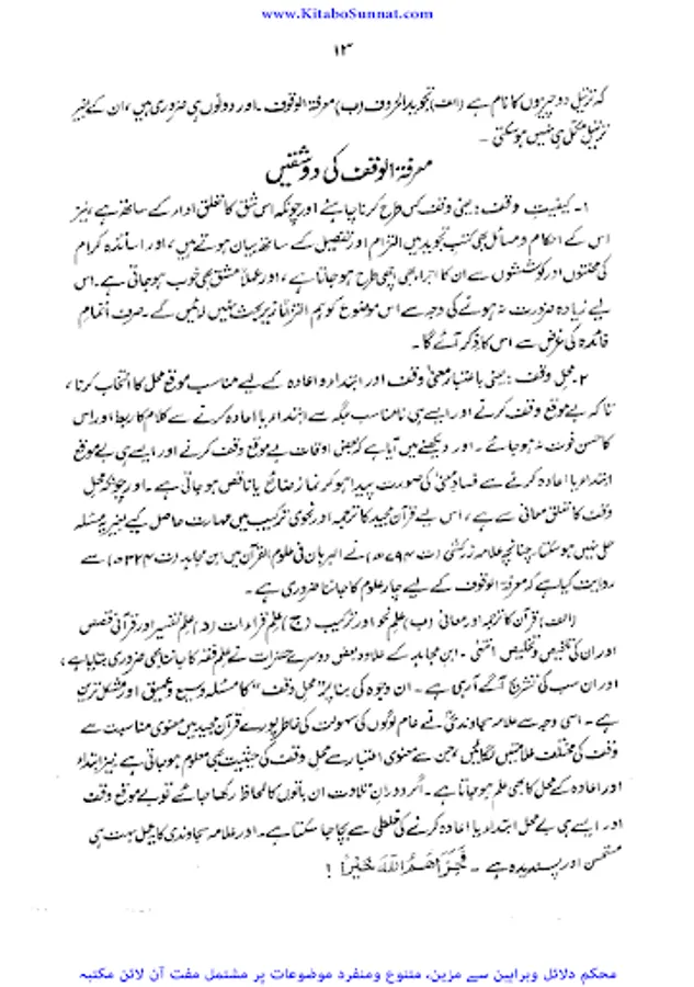 وقف کا لغوی معنی ٹھہرنا اور رُکنا ہے۔ جبکہ اہل فن قراء کرام کی اصطلاح میں وقف کے معنی ہیں کہ"کلمہ کے آخر پر اتنی دیر آواز کو منقطع کرنا جس میں بطور عادت سانس لیا جاسکے، اور قراء ت جاری رکھنے کا ارادہ بھی ہو، عام ہے کہ وقف کرنے کے بعد مابعد سے ابتداء کریں یا ماقبل سےاعادہ" (النشر:۱؍۲۴۰) معرفت وقف وابتداء کی اہمیت اور اس علم کی ضرورت کااحساس کرنے کے لئے اتنا ہی کافی ہے کہ جس طرح دلائل شرعیہ یعنی قرآن وحدیث اور اجماع اُمت سےقرآن مجید کا تجوید کے ساتھ پڑھنا واجب اور ضروری ہے، اسی طرح معرفت الوقف، یعنی قرآنی وقوف کو پہچاننا اور دورانِ تلاوت حسنِ وقف وابتداء کی رعایت رکھنا اور اس کا اہتمام کرنا بھی ضروری ہے اوراس میں کسی کااختلاف نہیں ۔اوروجہ اس کی یہ ہے کہ جس طرح تجوید کے ذریعہ حروف قرآن کی تصحیح ہوتی ہے اسی طرح معرفت الوقوف کے ذریعے معانی قرآن کی تفہیم ہوتی ہے۔ اللہ تعالیٰ نے قرآن مجید کو ترتیل کے ساتھ پڑھنے کا حکم دیا ہے :’’اورقرآن مجید کوترتیل کے ساتھ پڑھو ۔‘‘(المزمل:4) سیدنا علی سے ترتیل کا معنی پوچھا گیا توآپ نے فرمایا:’’الترتیل ہو تجوید الحروف ومعرفۃ الوقوف‘‘(الإتقان فی علوم القرآ ن:۱؍۸۵) اس تفسیر میں ترتیل کے دوجز بیان کیے گئے ہیں 1۔تجوید الحروف 2۔معرفۃ الوقوف ۔پس تجوید الحروف کی طرح معرفۃ الوقوف بھی ترتیل کا ایک جزء اور اس کا ایک حصہ ہے ۔ زیر تبصرہ کتاب" معلم الاداء فی الوقف والابتداء "محترم قاری محمد تقی الاسلام صاحب کی تصنیف ہے،جس میں انہوں علم وقف کی علمی وفنی مباحث کو جمع فرمادیا ہے۔ اللہ تعالی ان کی اس خدمت کو اپنی بارگاہ میں قبول فرمائے اور ان کے میزان حسنات میں اضافہ فرمائے۔آمین(راسخ).