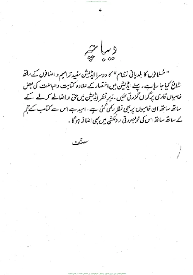 کسی بھی مضبوط جمہوری نظام میں بلدیاتی اداروں کی بہت اہمیت ہوتی ہے۔ قیام پاکستان کے بعد 1959ء میں پہلی بار جنرل ایوب خان کے دور میں بلدیاتی جمہوریتوں کا نظام متعارف کرایا گیا۔ جسے بعدازاں 1962 ء کے دستور میں شامل کیا گیا۔ بنیادی جمہوریتوں کے اس نظام پر دس ہزار کی آباد ی پر مشتمل یونین کونسل سب سے نچلے درجے کی مقامی کونسل تھی۔ یونین کونسل کے ارکان میں دس منتخب اور 5 نامزد ہوتے تھے جنہیں بی ڈی ممبر کہا جاتا تھا۔ یونین کونسل کا سربراہ چیئرمین کہلاتا تھا۔ یونین کونسل کے دائرہ کار میں مقامی سطح پر امن و امان کے قیام اور زراعت کی ترقی میں کردار ادا کرنا اور مقامی آبادی کے مختلف مسائل حل کرنا تھے ۔ مقامی منصوبوں کیلئے یونین کونسل ٹیکس عائد کرنے کی مجاز ہوتی تھی ۔ صدر پاکستان کے انتخابات کیلئے یہی ارکان ووٹ ڈالتے تھے ۔ اسی طرح تحصیل کونسل اور ضلع کونسل کے ادارے اپنے اپنے دائرہ کار میں ڈپٹی کمشنر کی نگرانی میں کام کرتےتھے۔ 1969ء میں ایوب خان کی حکومت کی رخصتی کے ساتھ یہ نظام بھی رخصت ہو گیا۔ دوسری بار لوکل گورنمنٹ سسٹم جنرل ضیاء الحق نے 1979ء میں نافذ کیا جس کے مطابق شہری اور دیہی دو طرح کے ادارے وجود میں آئے۔ شہروں میں ٹاؤن کمیٹی، مپونسپل کمیٹی، میونسپل کارپوریشن اور میٹرو پولیٹن کارپوریشن وجود میں آئیں اور دیہی سطح پر یونین کونسل، تحصیل کونسل اور ضلع کونسل کے ادارے وجود میں آئے۔ ان اداروں کے ارکان کا انتخاب بالغ رائے دہی کی بنیاد پر ہوتا جو کہ اپنے میئر یا چیئرمین کا انتخاب کرتے۔ تیسری بار 2001 ء میں بلدیاتی نظام پھر ایک فوجی حکمران جنرل پرویز مشرف نے نئے انداز میں دیا۔ نئے بلدیاتی نظام کے تحت تین سطح پر مقامی حکومتوں کا قیام عمل میں لایا گیا۔ ضلعی سطح پر ضلع ناظم ضلعی حکومت کا سربراہ بنایا گیا۔ اسی طرح تحصیل ناظم اور یونین کونسل ناظم اپنی اپنی سطح پر سربراہ بنے۔ ڈی سی او کو ضلع ناظم کی سربراہی میں ضلعی انتظامیہ کا سربراہ بنایا گیا جس کے ماتحت مختلف محکموں کے ای ڈی او، ڈی او اور ڈی ڈی اوز وغیرہ تھے۔ زیر نظر کتاب ’’مسلمانوں کابلدیاتی نظام ‘‘ مشتاق اے چوہدری کی اس موضوع پر اولین کاوش ہے ۔پاکستان میں حکومت خود اختیاری کےتحت جو بلدیاتی نظام چل رہا ہے ۔مصنف نےاس نقطۂ نظر سے مسلمانوں کےبلدیاتی نظام پر اجمالاً بحث کی ہے ۔یہ کتاب بلدیاتی نظام کے موضوع پر متعدد اور مستند مآخذوں کا بہترین ما حاصل اور جامع خلاصہ ہے۔مؤلف نے زیر بحث موضوع پر نہایت اچھے الفاظ میں گفتگو کی ہے اور تاریخی شہادتوں سے یہ ثابت کیا ہ کہ یورپ میں جو آج بلدیاتی نظام کے نہایت اور اعلی نمونے دیکھتے کوملتے ہیں وہ اسلام ہی کی تعلیمات کا نتیجہ ہیں ۔(م۔ا).