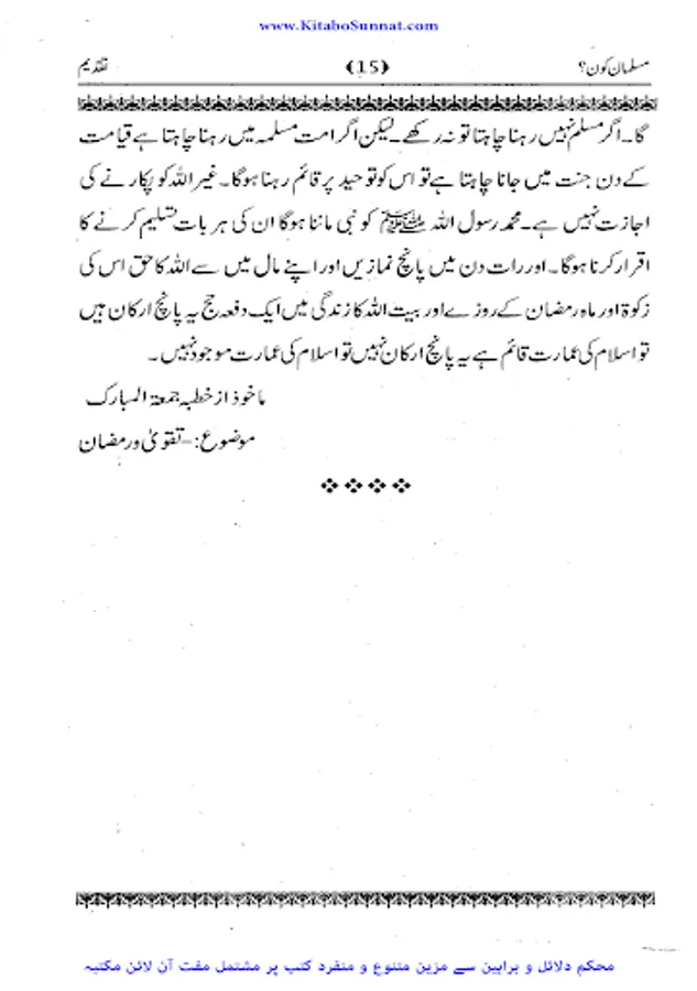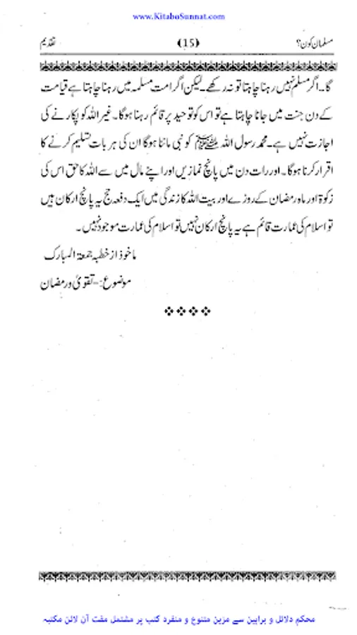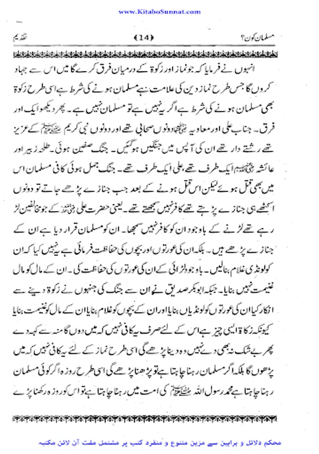 اسلام دین فطرت ہے، جو تمام انسانوں اور جنوں کے لئے نازل کیا ہے۔ دین اسلام بلا تفریق سب کی ہدایت اور بھلائی کے لئے آیاہے، جس کی تعلیمات پر عمل کر کے رحمت الہی کا حصول ممکن ہوتا ہے۔ اسلام کے متعدد محاسن اور بے شمار فوائد ہیں۔یہ عقل وفکر کو مخاطب کرتا ہے اور اسے مزید جلا بخشتا ہے۔ یہ صلاحیتوں کو منظم کر کے انسانیت کی خدمت پر آمادہ کرتا ہے۔ وحی کی روشنی میں عقل با بصیرت ہو جاتی ہے اور صرف دنیوی مفادات کے حصول کی بجائے آخرت کی تیاری میں مگن ہو جاتی ہے۔یہ اسلام ہی ہے جو نہ صرف اپنے ماننے والوں کو بلکہ اپنے منکرین کو بھی بحیثیت ان کے لا محدود حقوق ومراعات دیتا ہے ،بلکہ وہ تو حیوانات کے حقوق کا بھی پاسدار ہے اور چرند وپرند اور موسم کا بھی محافظ ہے۔ اسلام نے زندگی مرد ،عورت ،غلام ،آزاد ،آقا ،غلام سمیت تمام کے حقوق وفرائض کا تفصیل سے تذکرہ کیاہے۔اسلام ہر انسان کی فلاح وبہبود اور کامیابی کی ضمانت دیتا ہے۔ ہر انسان فطری اور طبعی طور پر کامیابی چاہتا ہے اور ناکامی سے دور بھاگتا ہے۔لیکن ایک عام انسان اس حقیقت سے ناواقف ہے کہ آخر اسے یہ کامیابی ملے گی کہاں سے۔ ہر انسان اپنی عقل وفکر کے گھوڑے دوڑا کر کامیابی تک پہنچنا چاہتا ہے۔ کوئی مال میں کامیابی تلاش کر رہا ہے تو کوئی دکان مکان میں اور کوئی سلطنت اور حکومت ،لیکن تاریخ انسانیت گواہ ہے کہ ان میں سے کسی بھی چیز میں کامیابی نہیں ہے۔کامیابی صرف اور صرف اسلام کے مطابق زندگی گزارنے میں پنہاں ہے۔ زیر تبصرہ کتاب "مسلم کون؟" محترم جاوید اقبال سیالکوٹی صاحب کی تصنیف ہےجس میں انہوں نے اسلام کی بنیادی تعلیمات کو جمع فرما دیا ہے۔ اللہ تعالی سے دعا ہے کہ وہ مولف موصوف کی اس محنت کو اپنی بارگاہ میں قبول فرمائے اور ان کے میزان حسنات میں اضافہ فرمائے۔آمین(راسخ).