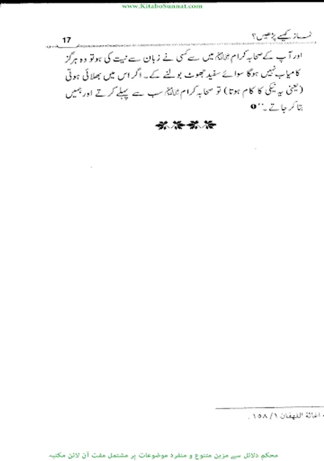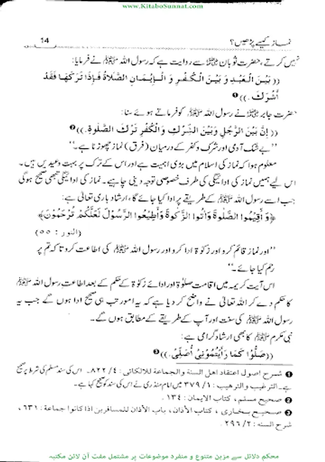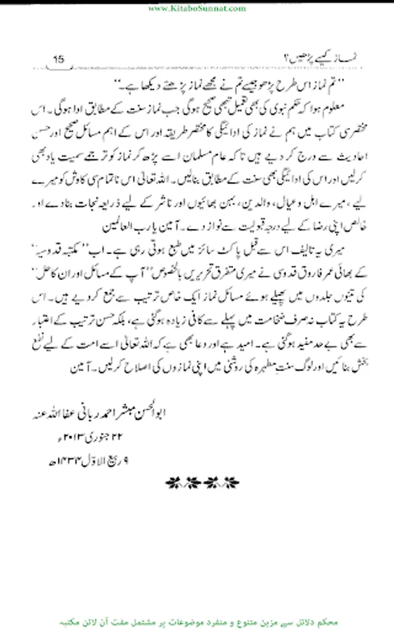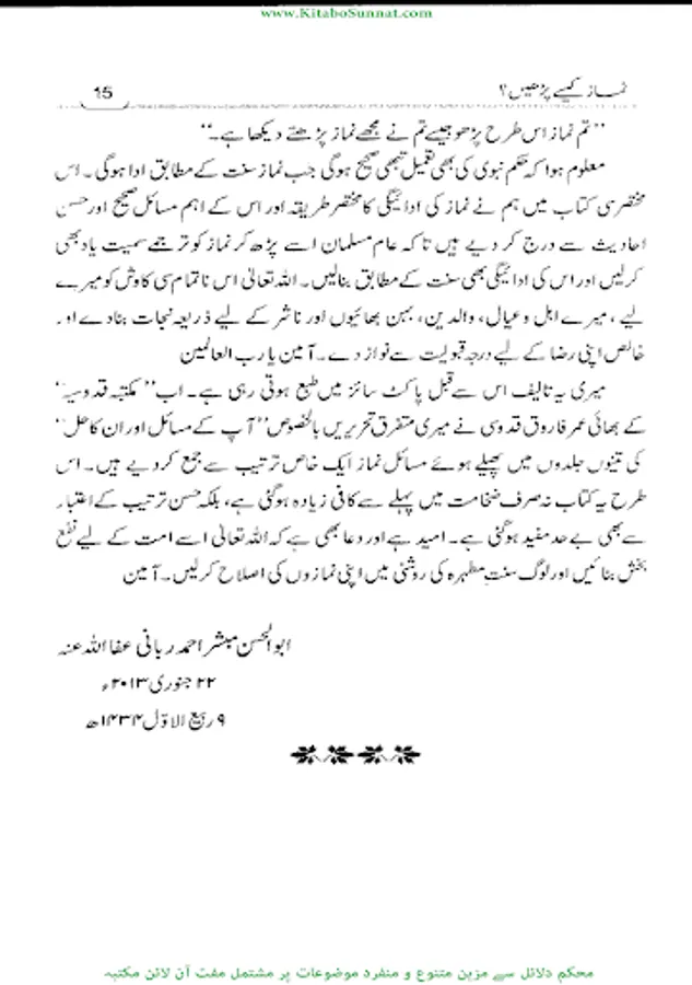 نماز انتہائی اہم ترین فریضہ اور سلام کا دوسرا رکن ِ عظیم ہے جوکہ بہت زیادہ اہمیت کا حامل ہے ۔ نماز دین کاستون ہے جس نے اسے قائم کیا اس نے دین کو قائم کیا اور جس نے اسے ترک کردیا ہے اس نے دین کی عمارت کوڈھادیا ۔ نماز مسلمان کے افضل اعمال میں سے ہے۔نماز ایک ایسا صاف ستھرا سرچشمہ ہے جس کےشفاف پانی سے نمازی اپنے گناہوں اور خطاؤں کودھوتا ہے ۔کلمہ توحید کے اقرار کےبعد سب سے پہلے جو فریضہ انسان پر عائد ہوتا ہے وہ نماز ہی ہے ۔اسی سے ایک مومن اور کافر میں تمیز ہوتی ہے ۔ بے نماز کافر اور دائرۂ اسلام سے خارج ہے ۔ قیامت کےدن اعمال میں سب سے پہلے نماز ہی سے متعلق سوال ہوگا۔ فرد ومعاشرہ کی اصلاح کے لیے نماز ازحد ضروری ہے ۔ نماز فواحش ومنکرات سےانسان کو روکتی ہے ۔بچوں کی صحیح تربیت اسی وقت ممکن ہے جب ان کوبچپن ہی سےنماز کا پابند بنایا جائے ۔ قرآن وحدیث میں نماز کو بر وقت اور باجماعت اداکرنے کی بہت زیاد ہ تلقین کی گئی ہے ۔ اور نمازکی عدم ادائیگی پر وعید کی گئی ہے ۔نماز کی ادائیگی اور اس کی اہمیت اور فضلیت اس قد ر اہم ہے کہ سفر وحضر اور میدان ِجنگ اور بیماری میں بھی نماز ادا کرنا ضروری ہے ۔نماز کی اہمیت وفضیلت کے متعلق بے شمار احادیث ذخیرۂ حدیث میں موجود ہیں او ر بیسیوں اہل علم نے مختلف انداز میں اس موضوع پر کتب تالیف کی ہیں ۔ نماز کی ادائیگی کا طریقہ جاننا ہر مسلمان مرد وزن کےلیے ازحد ضروری ہے کیونکہ اللہ عزوجل کے ہاں وہی نماز قابل قبول ہوگی جو رسول اللہ ﷺ کے طریقے کے مطابق ادا کی جائے گی ۔او ر ہمارے لیے نبی اکرم ﷺکی ذات گرامی ہی اسوۂ حسنہ ہے ۔انہیں کے طریقے کےمطابق نماز ادا کی جائے گئی تو اللہ کے ہاں مقبول ہے ۔ اسی لیے آپ ﷺ نے فرمایا صلو كما رأيتموني اصلي لہذا ہر مسلمان کےلیے رسول للہ ﷺ کے طریقۂ نماز کو جاننا بہت ضروری ہے۔ زیرتبصرہ کتاب’’نماز کیسے پڑھیں‘‘ وطن عزیز کی معروف علمی شخصیت مفتی جماعت فضیلۃ الشیخ مولانامبشراحمد ربانی ﷾ کی نماز کی اہمیت ، احکام ومسائل پر مشتمل تصنیف ہے۔شیخ نے اس مختصر سی کتاب میں ماز کی ادائیگی کا مختصر طریقہ اور اس کے اہم مسائل صحیح اور حسن احادیث سے درج کردئیے ہیں تاکہ عام مسلمان اسے پڑھ کر نماز کو ترجمے سمیت یاد بھی کرلیں اورنماز کی ادائیگی بھی سنت کے مطابق کریں۔اللہ تعالیٰ شیخ محترم کی تمام علمی وتحقیقی،تدریسی وتبلیغی خدمات کو شرف قبولیت سےنوازے اور اس کتاب کو لوگو ں کےلیے نفع بخش بنائے ۔(آمین)( راسخ ).
