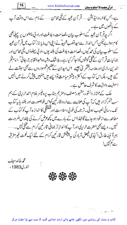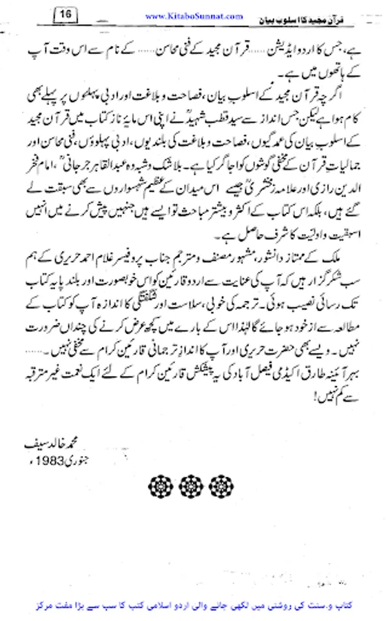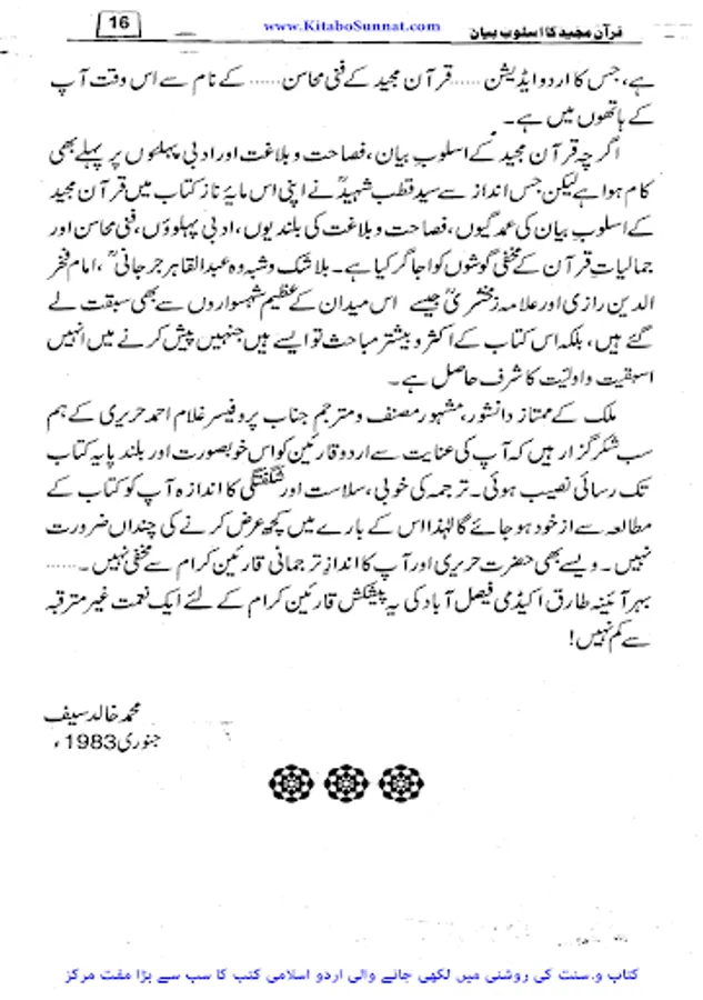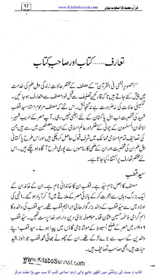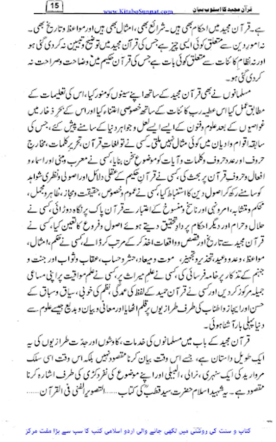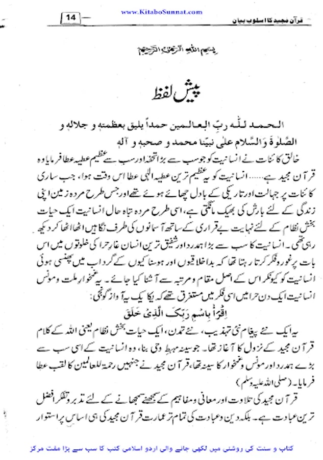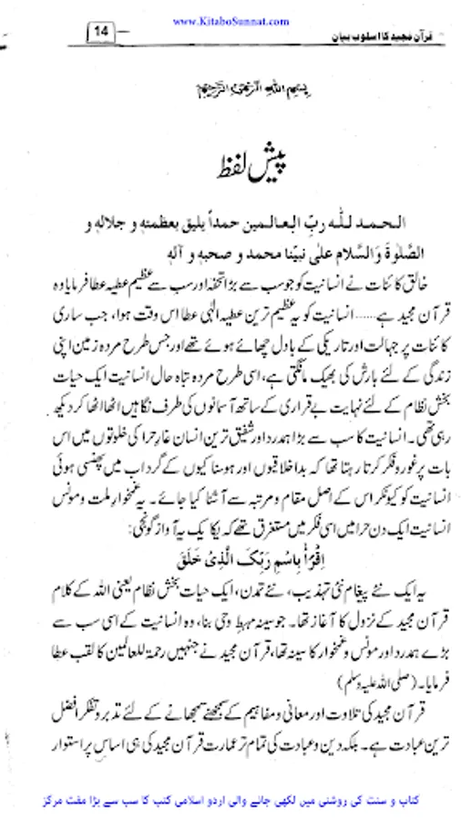 خالق کائنات نے انسانیت کو جو سب سے بڑا تحفہ اور سب سے عظیم عطیہ عطا فرمایا وہ قرآن مجید ہے۔ انسانیت کو یہ عظیم ترین عطیہ الہٰی عطا اس وقت ہوا، جب ساری کائنات پر جہالت اور تاریکی کے بادل چھائے ہوے تھے ،اور جس طرح مردہ زمین اپنی زندگی کے لئے بارش کی بھیک مانگتی ہے، اسی طرح مردہ تباہ حال انسانیت ایک حیات بخش نظام کے لئے نہایت ہی بے قراری کے ساتھ آسمان کی طرف نگاہیں اٹھا اٹھا کر دیکھ رہی تھی۔انسانیت کا سب سے بڑا ہمدرد اور شفیق ترین انسان غار خرا کی خلوتوں میں اس بات پر غور وفکرکرتا رہتا تھا کہ بد اخلاقیوں اور ہوسناکیوں کے کرداب میں پھنسی ہوئی انسانیت کو کیونکر اس کے اصل مقام ومرتبہ سے آشنا کیا جائے۔ یہ غمخوار ملت ومونس انسانیت ایک دن غار حرا میں اسی فکر میں مستغرق تھے کہ یکا یک یہ آواز گونجی: ’’اقْرَأْ بِاسْمِ رَبِّكَ الَّذِي خَلَقَ ‘‘یہ ایک نئے پیغام نئی تھذیب، نئے تمدن، ایک حیات بخش نظام یعنی اللہ کے کلام قرآن مجید کے نزول کا آغاز تھا۔جو سینہ مہبط وحی بنا،وہ انسانیت کے اسی سبب سے بڑے ہمدرد اور مونس و غمخوار کا سینہ تھا، قرآن مجید نے جنہیں رحمت للعالمین کا لقب عطا فرمایا۔ زیر تبصرہ کتاب’’قرآن مجید کا اسلوب بیان‘‘فاضل مصنف سید قطب شہید کی تصنیف کردا ہے جس میں انہوں نے قرآن مجید کے اسلوب بیان، فصاحت وبلاغت اور ادبی پہلوں پر نہایت علمی انداز سے اس کتاب کو تصنیف کیا ہے۔ اللہ رب العزت سے دعا کرتے ہیں کہ اللہ فاضل مصنف کو اس کار خیر پر اجرے عظیم سے نوازے۔ آمین(شعیب خان).