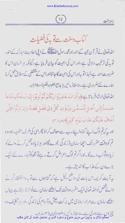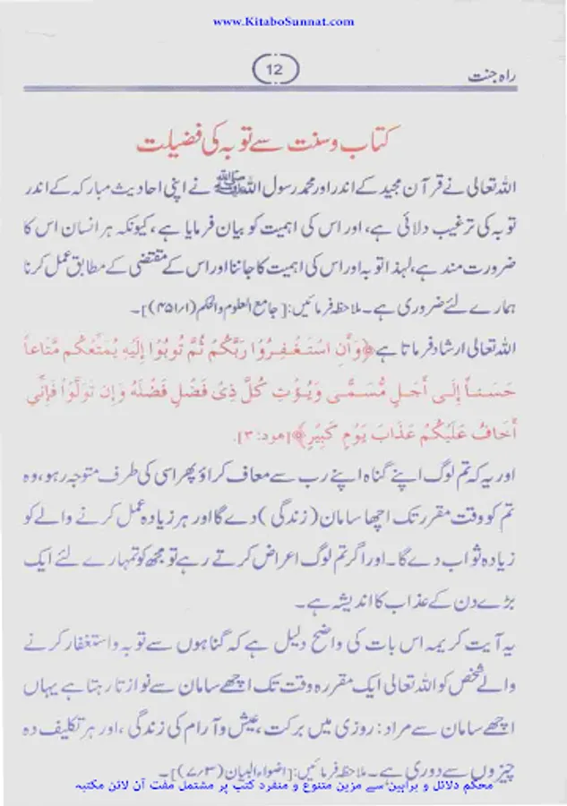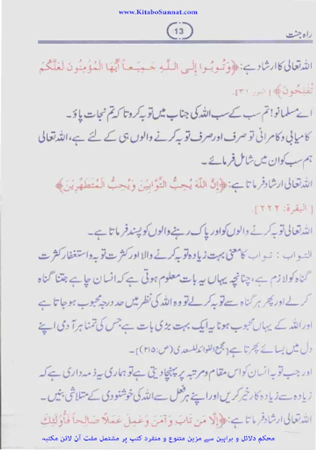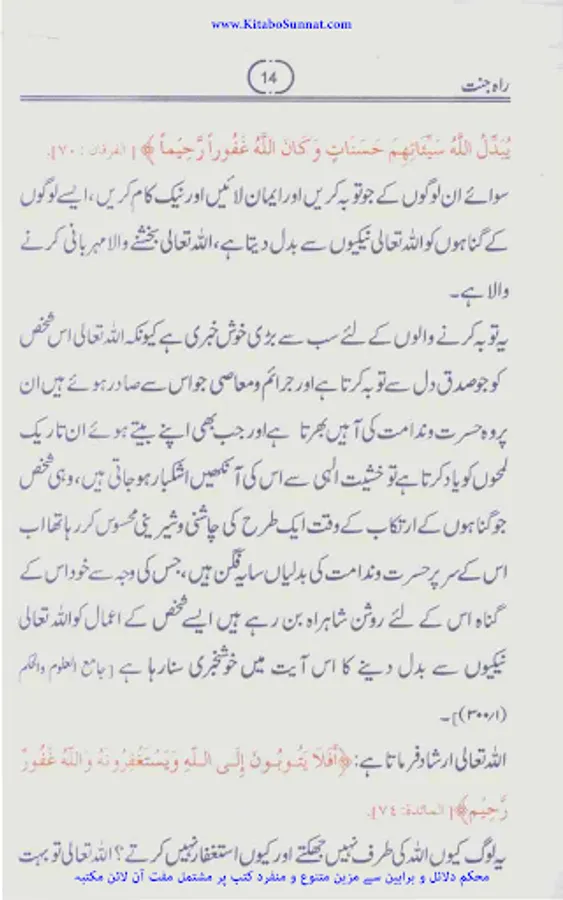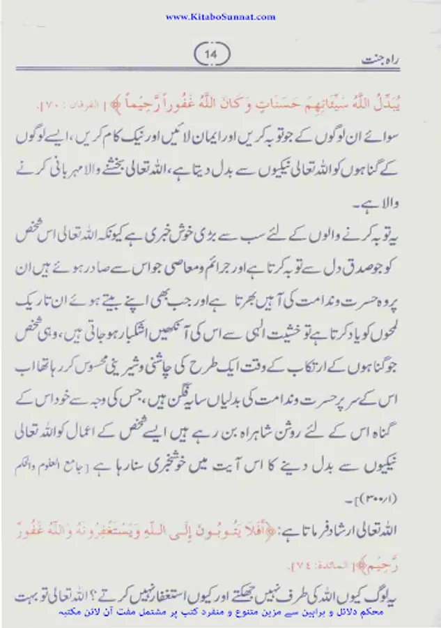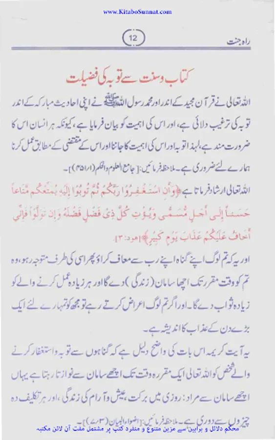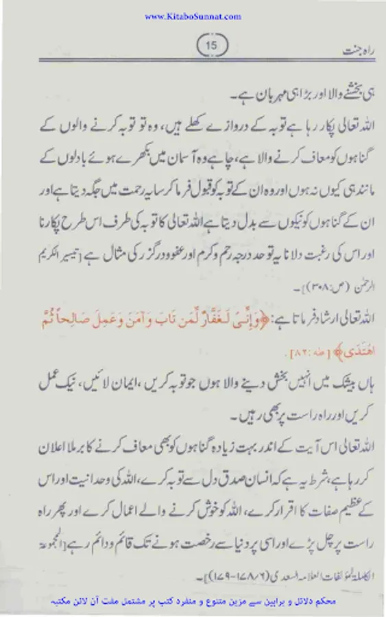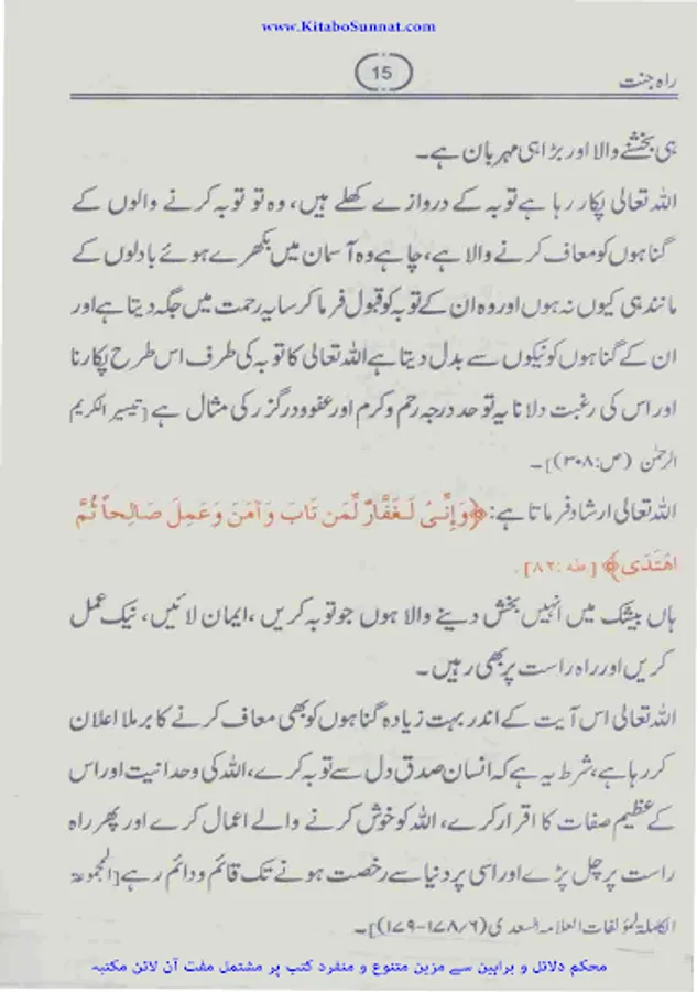 بہترین انسان وہ ہے جسے گناہ کے بعد یہ احساس ہو جائے کہ اس سے غلطی ہوگئی ہے ۔ گناہ کے بعد ایسے احساسات اور پھر توبہ کے لیے پشیمانی وندامت پر مبنی یہ عمل ایک خوش نصیب انسان کےحصہ میں آتا ہے۔ جب کہ اس جہاںمیں کئی ایسے بدنصیب سیاہ کار بھی ہیں جن کوزندگی بھر یہ احساس نہیں ہوتا کہ ان کا مالک ان سے ناراض ہوچکا ہے اور وہ ہیں کہ دن رات گناہ کرتے چلےجاتےہیں اور رات کوگہری نیند سوتے ہیں یا مزید گناہوں پر مبنی اعمال میں مصروف رہ کر گزار دیتے ہیں۔ اللہ تعالیٰ نے حضرتِ انسان پر بہت بڑا احسان کیا کہ انسان سے سرزد ہونے والے گناہوں کی معافی کے لیے ایسے نیک اعمال کی کی ترغیب دلائی ہے کہ جس کے کرنے سےانسان کے زندگی بھر کے گناہ معاف ہوجاتے ہیں۔احادیث مبارکہ میں ان اعمال کی تفصیل موجود ہے اور بعض اہل علم نے اس موضوع پر مستقل کتب بھی تصنیف کی ہیں۔زیرِ تبصرہ کتاب خاص اسی موضوع پر ہے کہ جنت کا حصول کیسے ممکن ہے؟ اور جنت کی راہیں کیسے ہموار کی جا سکتی ہیں؟ اور اس میں کتا ب وسنت سے ایسے نصوص کو جمع کرنے کی کوشش کی گئی ہے جو توبہ کی اہمیت وفضیلت کو اُجاگر کرنے پر دال ہوں۔ کتاب کا اسلوب نہایت عمدہ‘سادہ اور عام فہم ہے۔ یہ کتاب’’ راہ جنت ‘‘ عبد الہادی بن حسن الوہبی کی مرتب کردہ ہے۔آپ تصنیف وتالیف کا عمدہ شوق رکھتے ہیں‘ اس کتاب کے علاوہ آپ کی درجنوں کتب اور بھی ہیں۔ دعا ہے کہ اللہ تعالیٰ مؤلف وجملہ معاونین ومساعدین کو اجر جزیل سے نوازے اور اس کتاب کو ان کی میزان میں حسنات کا ذخیرہ بنا دے اور اس کا نفع عام فرما دے۔(آمین)( ح۔م۔ا ).