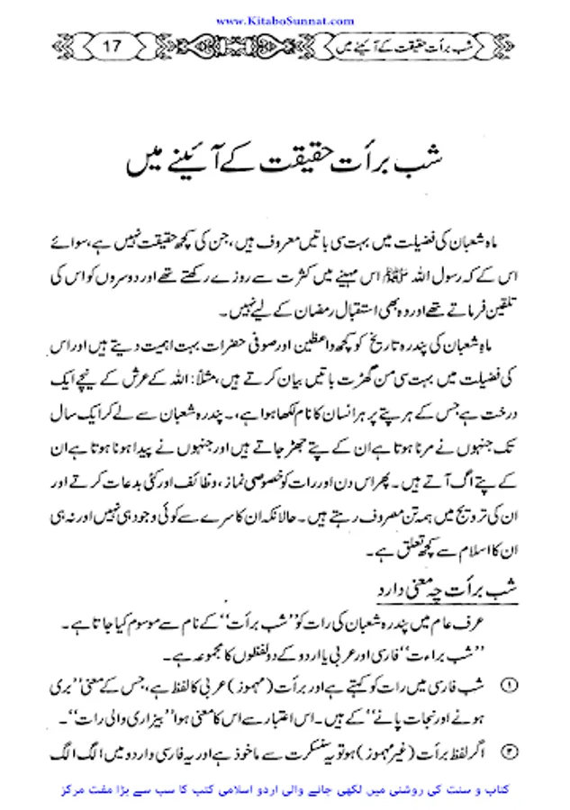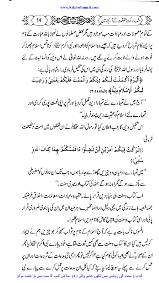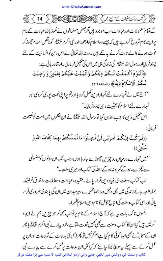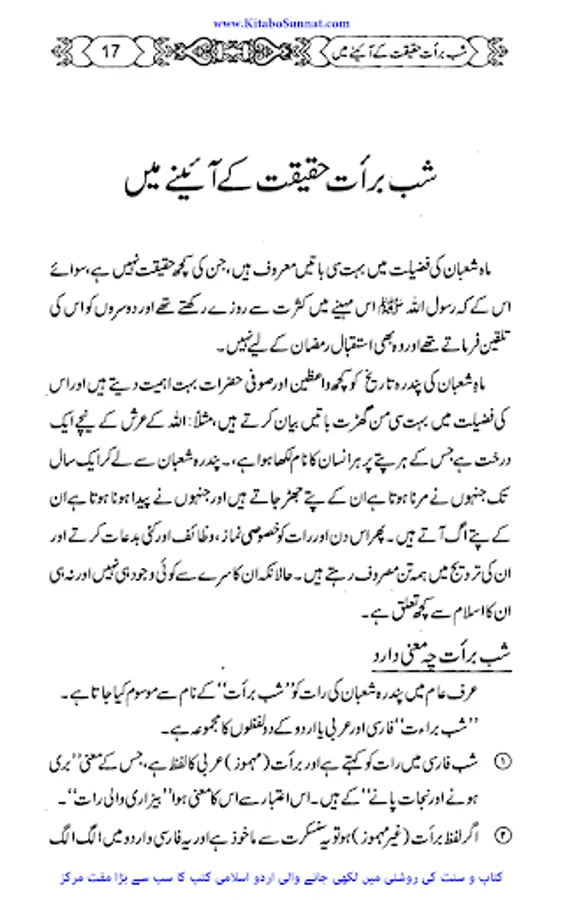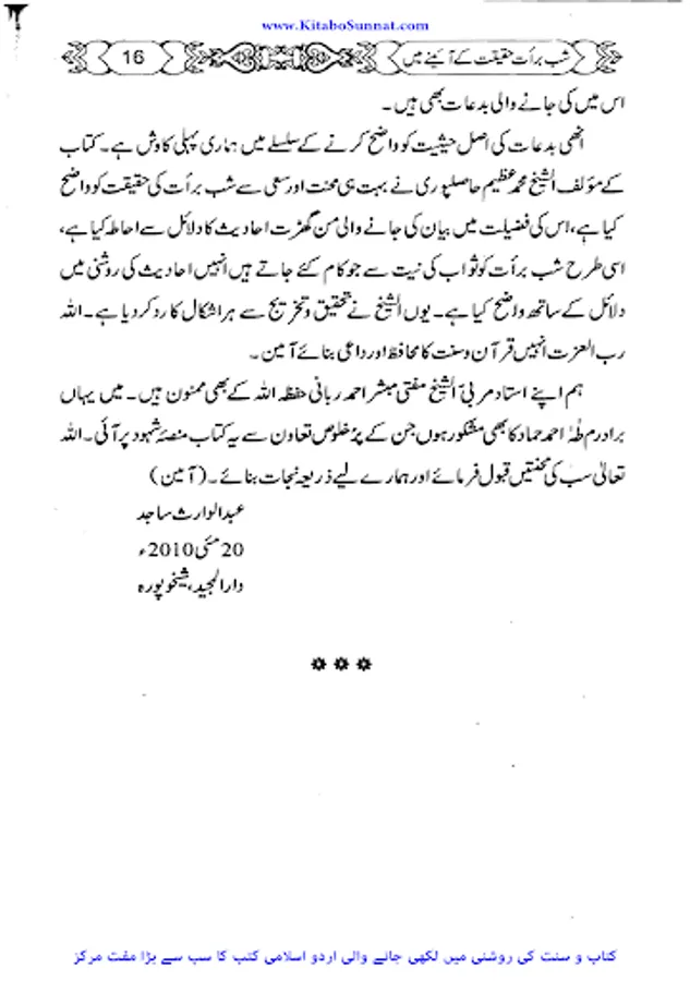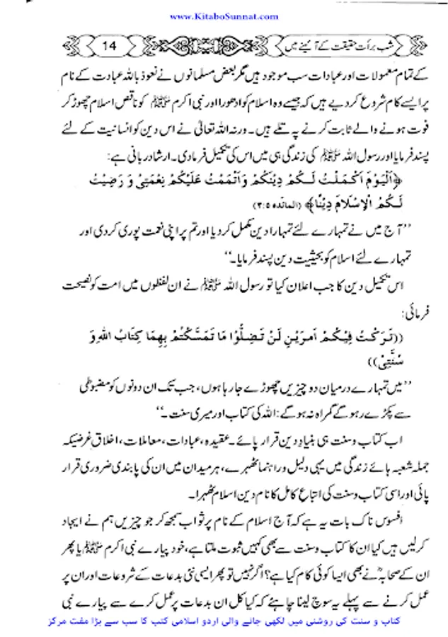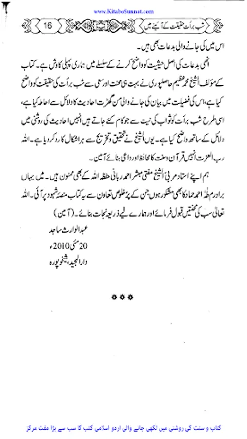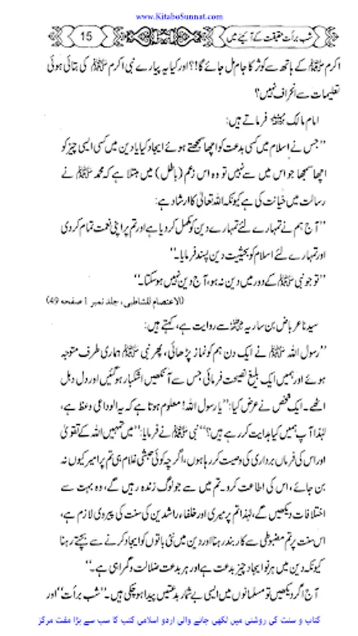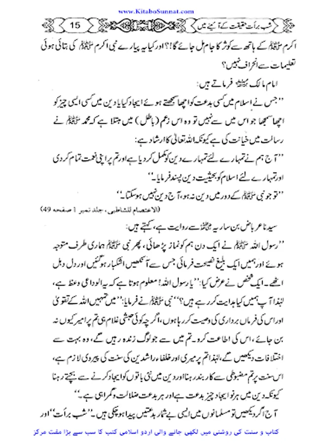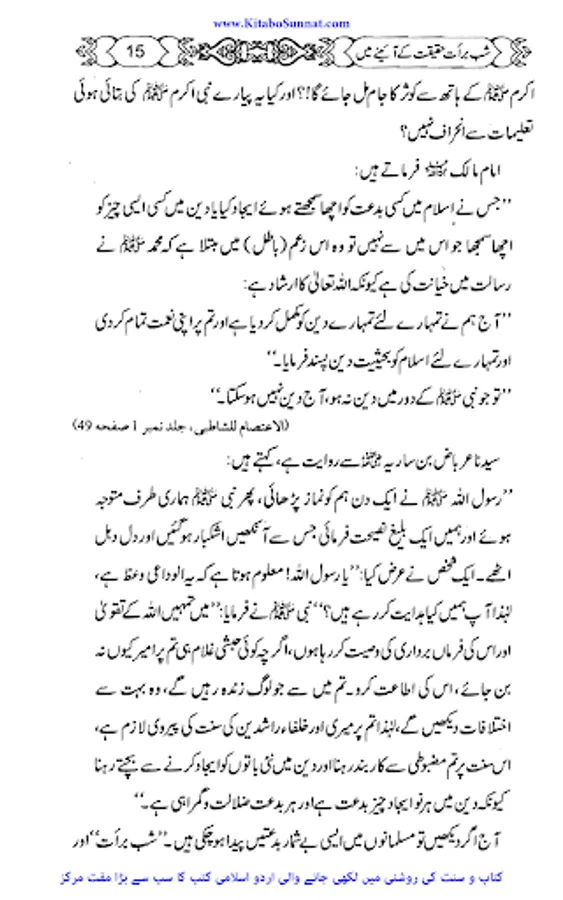 اللہ رب العزت نے اپنے بندوں کی رہنمائی کے لیے انبیاء کرام اور رسولوں کو مبعوث فرمایا جو شرک و بدعت میں ڈوبی ہوئی انسانیت کو صراط مستقیم سے ہمکنار کرتے، اللہ تعالیٰ کے احکامات کو بندوں تک پہنچاتے۔ اس سلسلہ نبوت کی آخری کڑی ختم الانبیاء حضرت محمد ﷺ ہیں۔ آپﷺ ایک داعئ انقلاب، معلم، محسن و مربی بن کر آئے۔ جس طرح آپﷺ کے فضائل و مناقب سب سے اعلیٰ اور اولیٰ ہیں اسی طرح آپ ﷺ کی امت کو بھی اللہ رب العزت نے اپنی کلام پاک میں"امت وسط" کے لقب سے نوازہ ہے۔ اسلام نے اپنی دعوت و تبلیغ اور امت کے قیام و بقاء کے لیے اساس اولین ایک اصول کو قرار دیا ہے جو"امر بالمعروف و نہی عن المنکر" کے نام سے تعبیر کیا جاتا ہے۔ دعوت الی الخیر، برائی سے روکنا اس امت کا خاصہ اور دینی فریضہ ہے۔ اسلام تو نبی اکرم ﷺ کی حیات مبارکہ میں مکمل ہو گیا تھااورانسان کی راہنمائی کے لیے اس میں تشنگی کا کوئی ایسا پہلو نہیں جس میں انسان کے لیے راہنمائی نہ ہو۔ شب و روز کی زندگی کے معمولات و عبادات سب موجود ہیں مگر مسلمانوں نے نعوذ با للہ عبادت کے نام پر ایسے کام شروع کر دیئے جیسے وہ اسلام کو ادھورہ اور شریعت محمدیہ ﷺ کو ناقص قرار دینے پر تلے ہوئے ہیں۔ زیر نظر کتاب"شب برات حقیقت کے آئینے میں"جو کہ فضیلۃ الشیخ محمد عظیم حاصلپوری کا ایک تحقیقی رسالہ ہے۔ محترم موصوف جو کہ علمی و ادبی حوالے میں ایک معتبر حیثیت کے حامل ہیں۔ فاضل مصنف نے کتاب ہذا میں شب برات کی حقیقت کا قرآن سنت کی روشنی میں تحقیقی جائزہ لیا ہے۔ اللہ تعالیٰ ان کی محنت کو شرف قبولیت سے نوازے اور محترم موصوف کو ہمت واستقامت سے نوازے۔ آمین(عمیر).