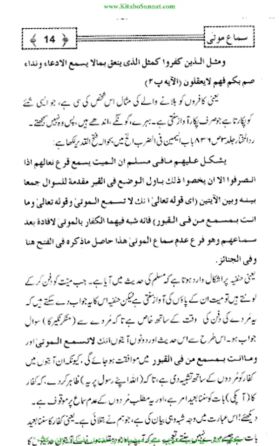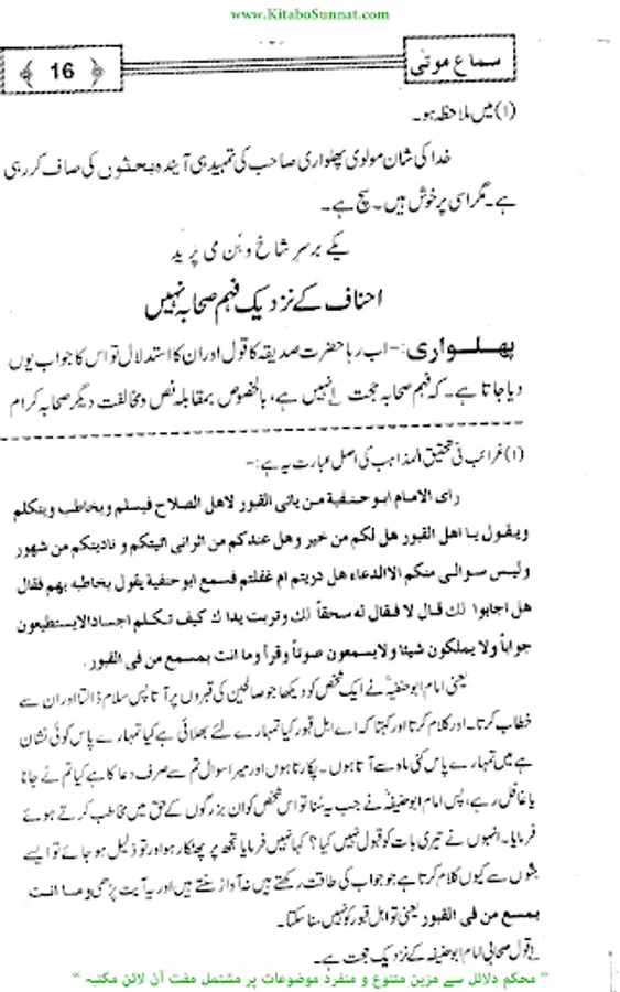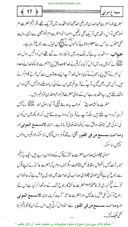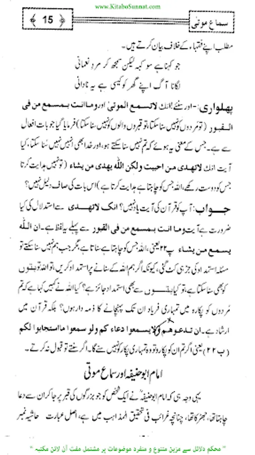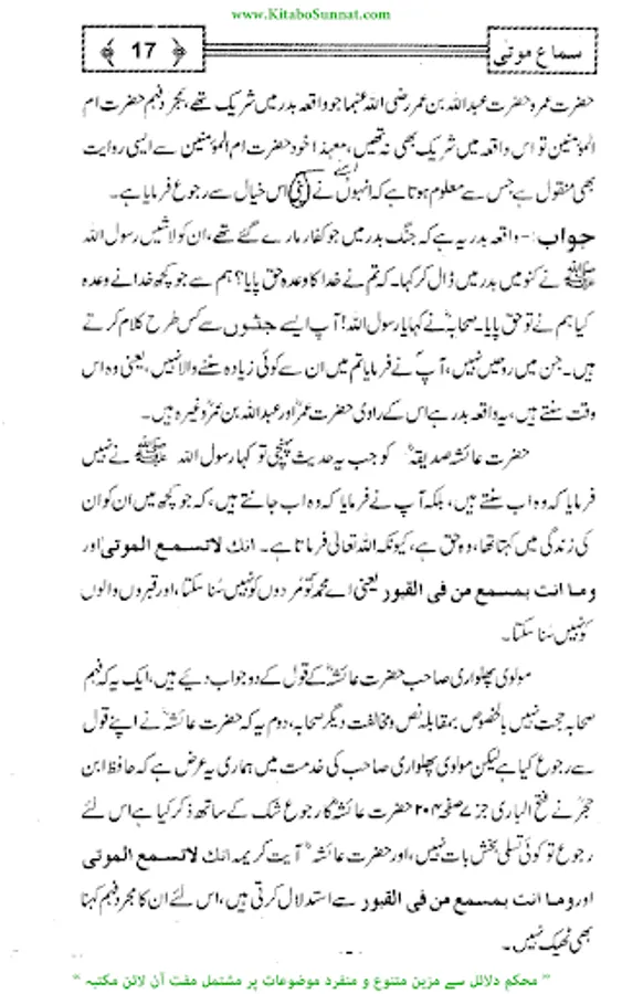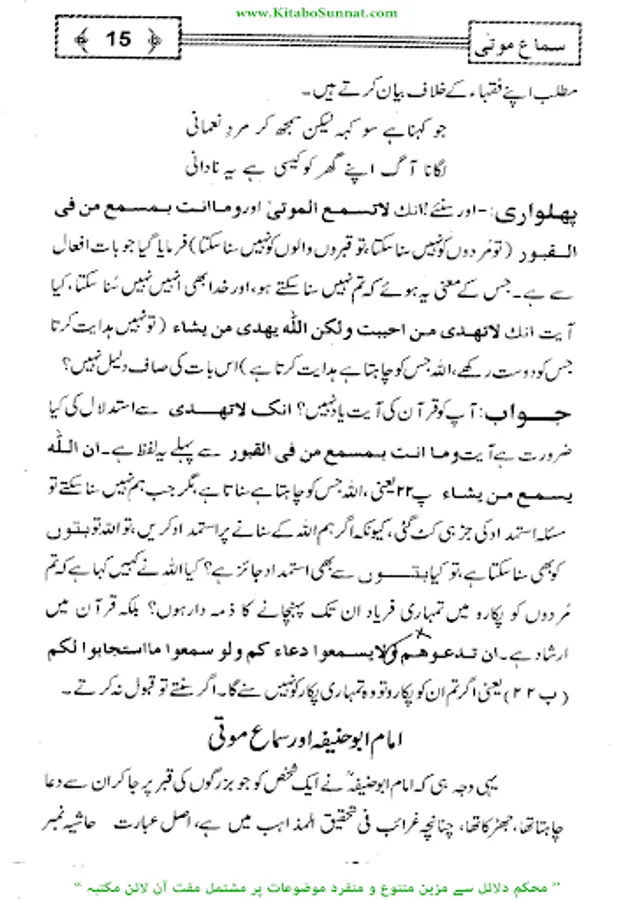 دین اسلام کی اساس عقیدہ توحید پر مبنی ہےلیکن صد افسوس کہ امت محمد یہ میں سے بہت سے لوگ مختلف انداز میں شرک جیسے قبیح فعل میں مبتلا ہیں- سماع موتٰی یعنی مُردوں کے سننے کا مسئلہ شرک کا سب سے بڑا چور دروازہ ہے۔ موجودہ دور میں یہ مسئلہ اس قدر سنگینی اختیار کر گیا ہے کہ قائلین سماع موتٰی نہ صرف مردوں کے سننے کے قائل ہیں بلکہ یہ عقیدہ بھی رکھتے ہیں کہ مردے سن کر جواب بھی دیتے ہیں اور حاجات بھی پوری کرتے ہیں۔ اﷲ تعالیٰ قرآن مجید میں فرماتے ہیں: ( فَاِنَّکَ لاَ تُسْمِعُ الْمَوْتٰی وَ لَا تُسْمِعُ الصُّمَّ الدُّعَآءَ اِذَا وَلَّوْا مُدْبِرِیْنَ )[30:الروم:52] ’’اے نبی! اور تو کوئی مردے کو کیا سنائے گا۔ آپ بھی مردوں کو نہیں سنا سکتے جیسا کہ بہروں کو نہیں سنا سکتے۔‘‘ بہرے کے کان تو ہوتے ہیں‘ لیکن سننے کی طاقت نہیں ہوتی۔ جب وہ نہیں سن سکتا تو مردہ کیا سنے گا جس میں نہ سننے کی طاقت رہی اور نہ سننے کا آلہ۔ ہاں اﷲ تعالیٰ اس حالت میں بھی اس کے ذرات کو سنا سکتا ہے۔ کسی اور کی طاقت نہیں کہ ایسا کر سکے۔ چنانچہ فرمایا: ( اِنَّ ﷲَ یُسْمِعُ مَنْ یَّشَآءُج وَ مَآ اَنْتَ بِمُسْمِعٍ مَّنْ فِی الْقُبُوْرِ)[35:الفاطر:22]’’ اﷲ تو جسے چاہے سنا دے‘ کان ہوں‘ یا نہ ہوں ‘ لیکن اے پیغمبر! آپ ان کو نہیں سنا سکتے جو قبروں میں ہیں‘‘یعنی مردہ ہیں۔ اب اس قدر وضاحت کے بعد کوئی کہہ سکتا ہے کہ مردے سنتے ہیں؟زیر تبصرہ کتاب"سماع موتی"جماعت اہل حدیث کے معروف عالم دین، جامعہ لاہور الاسلامیہ کے رئیس ڈاکٹر حافظ عبد الرحمن مدنی صاحب کے تایا جان شیخ الاسلام حافظ عبد اللہ محدث روپڑی صاحب کی تصنیف ہے، جس میں انہوں نے مستند دلائل کے ساتھ سماع موتی کے مسئلے پر روشنی ڈالی ہے۔کتاب کی تبویب وتخریج حافظ عبد الوھاب روپڑی صاحب نے فرمائی ہے۔ اللہ تعالی سے دعا کہ وہ مولف موصوف کی اس کاوش کو اپنی بارگاہ میں قبول فرمائے اور ان کے میزان حسنات میں اضافہ فرمائے۔آمین(راسخ).