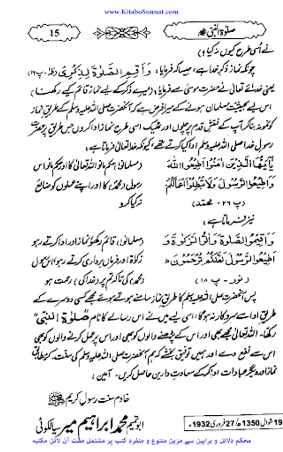 نماز انتہائی اہم ترین فریضہ اور سلام کا دوسرا رکن ِ عظیم ہے جوکہ بہت زیادہ اہمیت کا حامل ہے۔ نماز دین کاستون ہے جس نے اسے قائم کیا اس نے دین کو قائم کیا اور جس نے اسے ترک کردیا ہے اس نے دین کی عمارت کوڈھادیا۔ نماز مسلمان کے افضل اعمال میں سے ہے۔نماز ایک ایسا صاف ستھرا سرچشمہ ہے جس کےشفاف پانی سے نمازی اپنے گناہوں اور خطاؤں کودھوتا ہے ۔کلمہ توحید کے اقرار کےبعد سب سے پہلے جو فریضہ انسان پر عائد ہوتا ہے وہ نماز ہی ہے۔ اسی سے ایک مومن اور کافر میں تمیز ہوتی ہے۔ بے نماز کافر اور دائرۂ اسلام سے خارج ہے۔ قیامت کےدن اعمال میں سب سے پہلے نماز ہی سے متعلق سوال ہوگا۔ فرد ومعاشرہ کی اصلاح کے لیے نماز ازحد ضروری ہے۔ نماز فواحش ومنکرات سےانسان کو روکتی ہے ۔بچوں کی صحیح تربیت اسی وقت ممکن ہے جب ان کوبچپن ہی سےنماز کا پابند بنایا جائے۔ قرآن وحدیث میں نماز کو بر وقت اور باجماعت اداکرنے کی بہت زیاد ہ تلقین کی گئی ہے۔ اور نمازکی عدم ادائیگی پر وعید کی گئی ہے۔ نماز کی ادائیگی اور اس کی اہمیت اور فضلیت اس قد ر اہم ہے کہ سفر وحضر اور میدان ِجنگ اور بیماری میں بھی نماز ادا کرنا ضروری ہے۔ نماز کی اہمیت وفضیلت کے متعلق بے شمار احادیث ذخیرۂ حدیث میں موجود ہیں او ر بیسیوں اہل علم نے مختلف انداز میں اس موضوع پر کتب تالیف کی ہیں۔ نماز کی ادائیگی کا طریقہ جاننا ہر مسلمان مرد وزن کےلیے ازحد ضروری ہے کیونکہ اللہ عزوجل کے ہاں وہی نماز قابل قبول ہوگی جو رسول اللہﷺ کے طریقے کے مطابق ادا کی جائے گی۔ او ر ہمارے لیے نبی اکرم ﷺکی ذات گرامی ہی اسوۂ حسنہ ہے۔ انہیں کے طریقے کےمطابق نماز ادا کی جائے گئی تو اللہ کے ہاں مقبول ہے۔ اسی لیے آپ ﷺ نے فرمایا صلو كما رأيتموني اصلي لہذا ہر مسلمان کےلیے رسول للہ ﷺ کے طریقۂ نماز کو جاننا بہت ضروری ہے۔ زیر تبصرہ کتا ب’’صلوٰۃ النبی ﷺ‘‘ امام العصر مولانا حافظ محمدابراہیم سیالکوٹی کی نماز کے موضوع پر ایک مختصر مگر جامع کتاب ہے۔ اس کتاب میں انہوں نے فلسفہ واسرار نماز کے سلسلے میں بہت ہی مفید باتیں جمع کردی ہیں۔ اللہ تعالیٰ مولانا ابراہیم میر سیالکوٹی کی مرقد کو جنت کا باغ بنائے اور انہیں جنت الفردوس میں اعلیٰ مقام عطا فرمائے۔ (آمین).