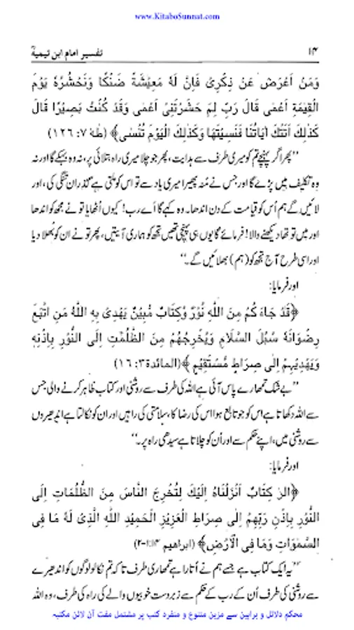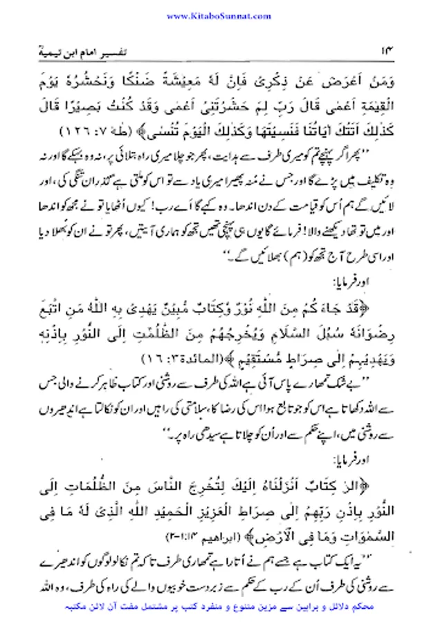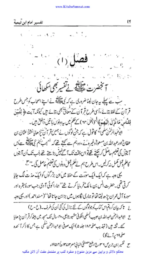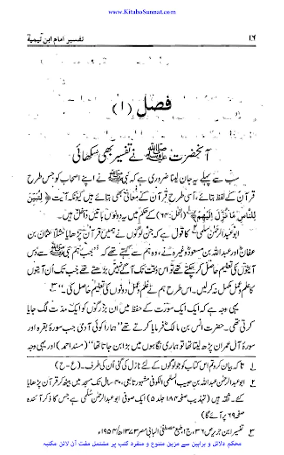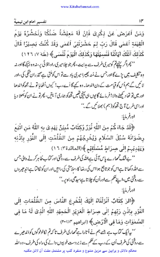 شیخ الاسلام والمسلمین امام ابن تیمیہ (661۔728ھ) کی شخصیت محتاجِ تعارف نہیں۔ آپ ساتویں صدی ہجری کی عظیم شخصیت تھے، آپ بہ یک وقت مفکر بھی تھے اور مجاہد بھی، آپ نے جس طر ح اپنے قلم سے باطل کی سرکوبی کی۔ اسی طرح اپنی تلوار کو بھی ان کے خلاف خو ب استعمال کیا۔ او رباطل افکار وخیالات کے خلاف ہردم سرگرم عمل او رمستعد رہے جن کے علمی کارہائے نمایاں کے اثرات آج بھی پوری آب وتاب سے موجود ہیں۔آپ نے اپنی پوری زندگی دین اسلام کی نشرواشاعت، کتاب وسنت کی ترویج وترقی اور شرک وبدعت کی تردید وتوضیح میں بسرکی ۔امام صاحب علوم اسلامیہ کا بحر ذخار تھے اور تمام علوم وفنون پر مکمل دسترس اور مجتہدانہ بصیرت رکھتے تھے۔آپ نے ہر علم کا مطالعہ کیا اور اسے قرآن وحدیث کے معیار پر جانچ کر اس کی قدر وقیمت کا صحیح تعین کیا۔تفسیر، حدیث، فقہ، علم فقہ، علم کلام، منطق، فلسلفہ، مذاہب وفرق اورعربی زبان وادب کاگوشہ ایسا نہیں ہے جس پر آب نےگراں قدر علمی سرمایہ نہ چھوڑا ہو۔ آپ نے مختلف موضوعات پر 500 سے زائد کتابیں لکھیں۔ آپ کا فتاوی ٰ 37 ضخیم جلد وں میں مشتمل ہے۔شیخ الاسلام کو قرآن سے گہرا لگاؤ تھا۔ فتاوی کی 37 جلدوں میں سے جلد 15،16،17 قرآن مجید کی مختلف آیات وسور کی تفسیر پر مشتمل ہیں ۔تفسیرآیت کریمہ ، تفسیر سورت اخلاص، تفسیرمعوذتین الگ کتابی صورت میں شائع ہوئی ہیں۔ زیر تبصرہ کتاب ’’تفسیر امام ابن تیمیہ‘‘ شیخ الاسلام ابن تیمیہ کے تفسیری اجزاء پر مشتمل ہے ۔اس مجموعہ میں اصول تفسیر، تفسیر آیت کریمہ، تفسیر سورۃ الکوثر، تفسیر سورۂ اخلاص، تفسیر سورۃ الفلق والناس کے نام سے شیخ الاسلام امام ابن تیمیہ کے تفسیری اجزاء شامل ہیں۔ ان سب اجزاء کاترجمہ مولانا عبدالرزاق ملیح آبادی، مولاناعبدالرحیم پشاوری، اور مولانا غلام ربانی نے کیا ہے۔ اصول تفسیر پر گراں قدر اور مفید حواشی مولانا محمد عطاء اللہ حنیف بھوجیانی کےقلم سے ہیں۔ شیخ الاسلام کے یہ تفسیری اجزاء اگرچہ اس پہلے الگ الگ شائع ہوئے ہیں لیکن مولانا رفیق اخمد رئیس سلفی نے ان کو ایک جگہ مرتب کر کے ان کی نظر ثانی کہ ہے۔ اور ان کی قدیم اردو کو سنوارنے کے ساتھ ساتھ آیات قرآنی کے مکمل حوالہ جات لگادئیے ہیں۔ (م۔ا).