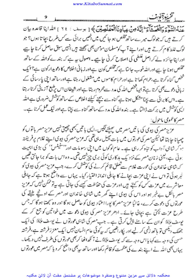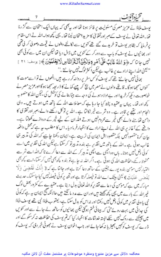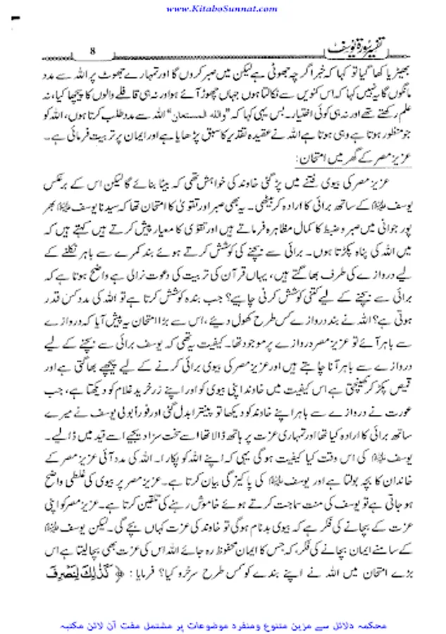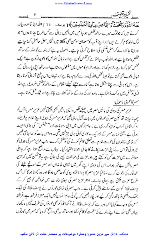 سورہ یوسف قرآن مجید کی وہ واحد سورہ ہے جو اپنے اسلوب بیاں، ترتیب بیاں اور حسن بیاں میں باقی سے منفرد اور نمایاں ہے۔ پوری سورہ مبارکہ کا مضمون سیدنا یوسف ؑ کی سیرت کے نہایت اجلے پہلو، عفت و عصمت اور پاکیزہ سیرت و کردار پر مشتمل ہے۔عصر حاضر میں جس طرح عفت و عصمت اورسیرت و کردار کو ثانوی حیثیت دے کر عریانی ، فحاشی، بداخلاقی اور حیا باختگی کا چلن عام کیا جارہا ہے۔ میڈیا کی یلغار سے جس طرح گھر اور بازار کا فرق مٹ رہا ہے اور جس طرح سے اخلاقیات پامال ہور ہی ہیں تو ان حالات میں لازم تھا کہ پورے مسلم معاشرے کو بالعموم اور کارکنان دعوت و جہاد کو بالخصوص اس شیطانی یلغار کے مقابل تحفظ سیرت و کردار کے لیے قرآنی رہنمائی سے مسلح کیا جائے۔سورہ یوسف اس سلسلے میں بہترین انتخاب ہے کہ جس میں نہایت وضاحت سے بتا دیا گیا کہ سیدنا یوسف علیہ السلام نے کس جرات اطوار اور کس پختگی کردار سے پرکشش دعوت گناہ کو ٹھکرادیا۔مؤلف کتاب جناب پروفیسر حافظ محمد سعید صاحب کی شخصیت محتاج تعارف نہیں آپ عصر حاضر کی ایک معروف جہادی تنظیم کے امیر ہیں ۔ چنانچہ زیرنظر کتاب ان کے مختلف دروس کا مجموعہ ہیں جو انہوں نے تحریک کی تربیت گاہوں میں ارشاد فرمائے تھے۔اللہ ان کے علم و عمل میں برکت عطافرمائے۔ آمین۔(ع۔ح).